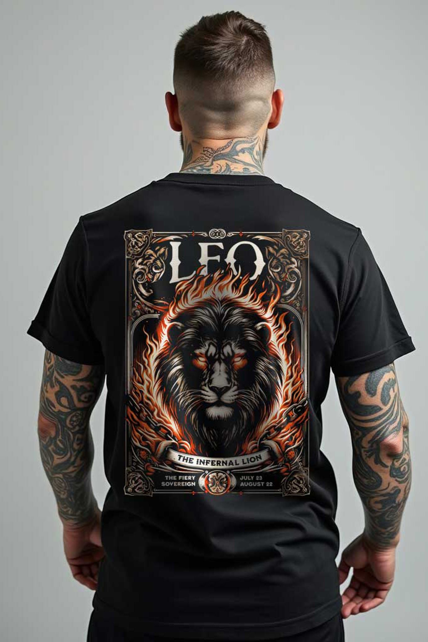 Denna kraftfulla T-shirt är skräddarsydd för dig som är född i stjärntecknet Lejonet. Med "LEO" tryckt i stora bokstäver över bröstet och ett eldigt motiv av ett majestätiskt lejon på ryggen utstrålar tröjan styrka, passion och självförtroende – precis som en äkta Lejon.
