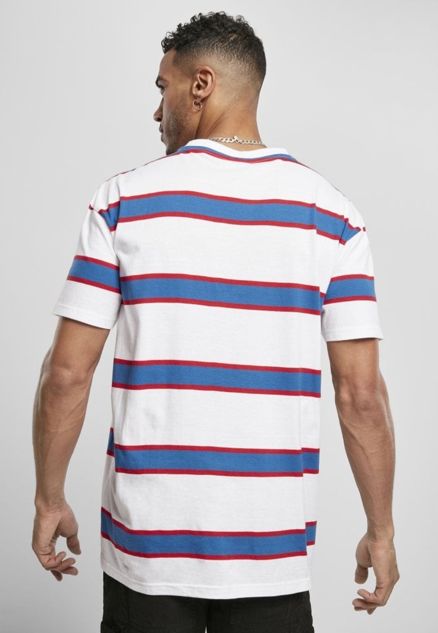 A T-shirt with large stripes in three colors. The stripes provide contrast to each other on the T-shirt.