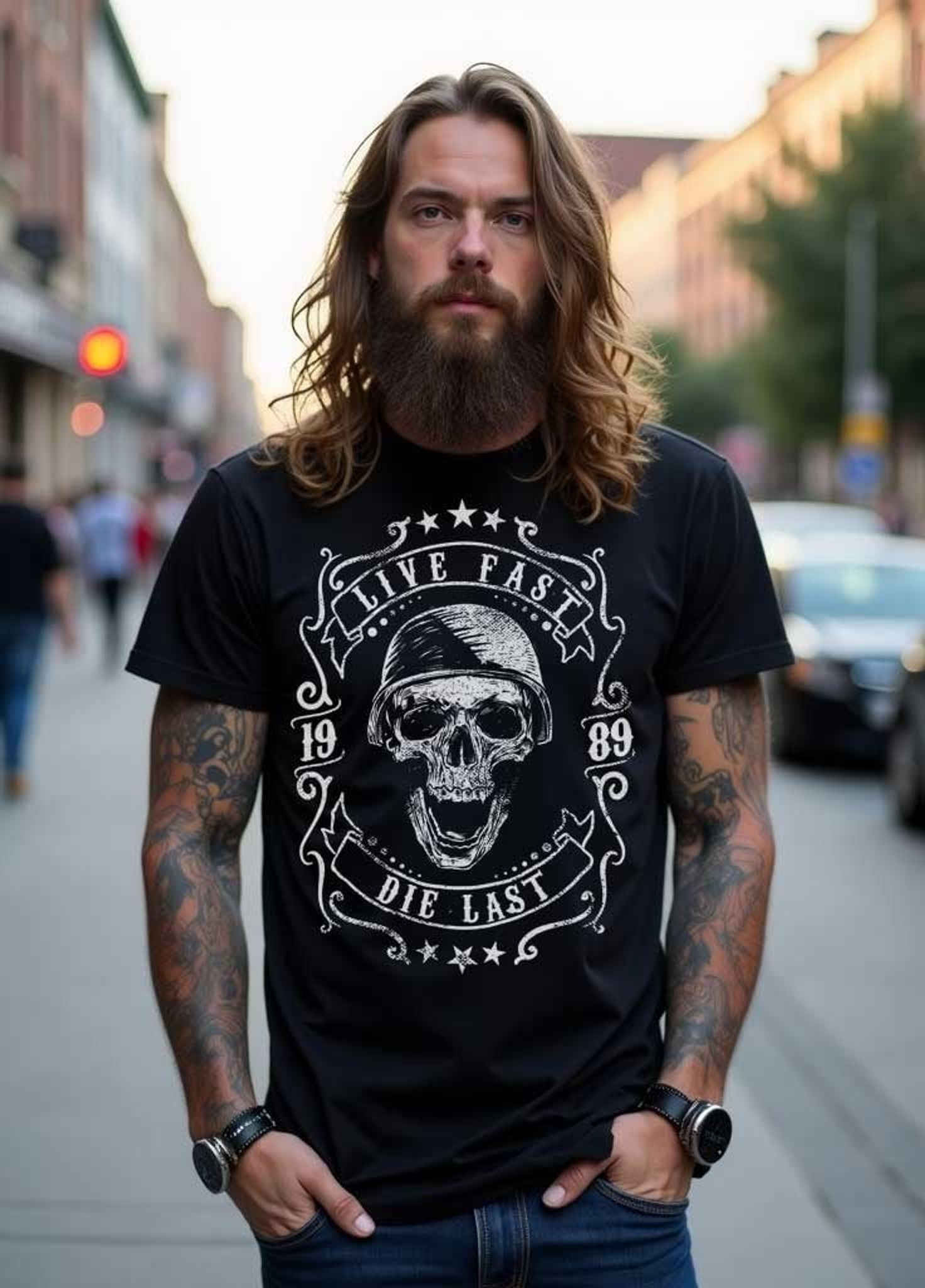 This bold black T-shirt with its eye-catching print is a must-have for anyone who wants to express a "live fast, die last" attitude. At the center of the design is a detailed skull, surrounded by the timeless phrase 'LIVE FAST DIE LAST', and complemented by the year '1989', giving the design a vintage feel.