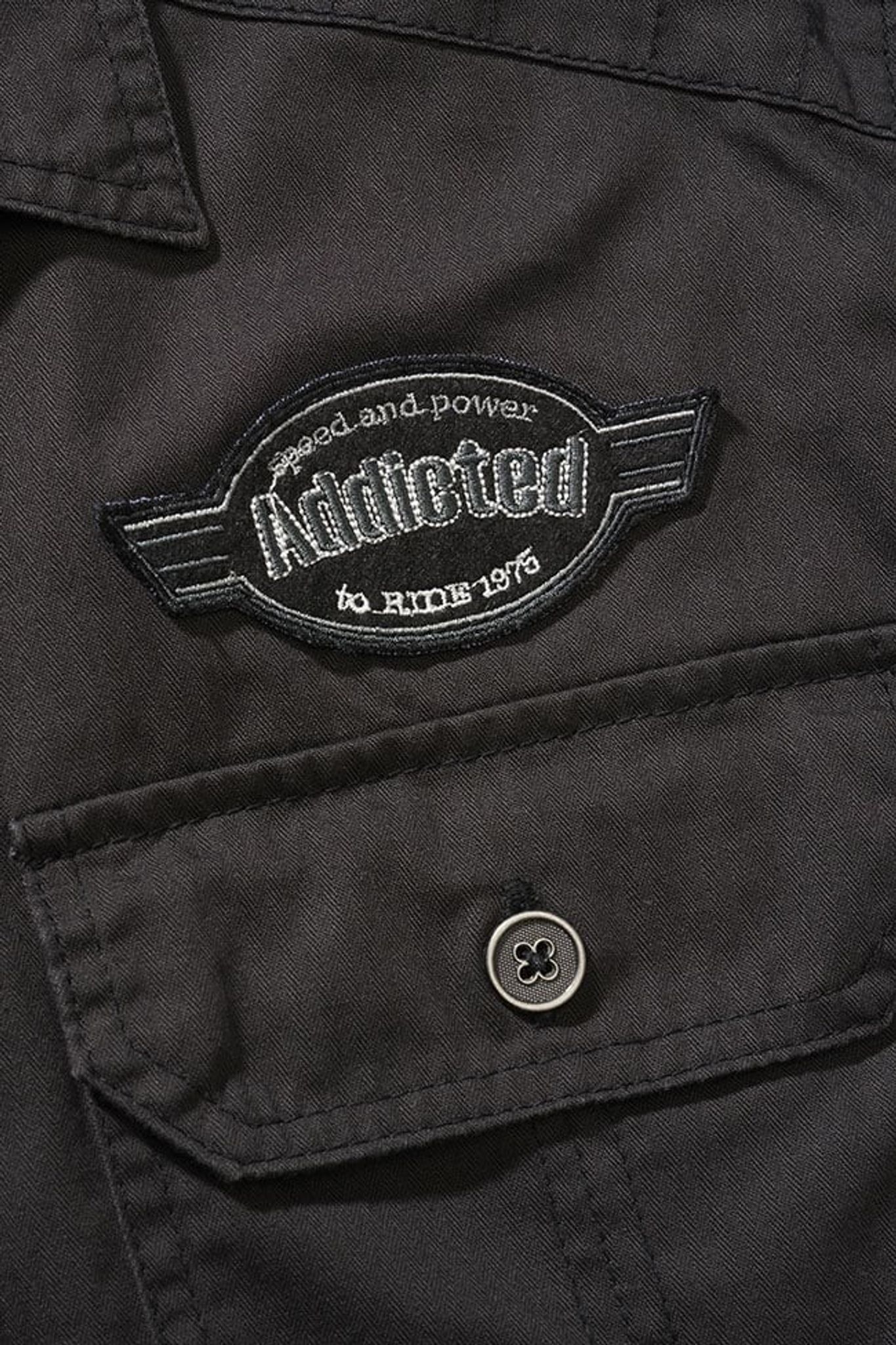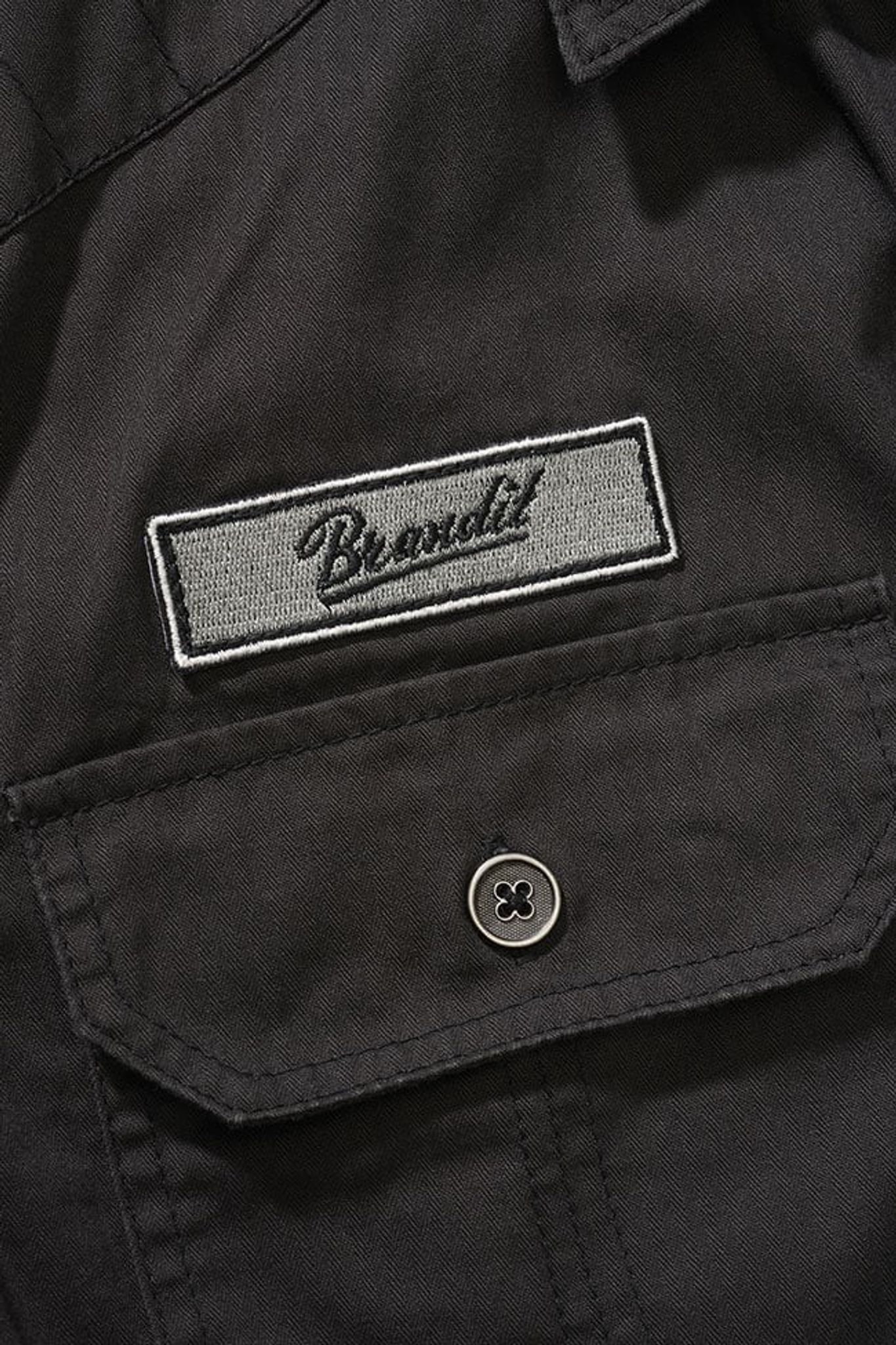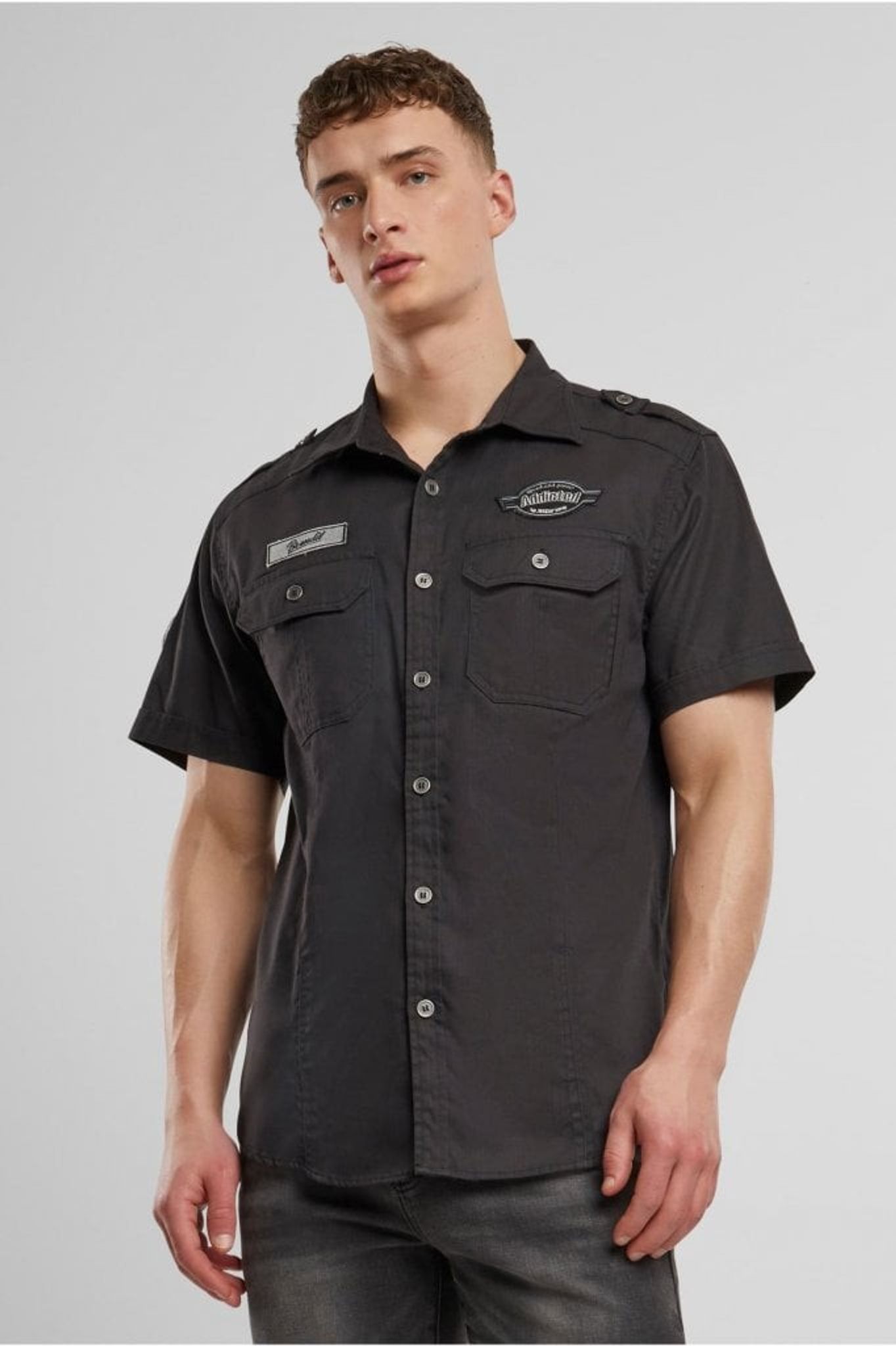 Luis vintage shirt from Brandit in short-sleeved version. A black lightly washed fabric with three patches neatly sewn on the chest and sleeves. Under the patches on the chest, there are two spacious chest pockets.