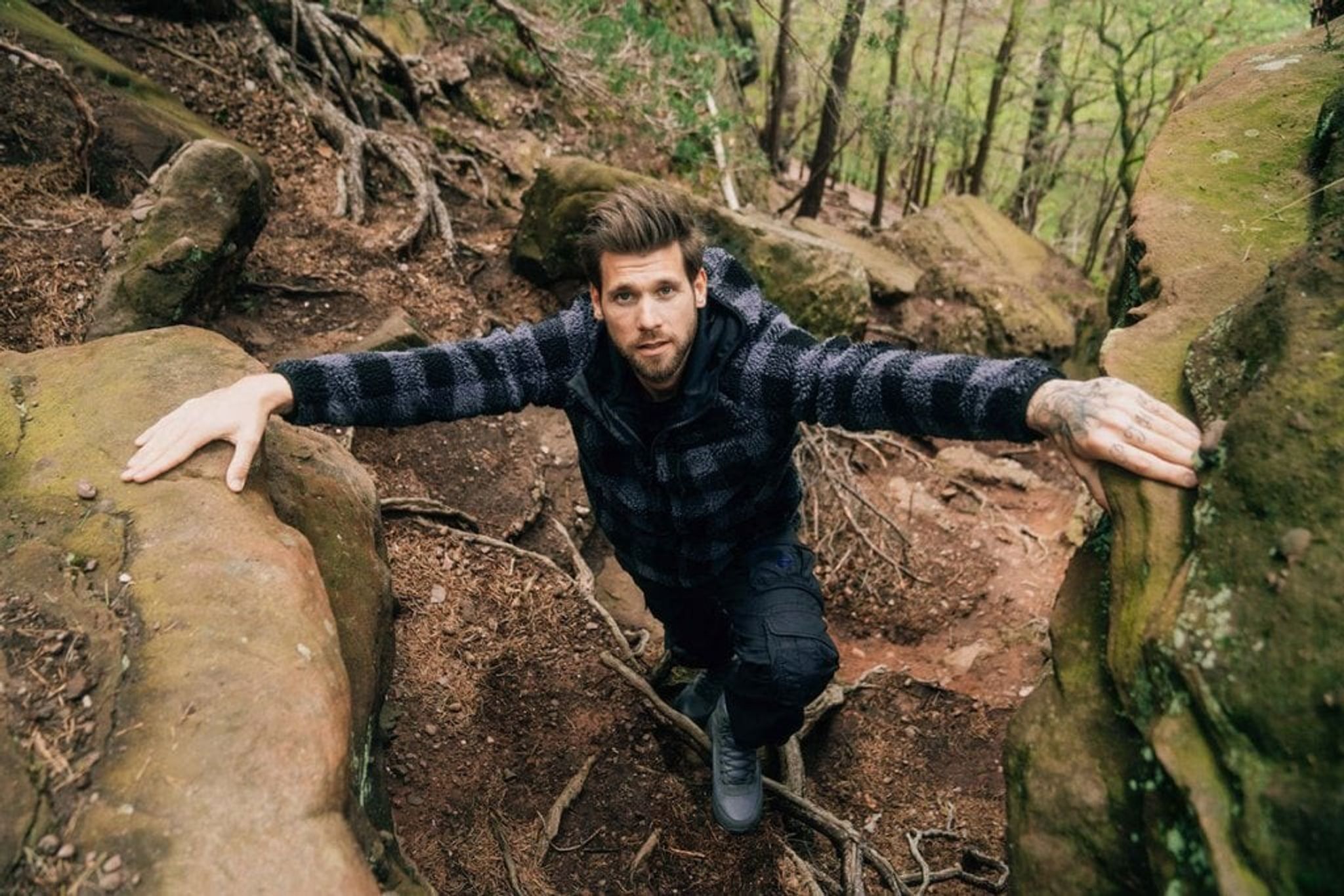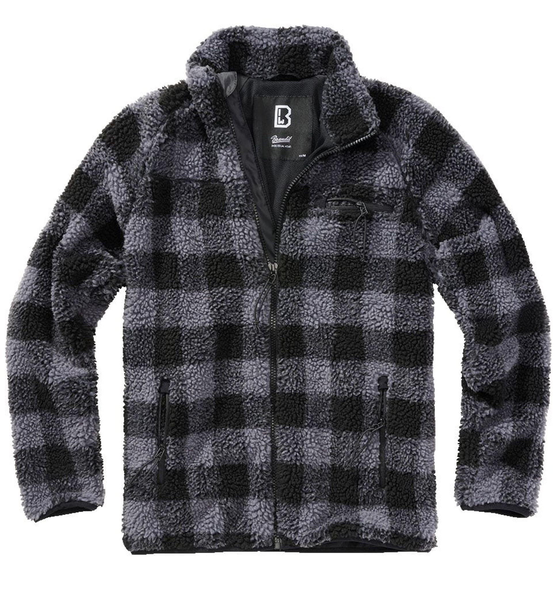 A comfortable teddy jacket with a lumberjack style on the teddy fur pattern. The jacket is equipped with a chest pocket and two side pockets, all of which close with a zipper.