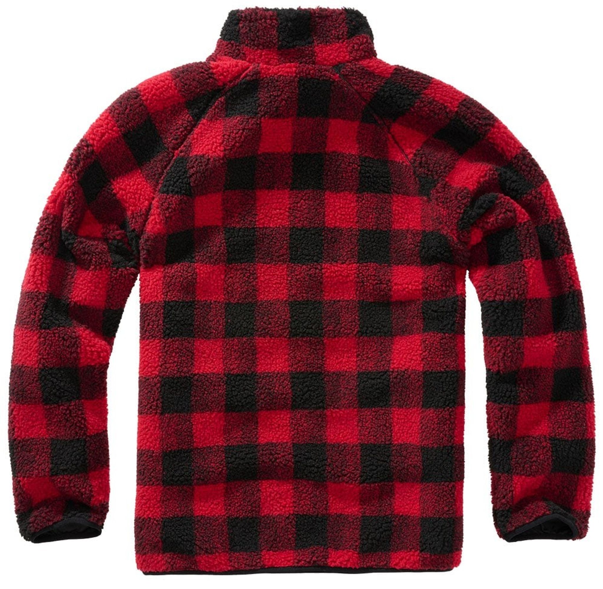 A teddy fleece pullover jacket with a lumberjack look with its flannel shirt pattern. The jacket has a high neck with storm protection.