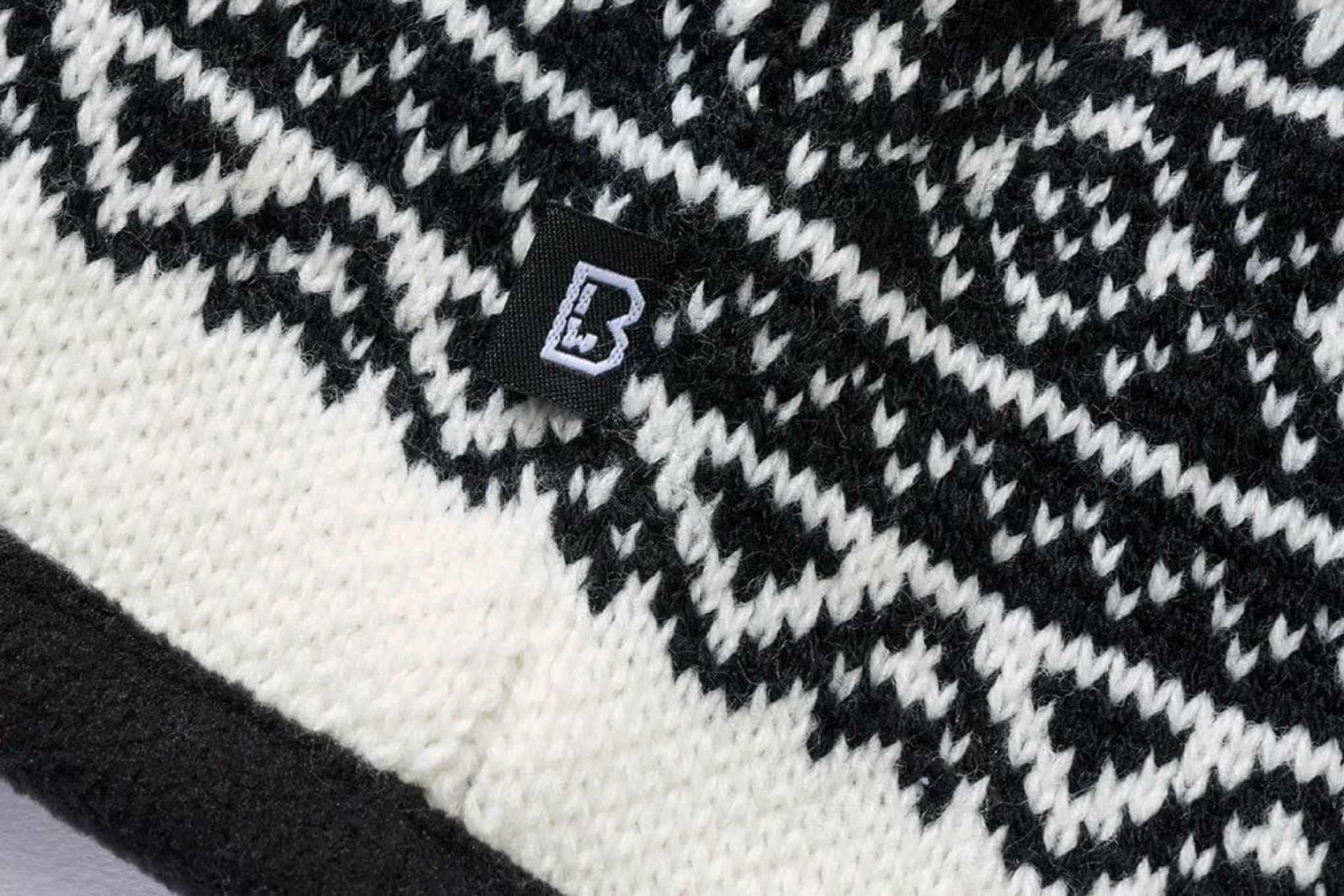 A knitted hat with a white background and a pattern in black. The pattern has been inspired by the classic lice cardigans.
