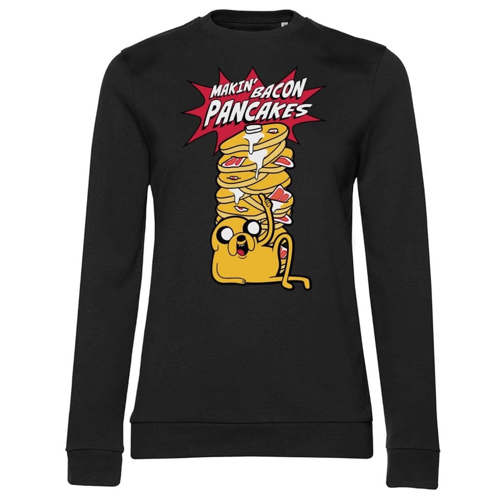 This subject serves a yummy visual of pop culture and breakfast fantasies. An enthusiastic yellow, four -legged figure with distinctive ears and big eyes, which we can recognize from "Adventure Time", sits proudly on top of an impressive pile of pancakes, seasoned with slices of bacon and butter clicks. The words "Makin 'Bacon Pancakes" explodes out of a speech bubble, in a style that brings to mind classic comic books. It is a quote that is both an actual recommendation and a metaphorical call for adventure - because when it comes to adventure, why not start with breakfast? It is a picture that attracts a smile and a sprouting stomach with the viewer.