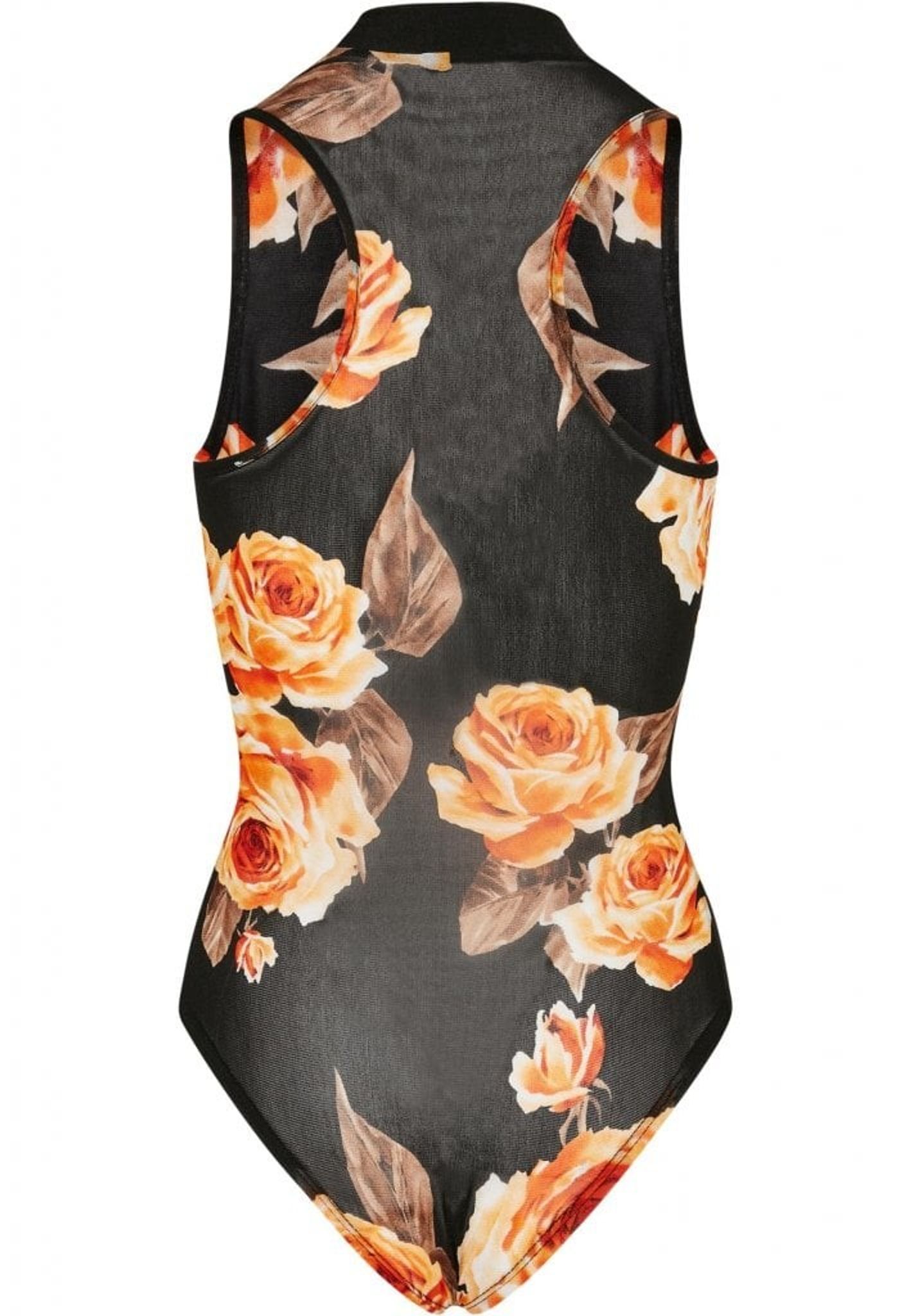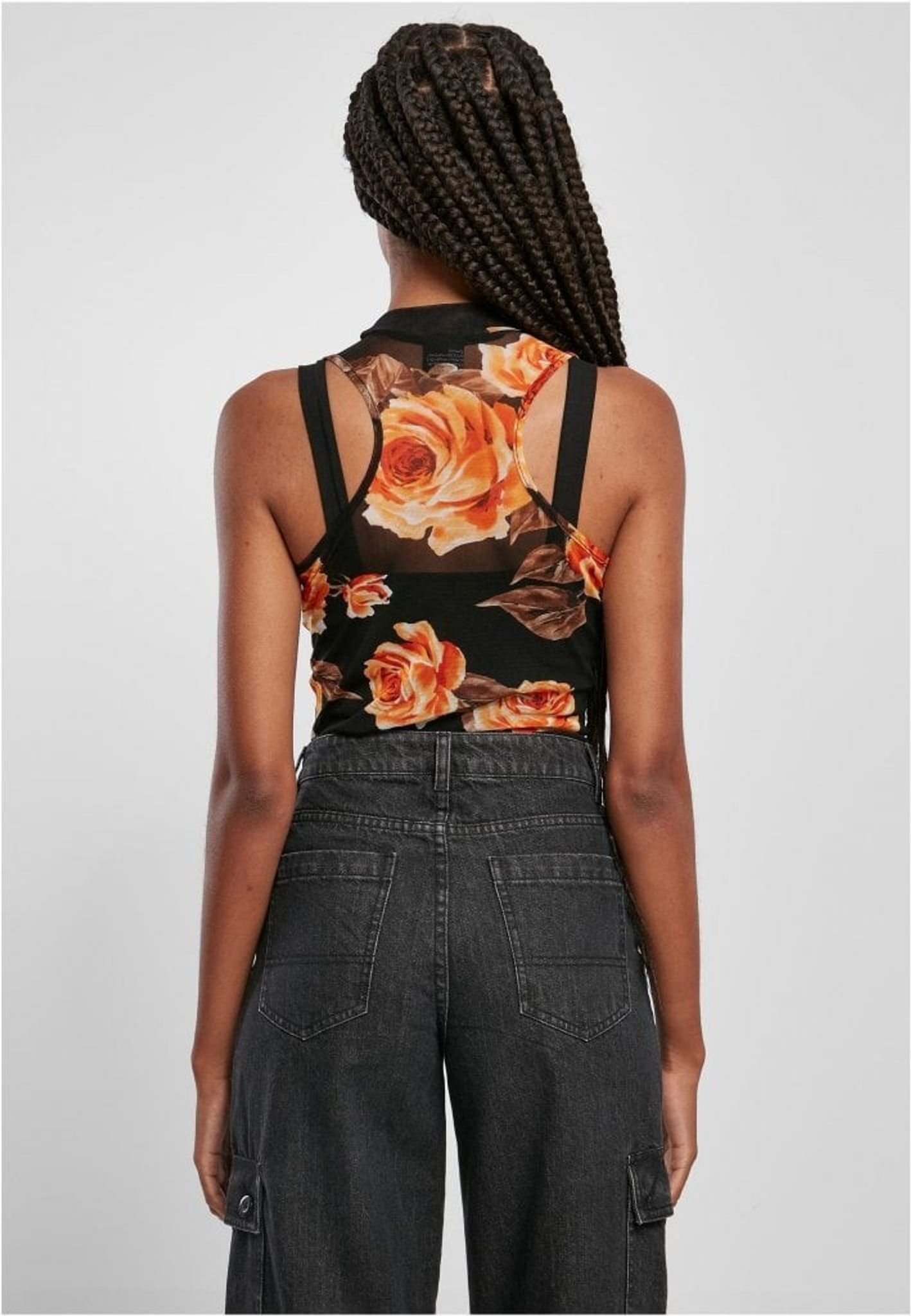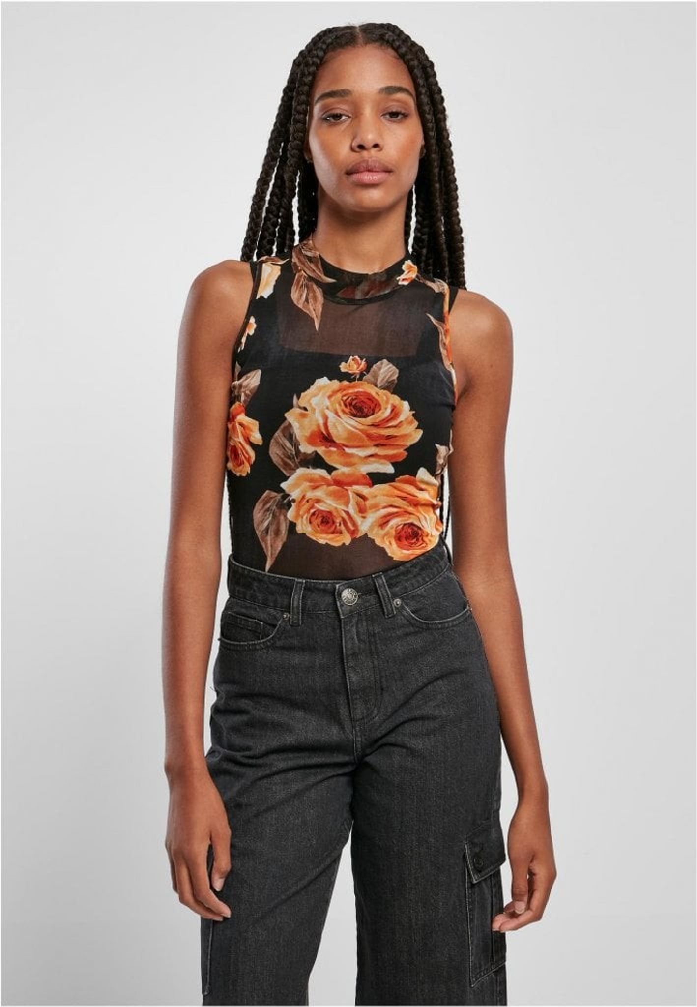 A tough sleeveless body with black transparent mesh fabric with orange roses printed on the fabric.