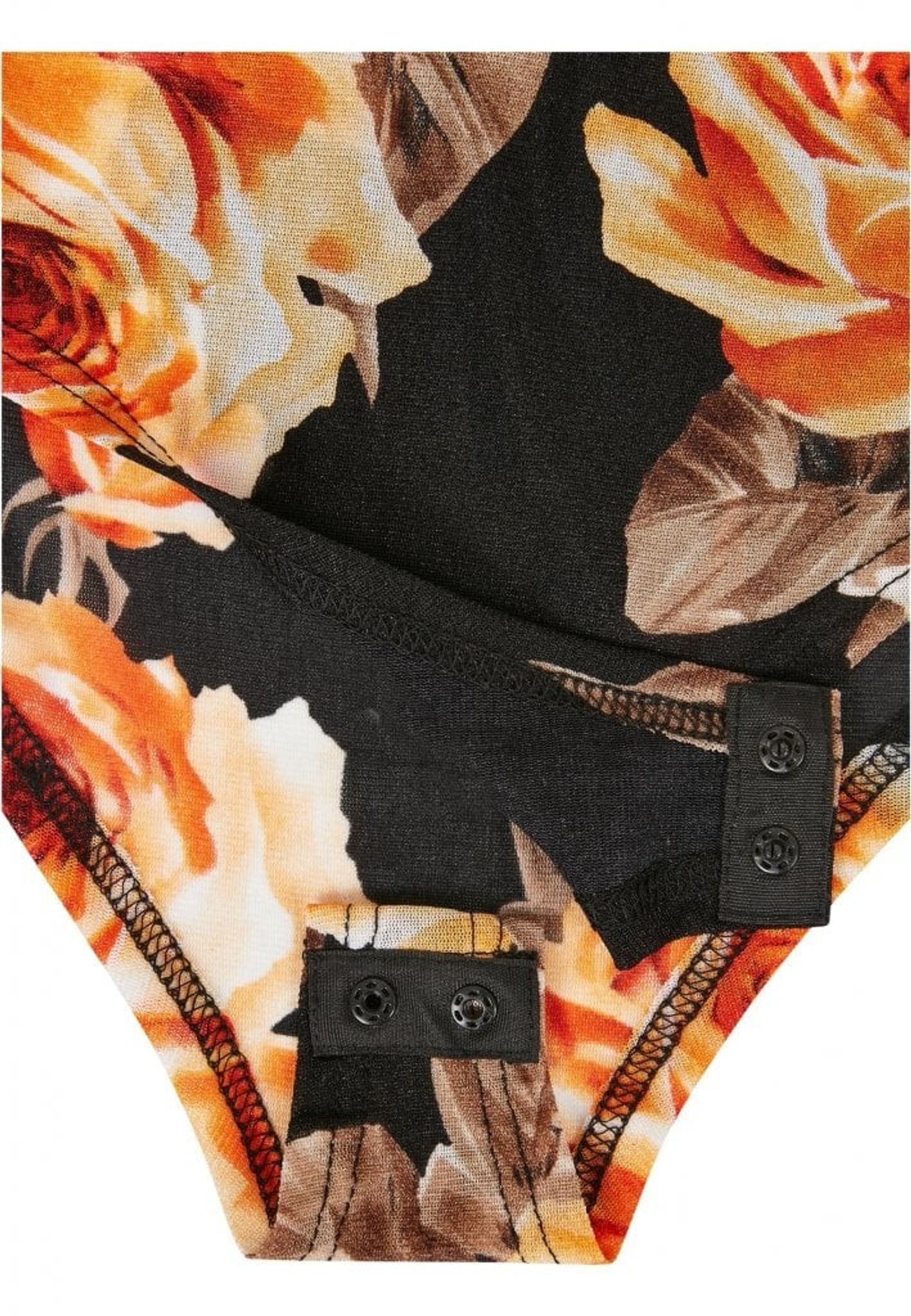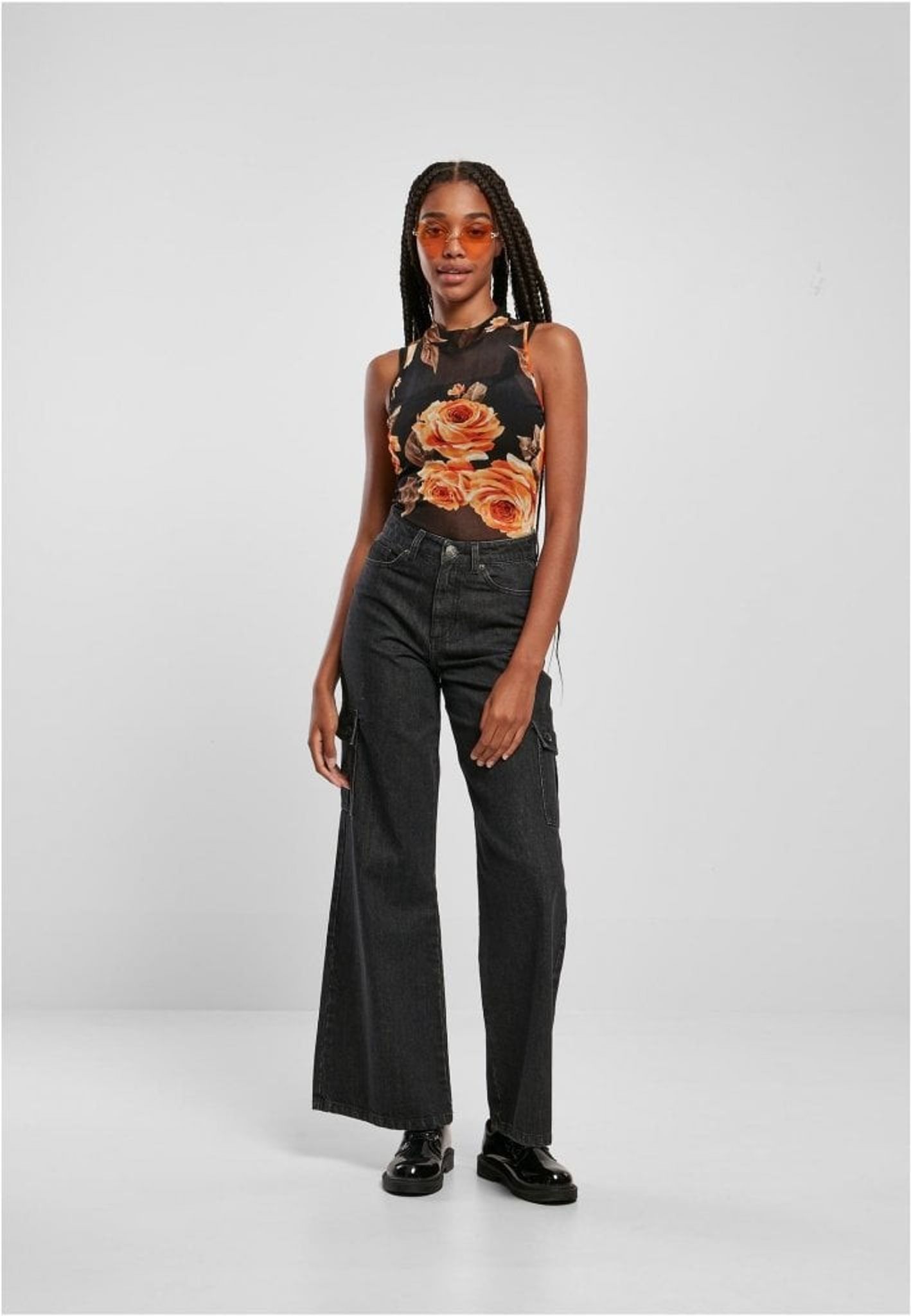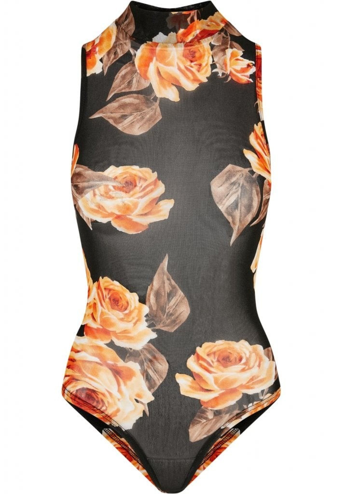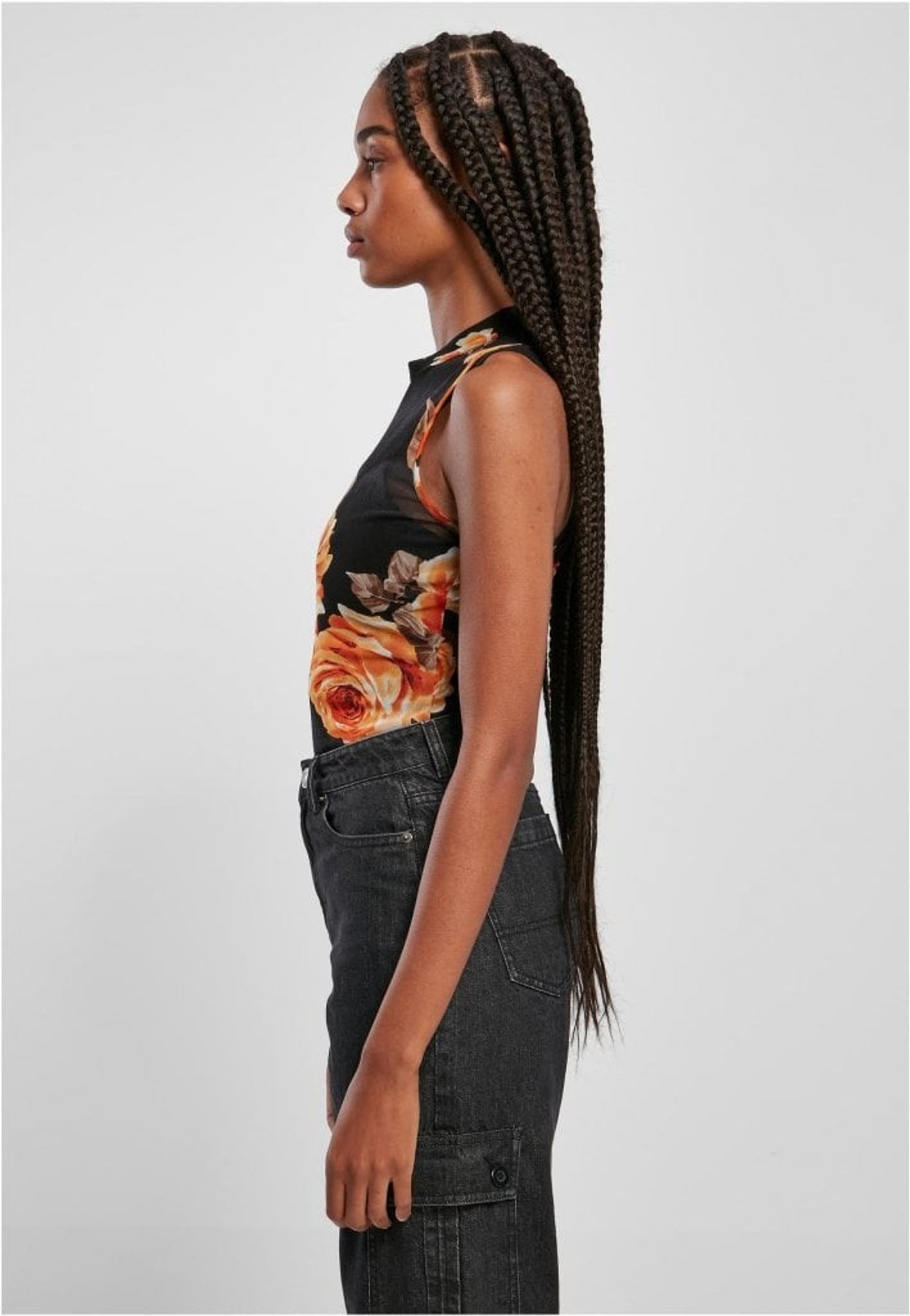A tough sleeveless body with black transparent mesh fabric with orange roses printed on the fabric.