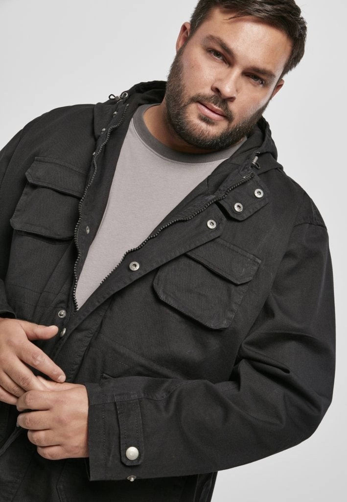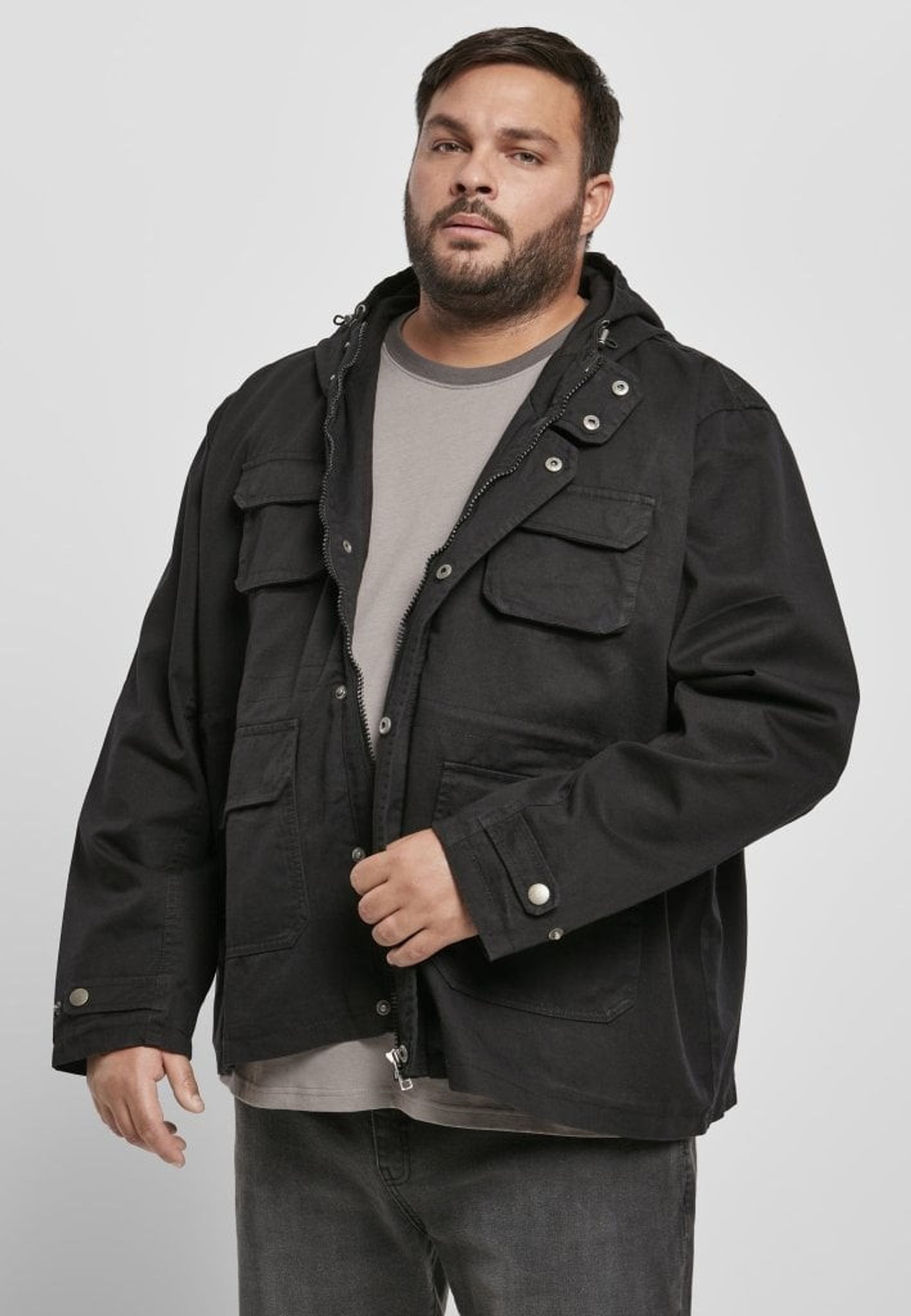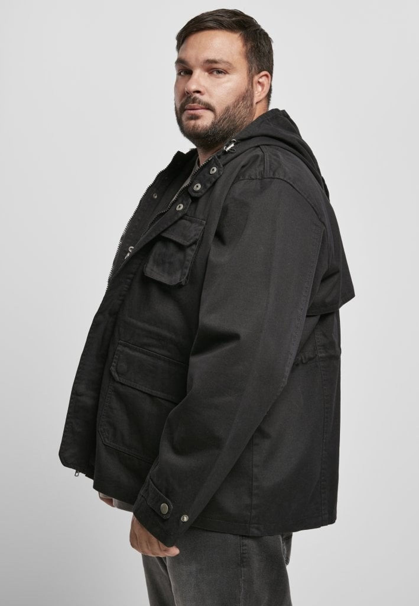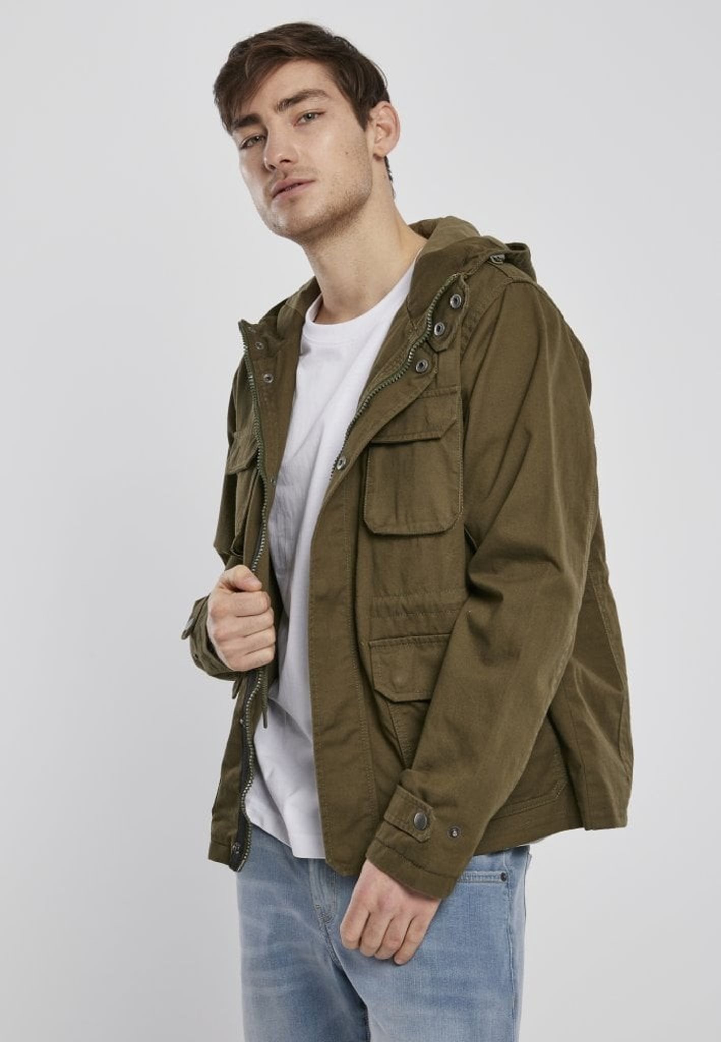 The jacket has a hood that can be adjusted and the jacket is opened with a zipper and push buttons at the front.