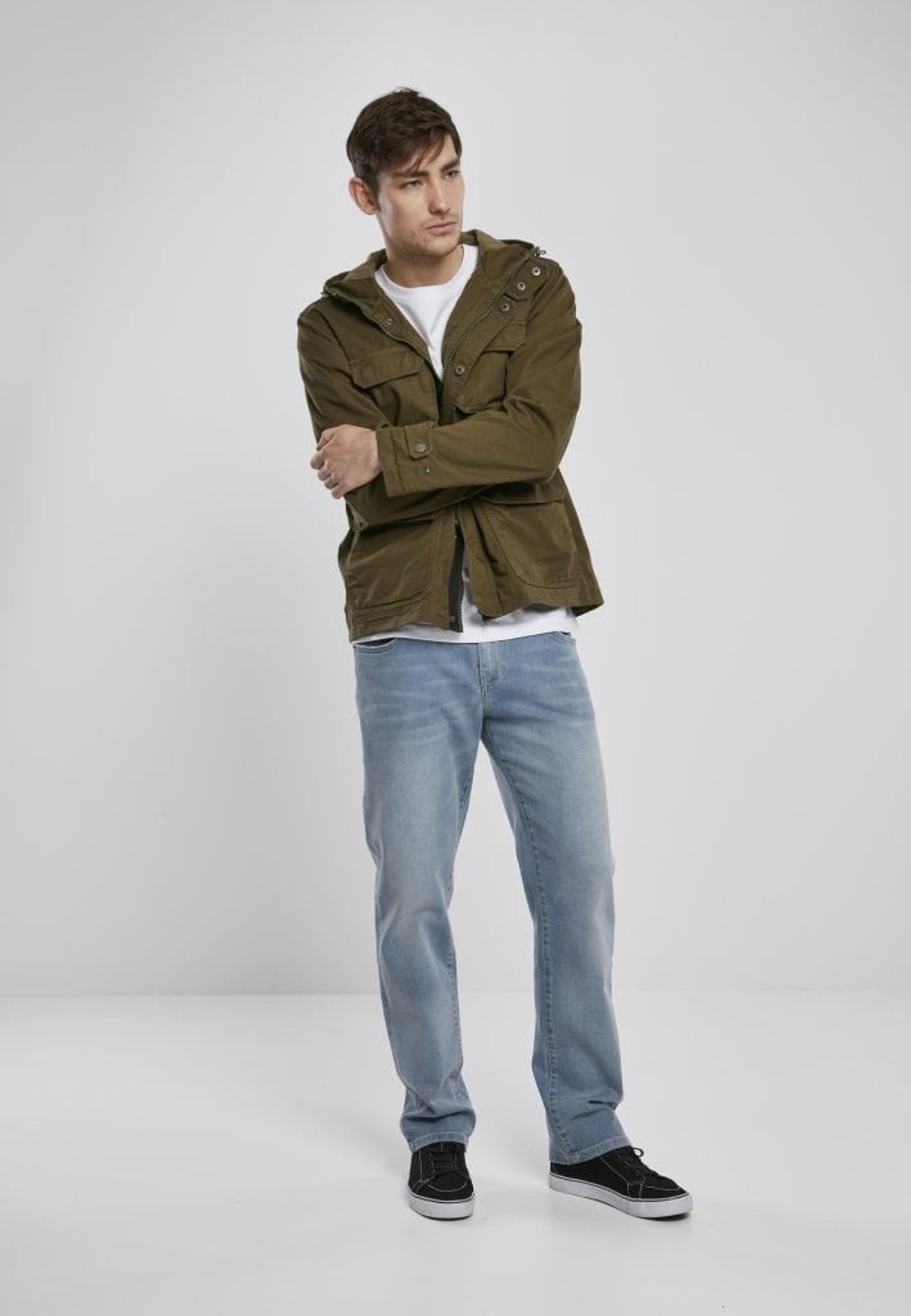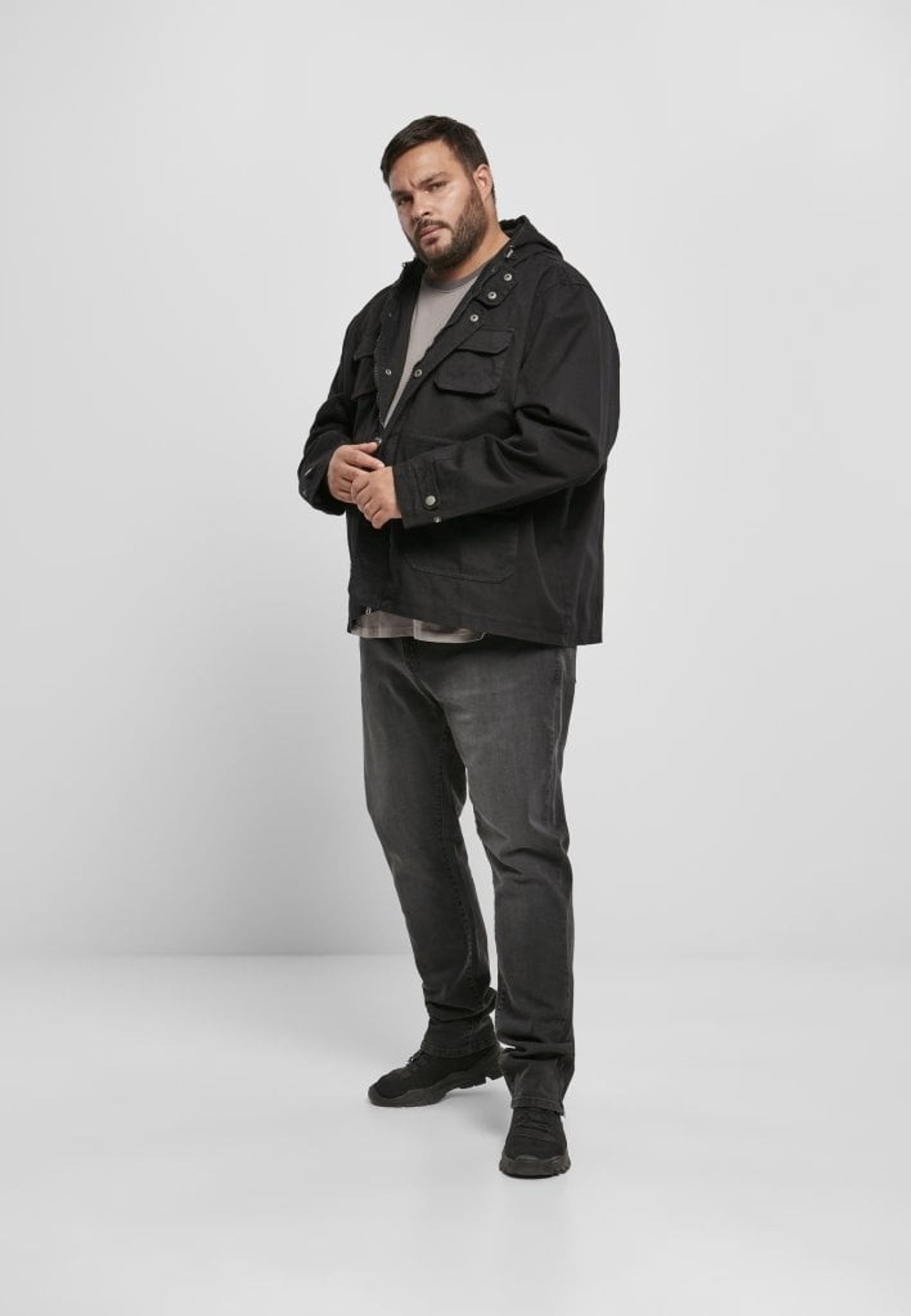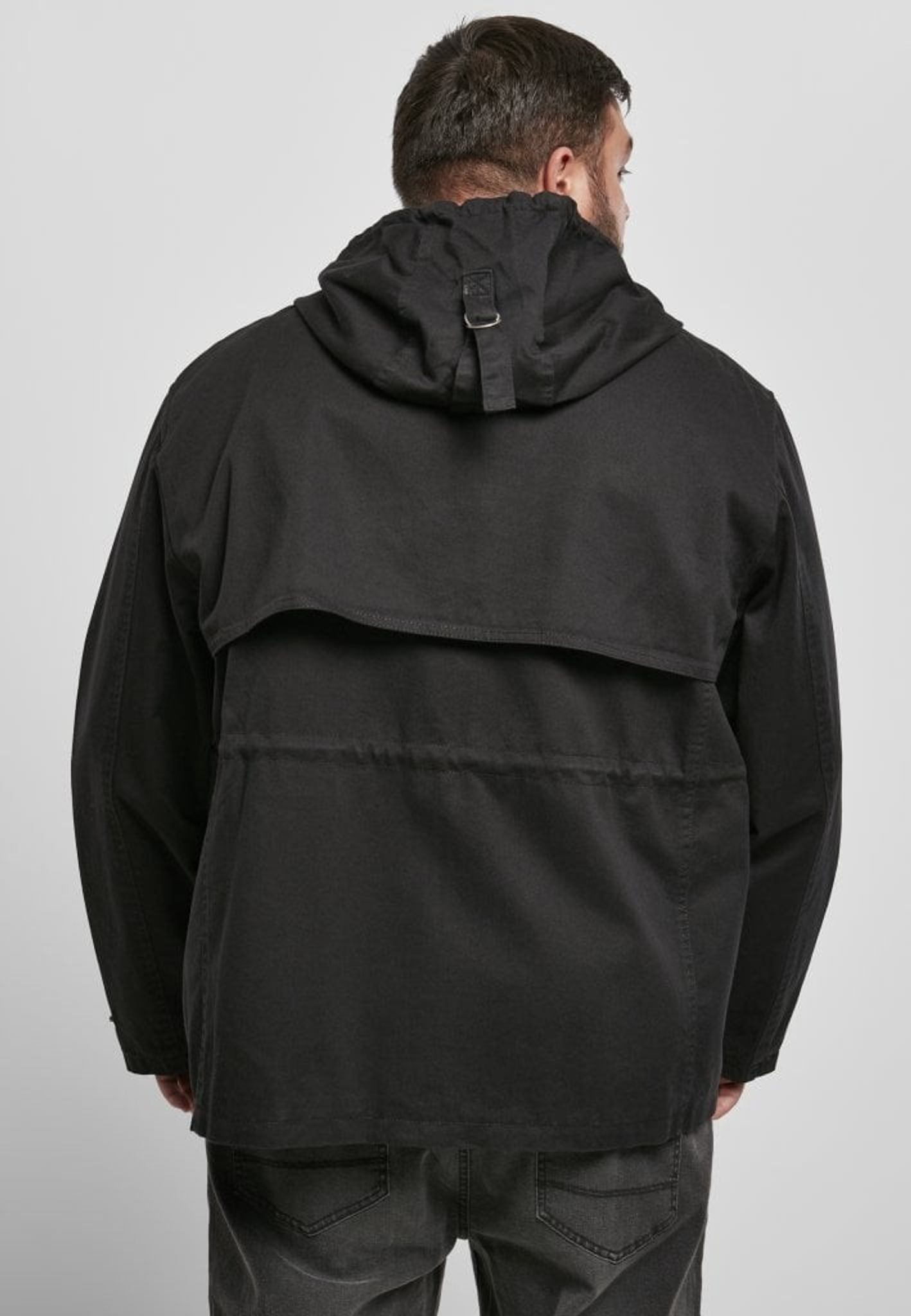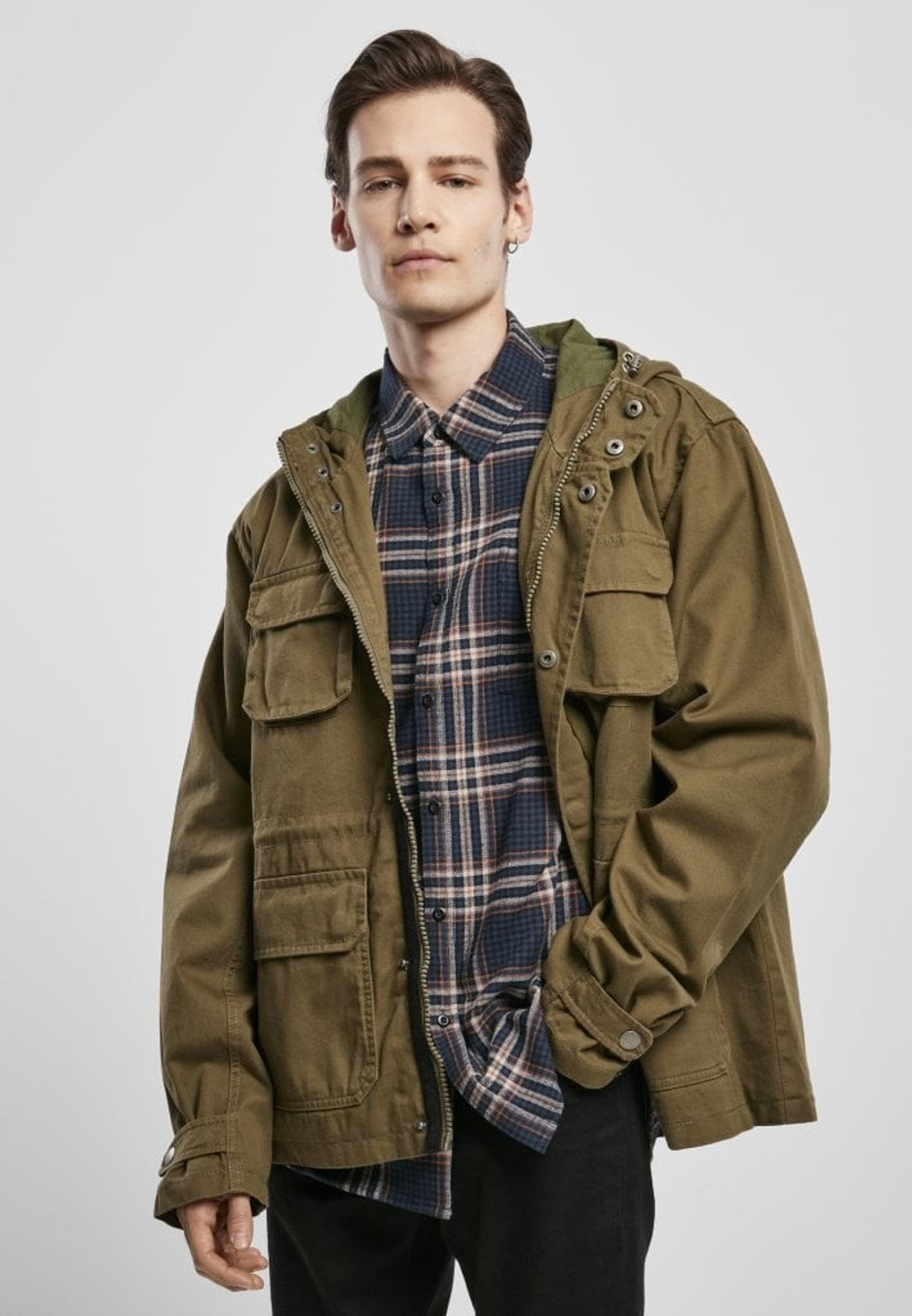 The jacket has a hood that can be adjusted and the jacket is opened with a zipper and push buttons at the front.