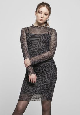 The upper layer of this dress consists of transparent lace fabric with a low turtle neck. The hems are slightly wavy.
