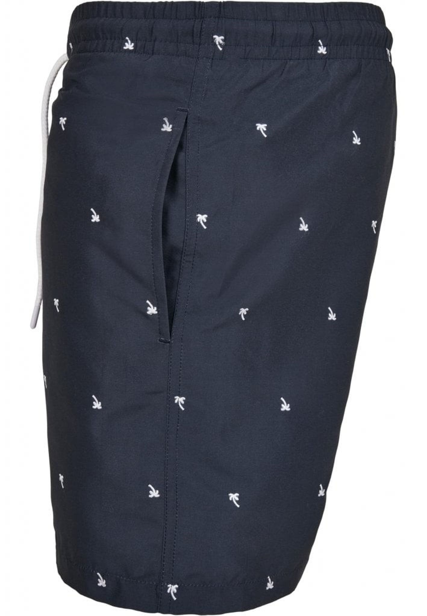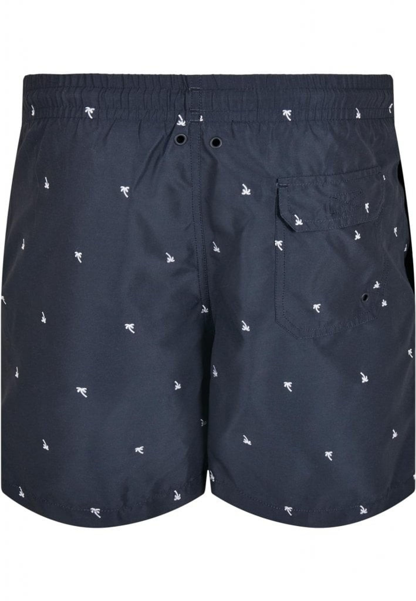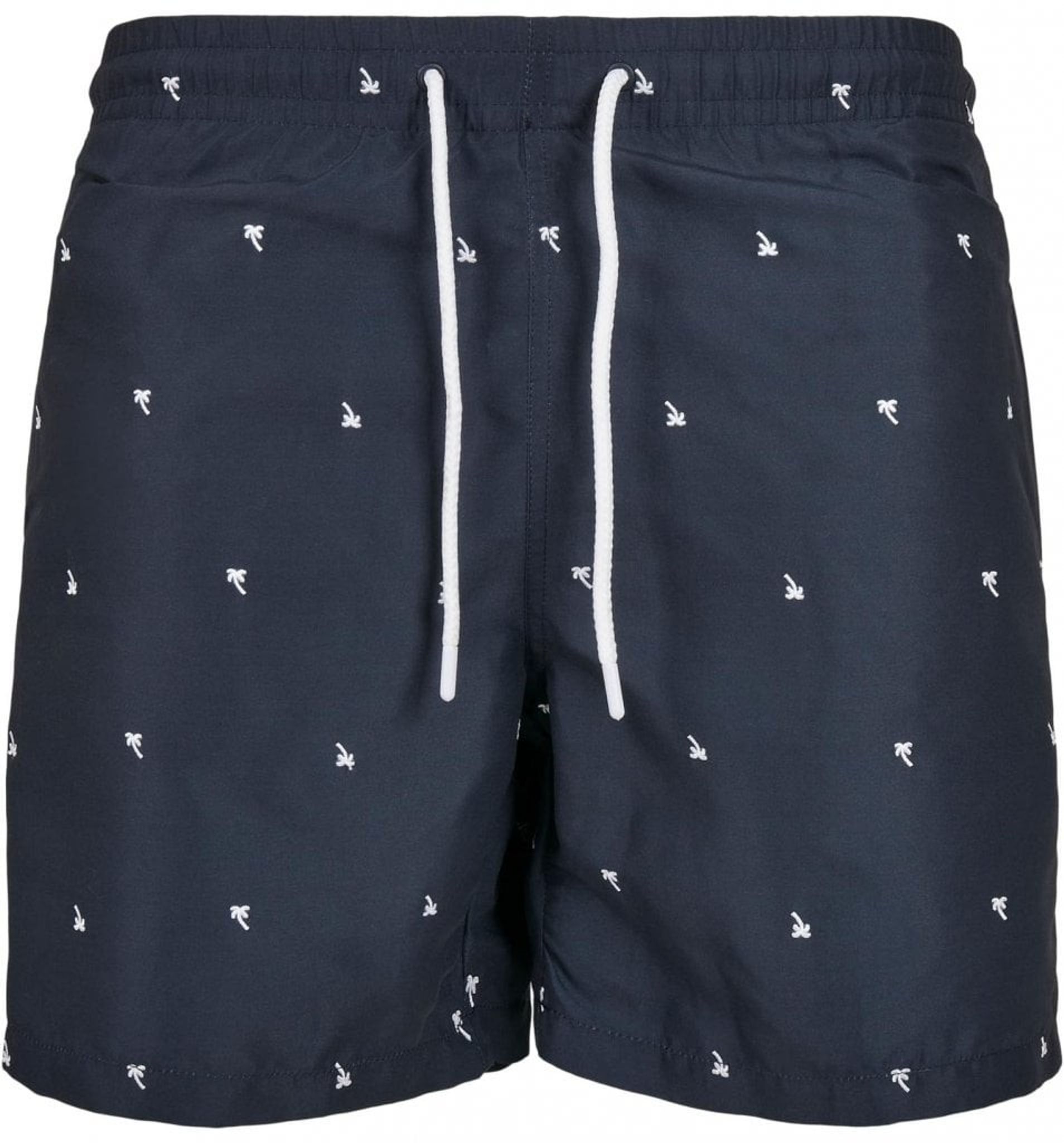 Dark blue swim shorts with palm trees.