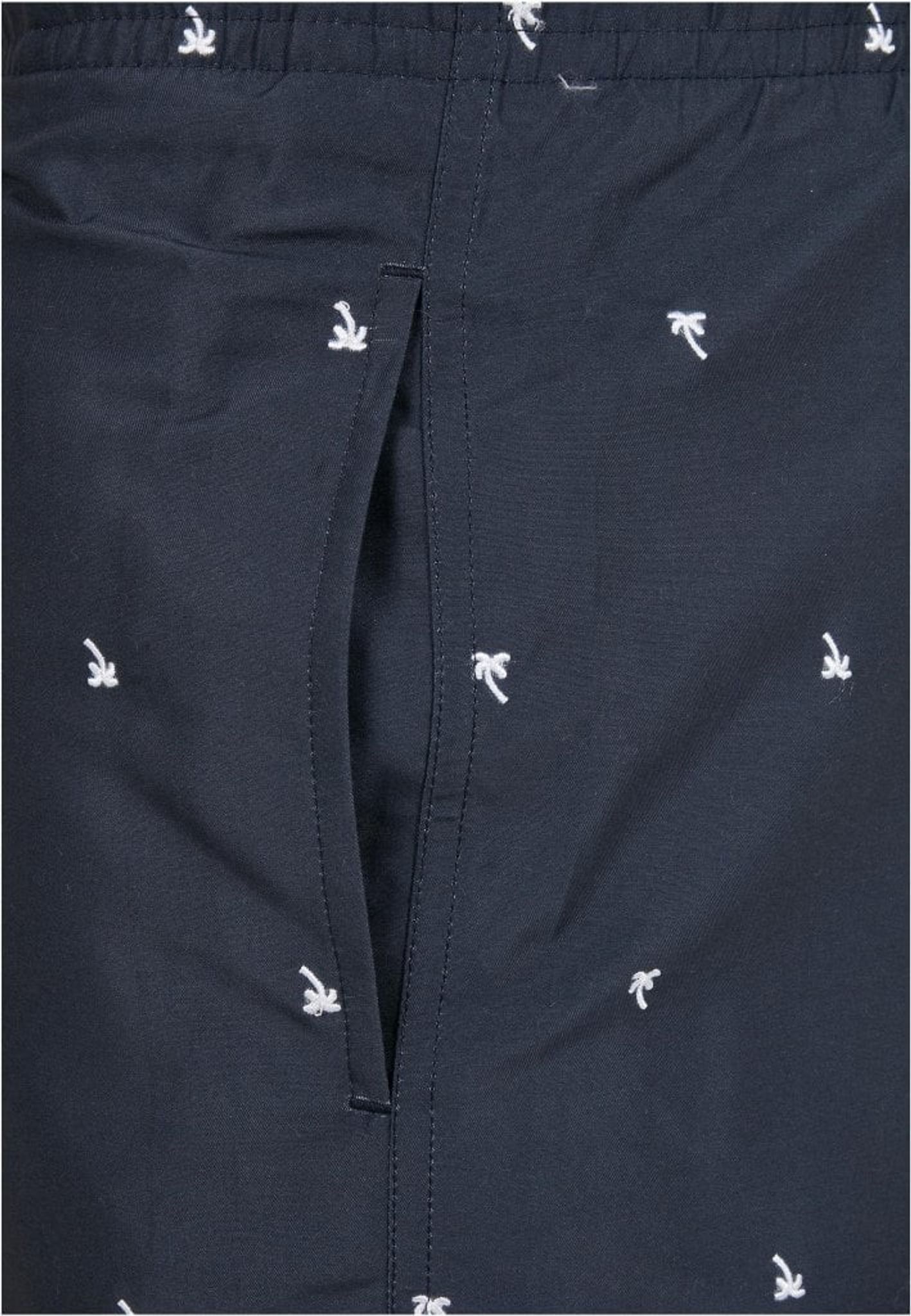 A pair of pliable and comfortable swimming shorts in blue fabric and with white palm trees embroidered around the fabric.