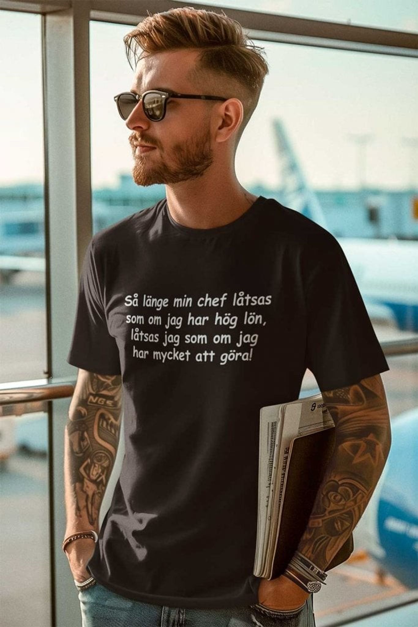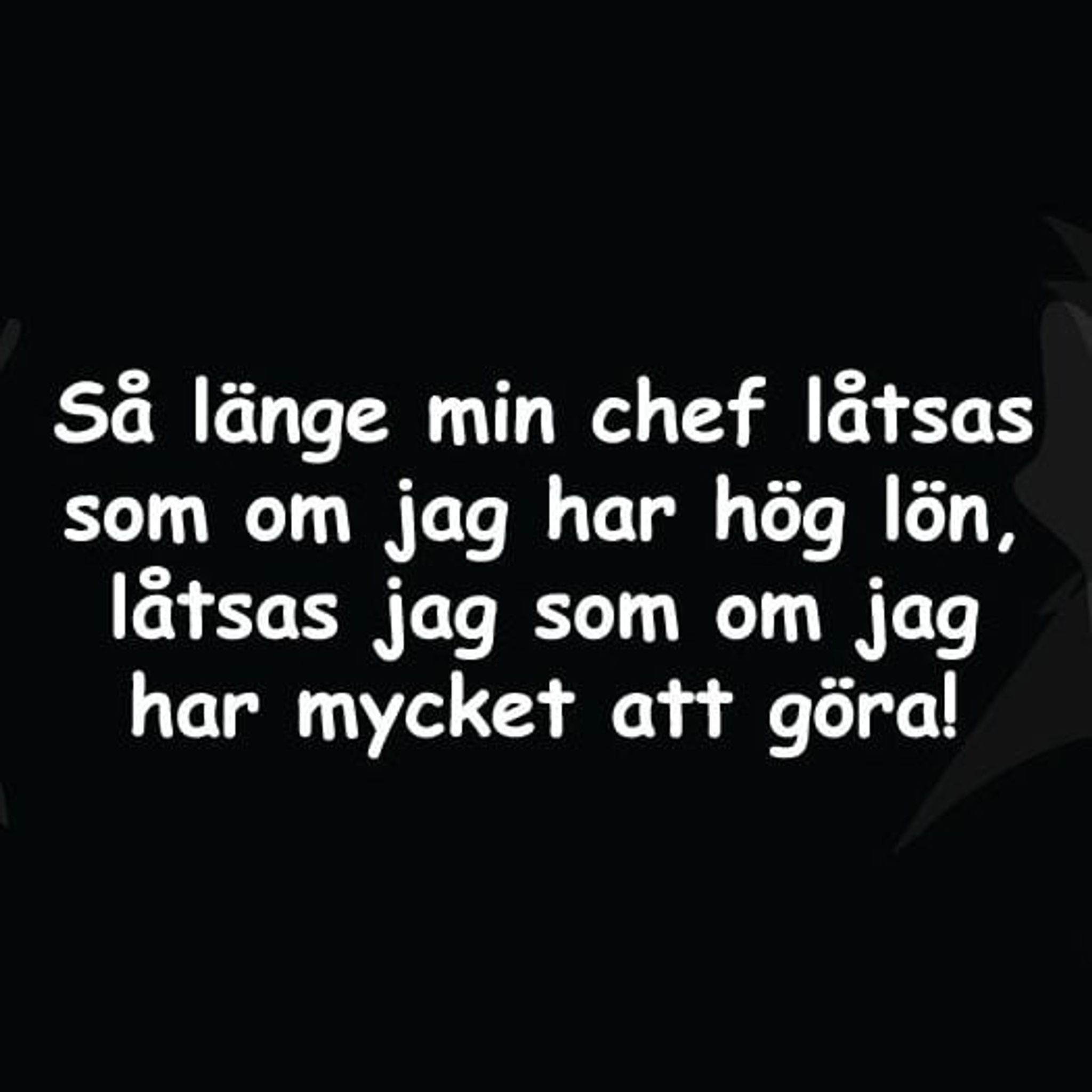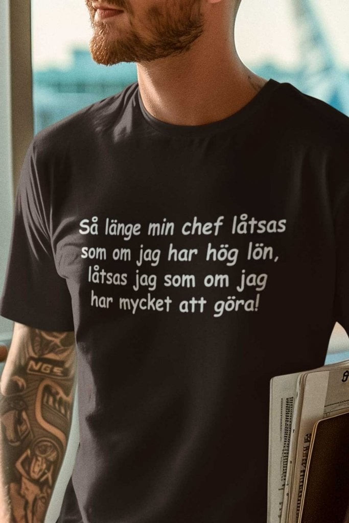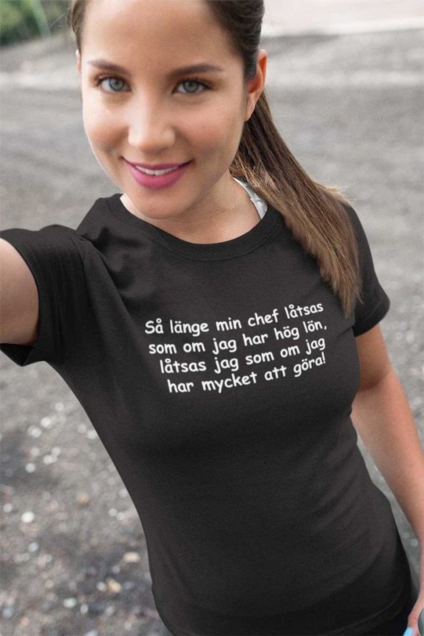 T-shirt med texten: Så länge min chef låtsas att jag har hög lön, låtsas jag som om jag har mycket att göra!