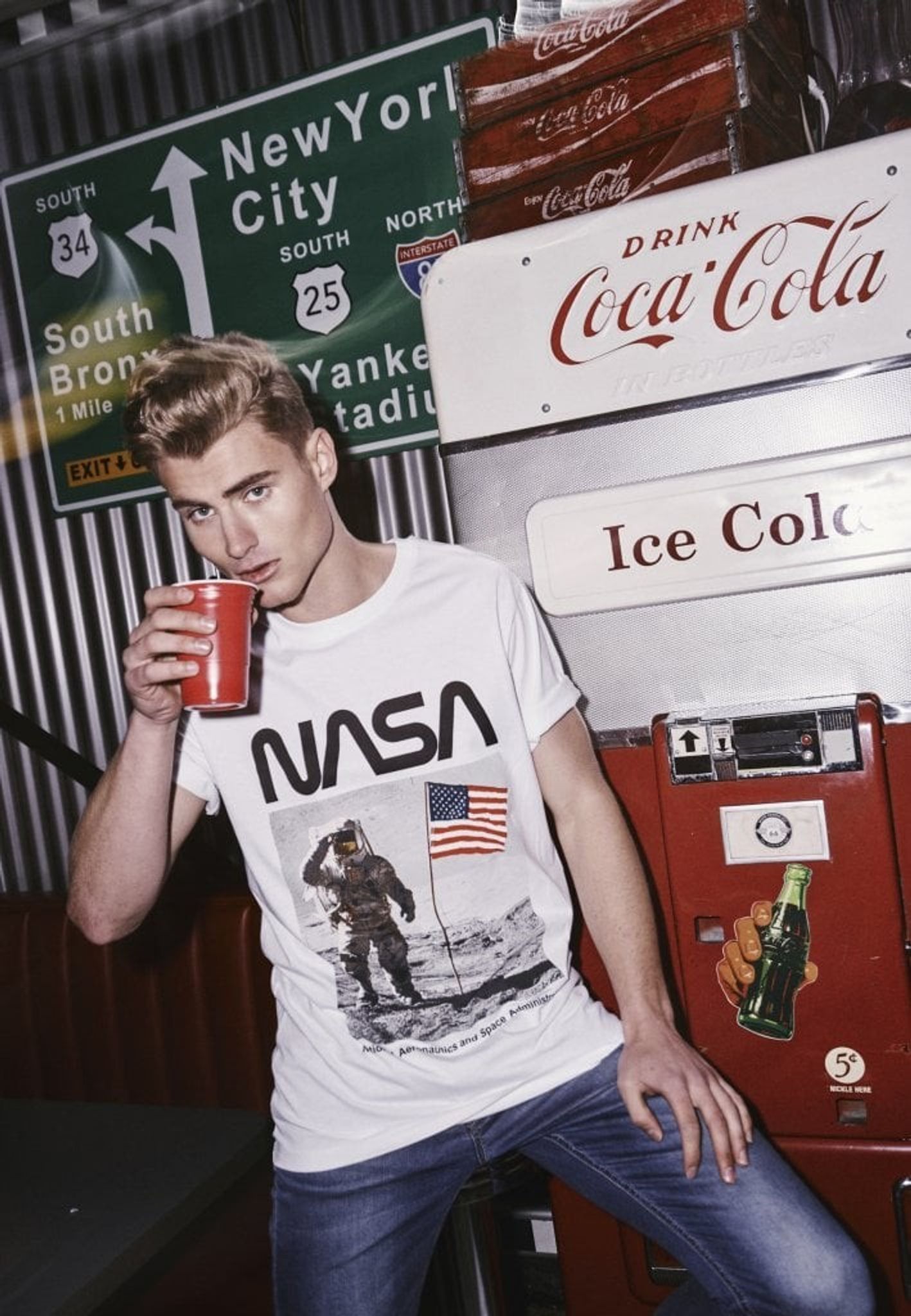 A white NASA print t-shirt showing an astronaut and the American flag.