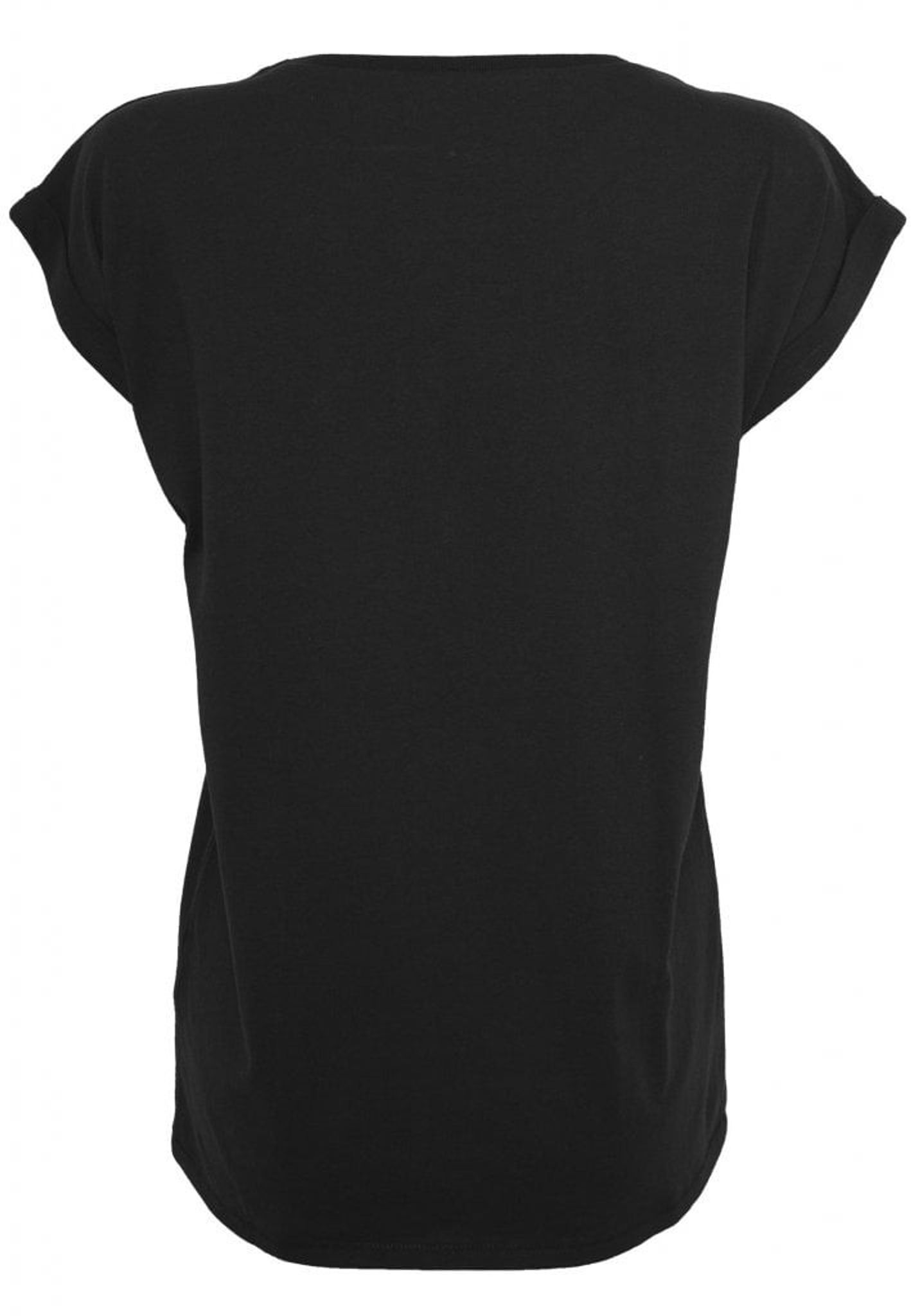 This is a black t-shirt with a large color print on the front. The sweater has lowered shoulders and a round neck.