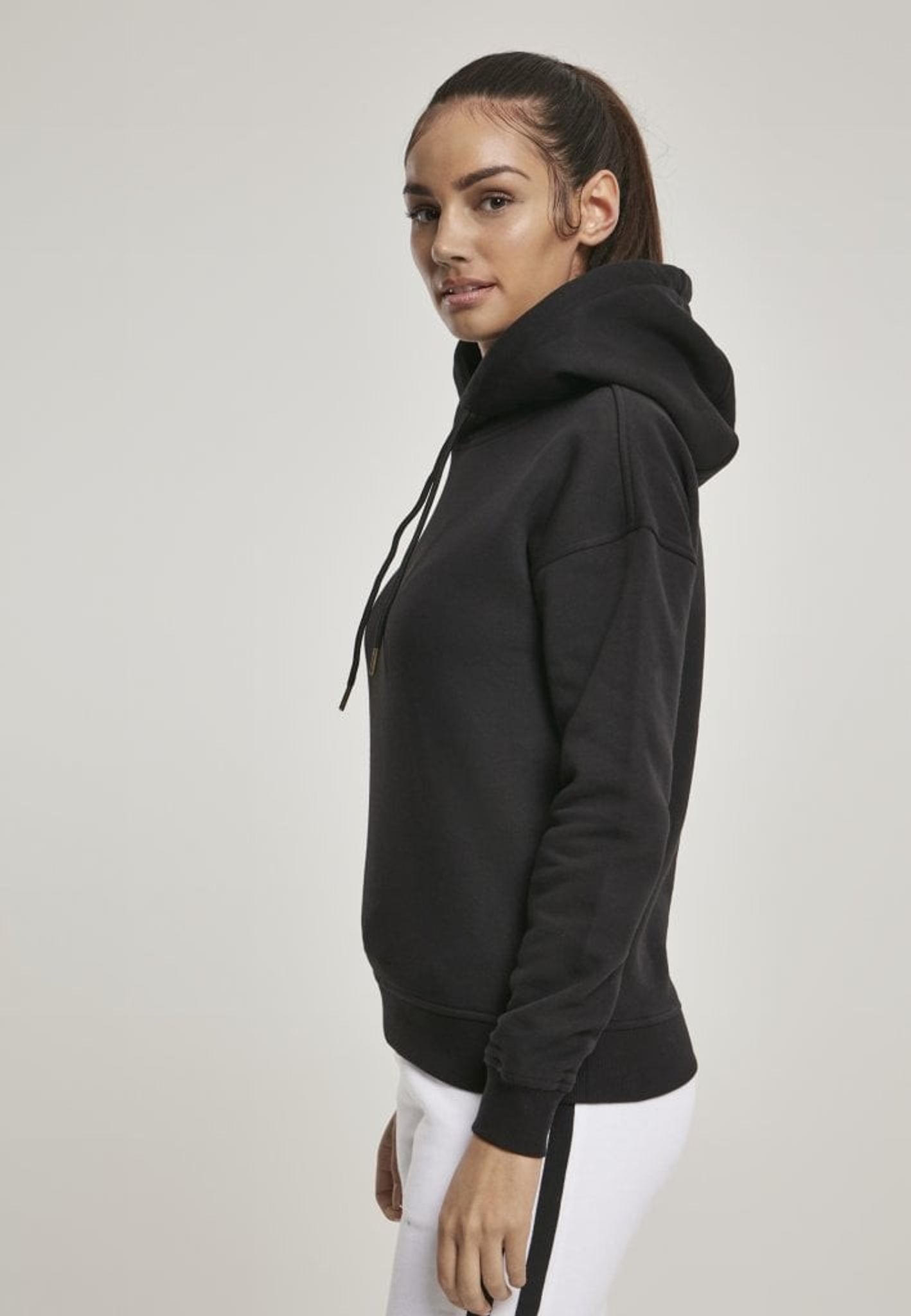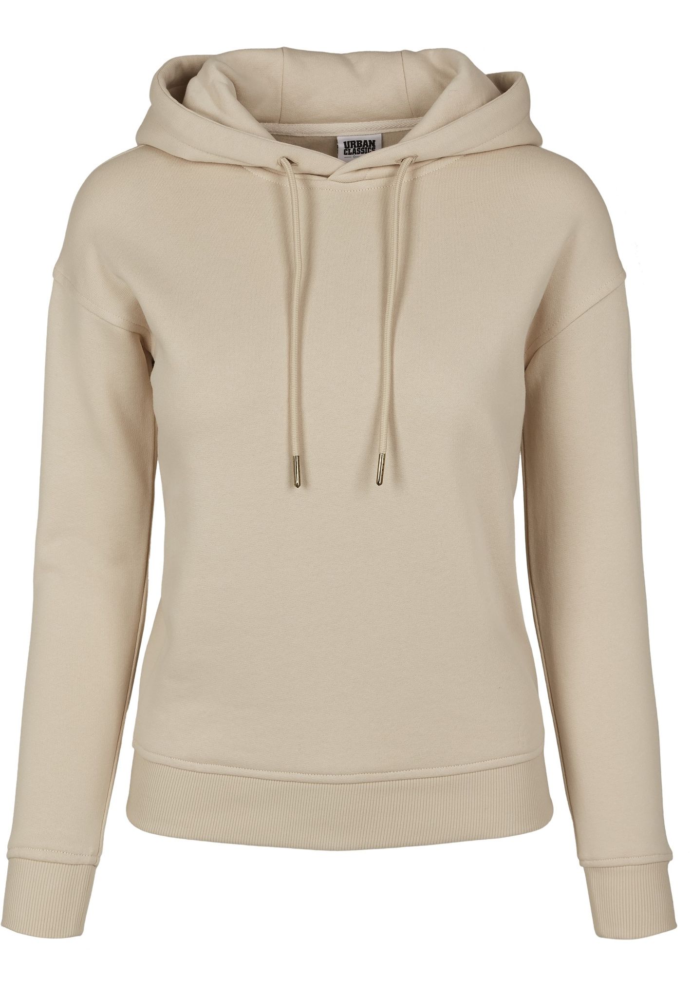 A hooded sweater with downed arm and elastic at the bottom and at the armrest.