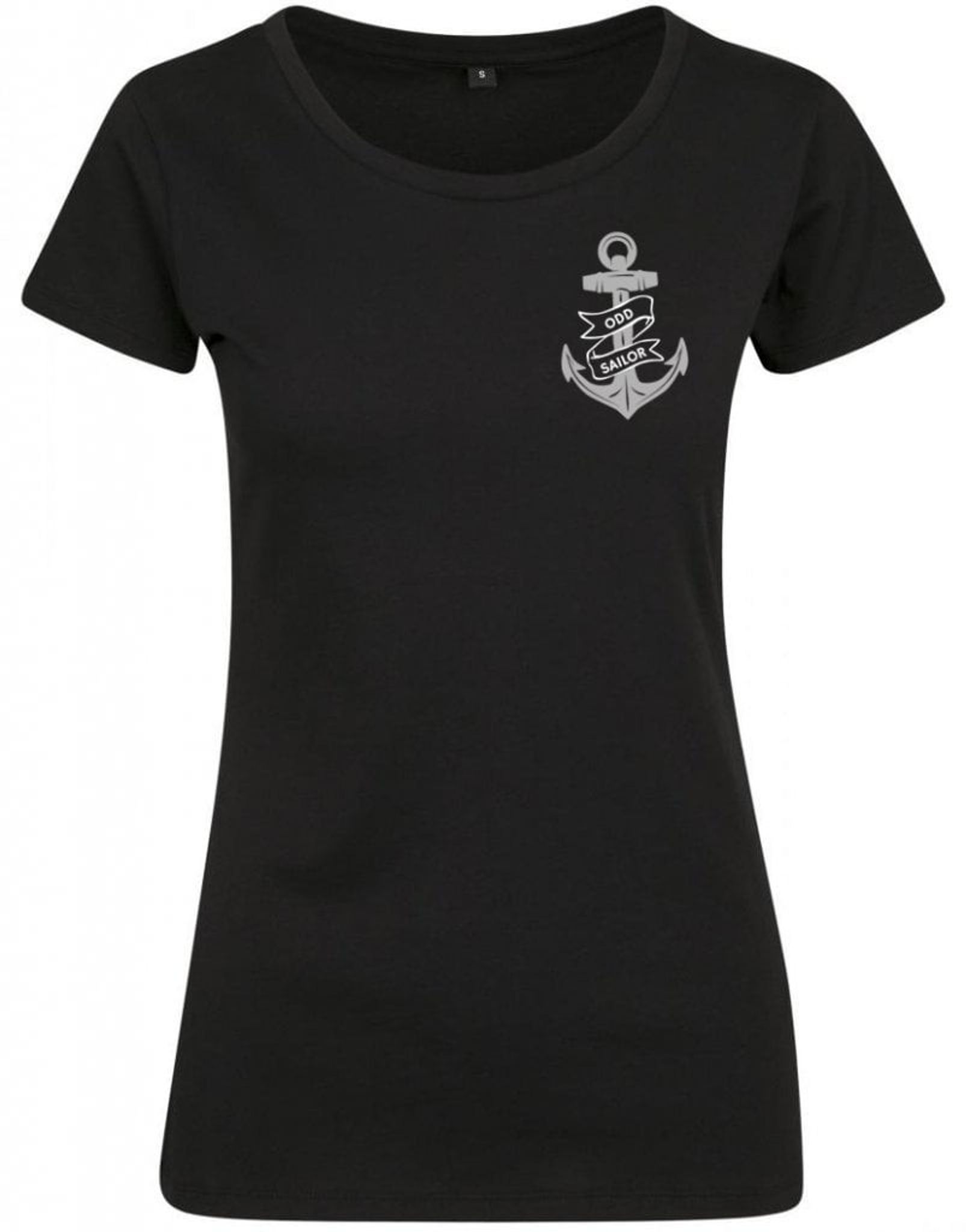 A T-shirt in women's sizes and with a gray anchor on the chest. A black banner with the text Odd Sailor spins around the anchor.
