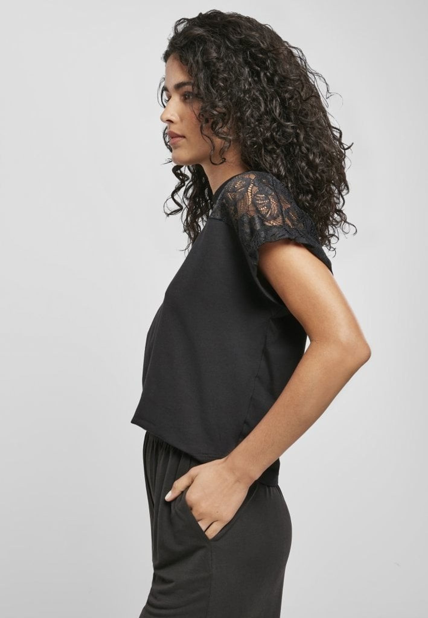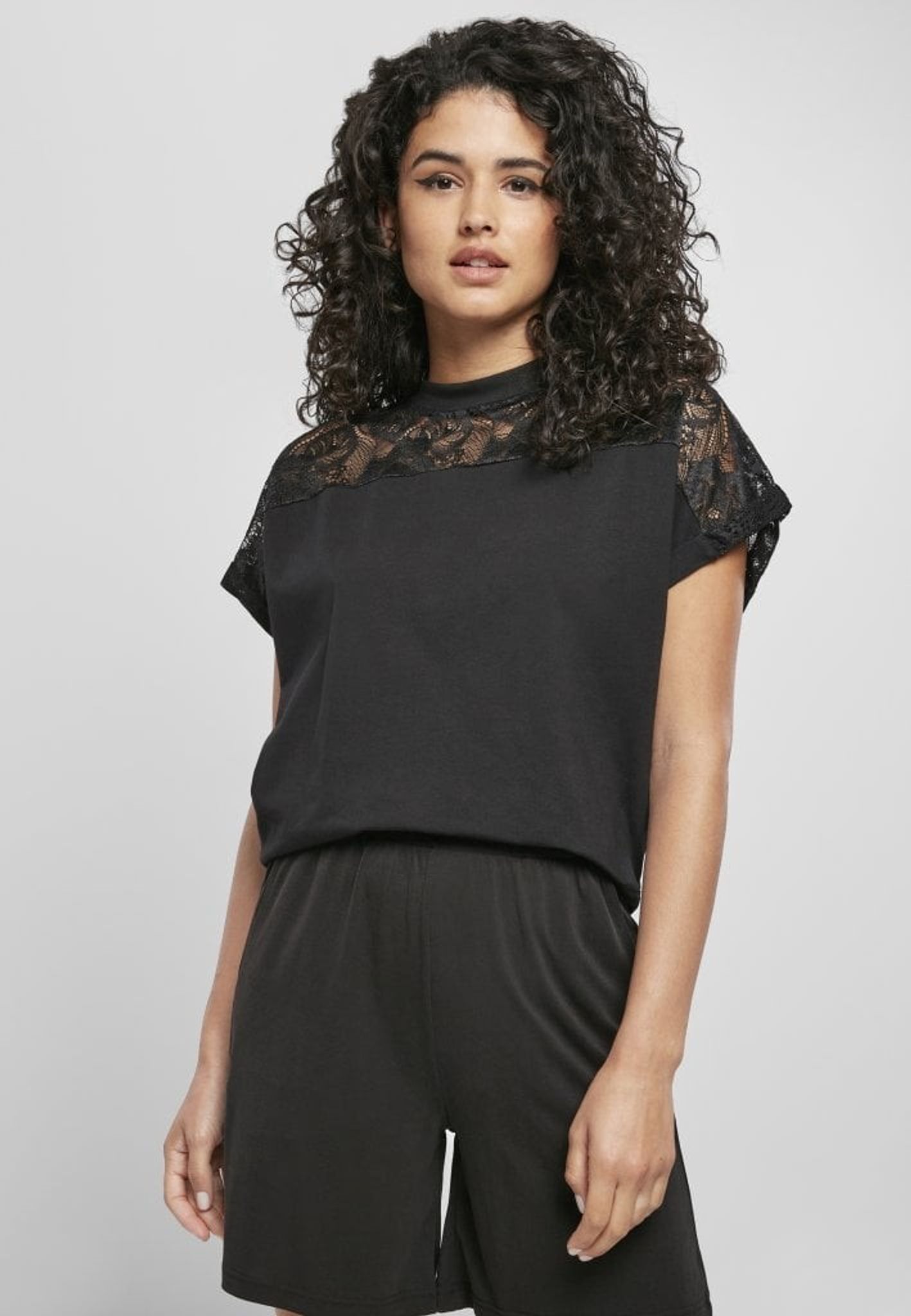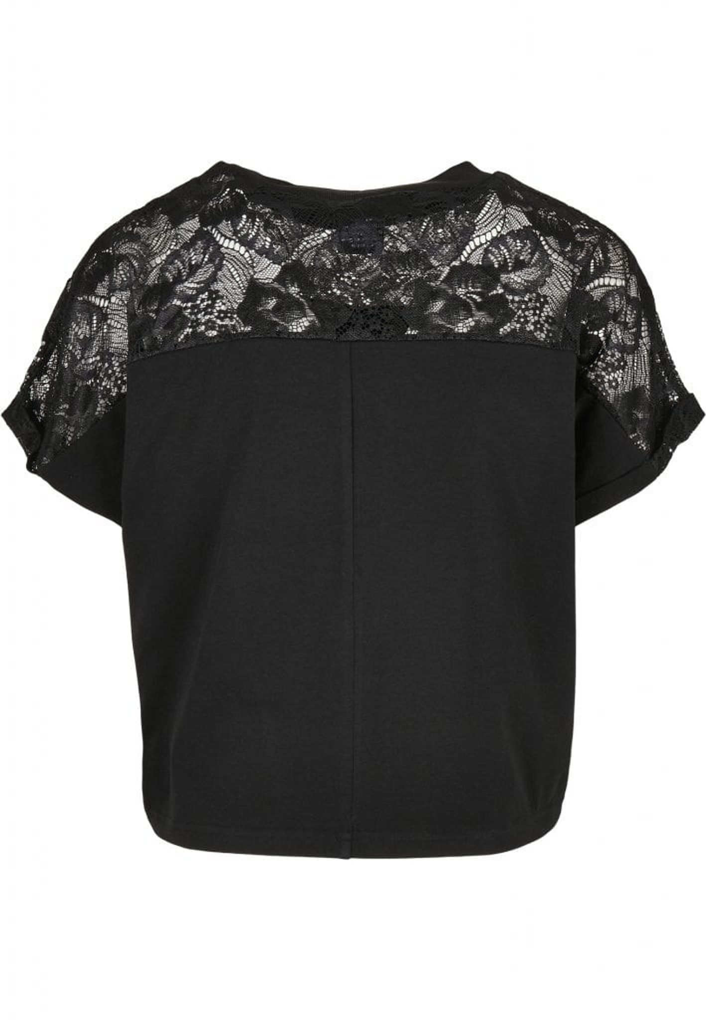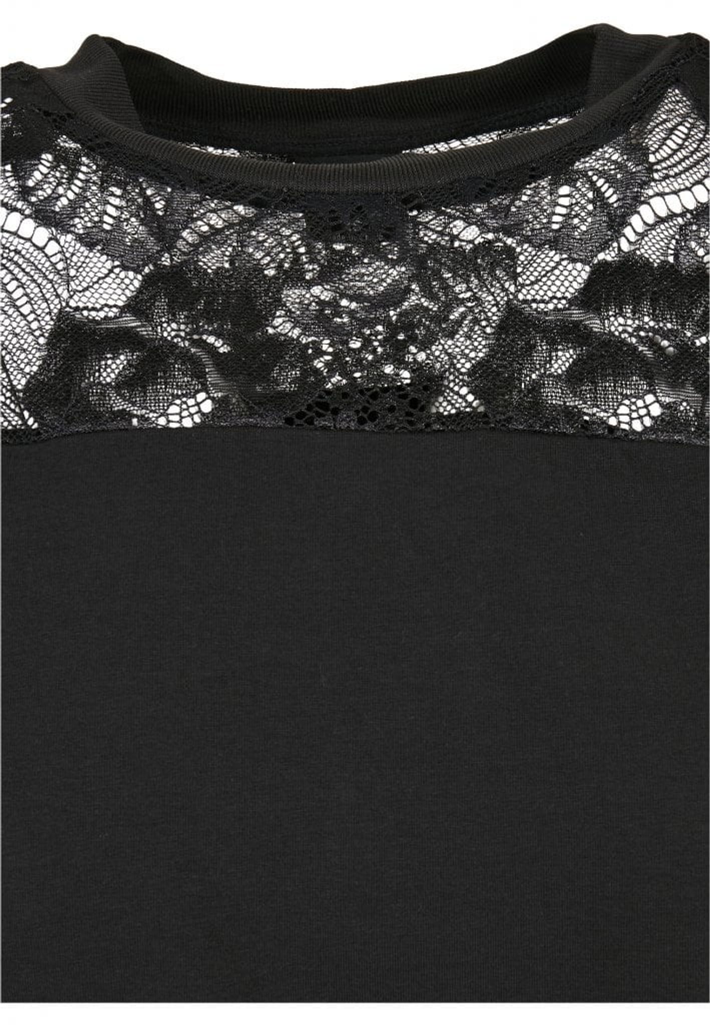 - Pattern: The shoulder area has a lace fabric both back and front. A little wider at the back. The remaining part of the shirt is in black cotton jersey.