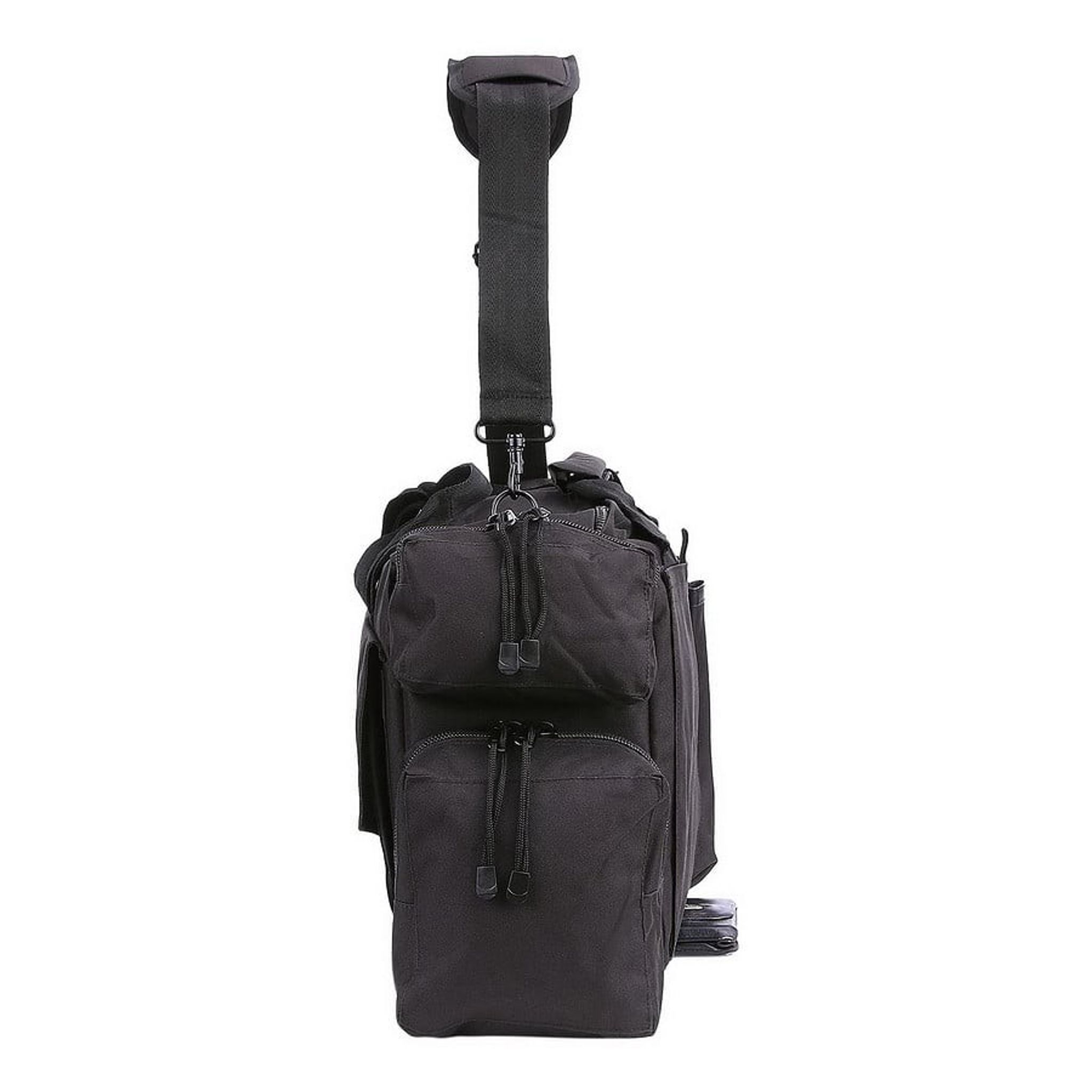 - Features: Adjustable reinforced dividers, reinforced outer sides (filled with thick foam), 2 pistol magazine pouches, double zipper on top, comfortable carrying strap (adjustable), velcro panel for patches, handcuff pouch, multiple zippered storage compartments, inner side of the bag is finished with PVC (water repellent)
