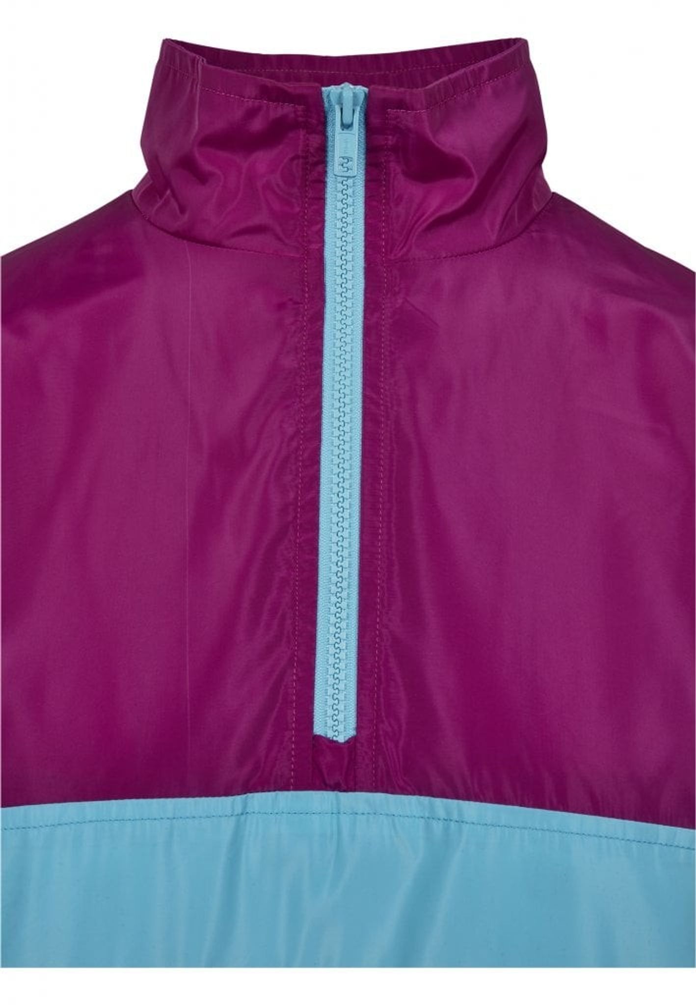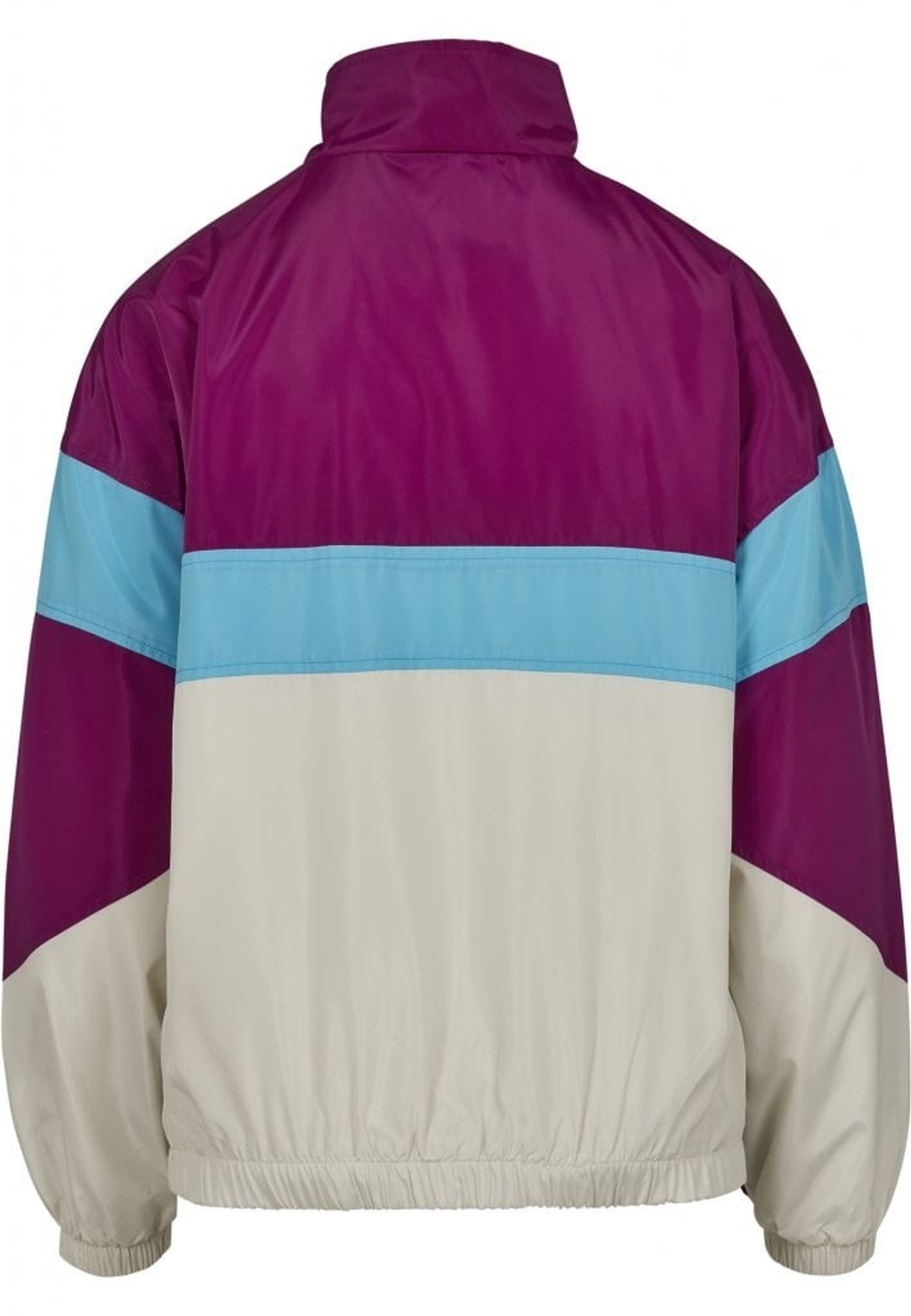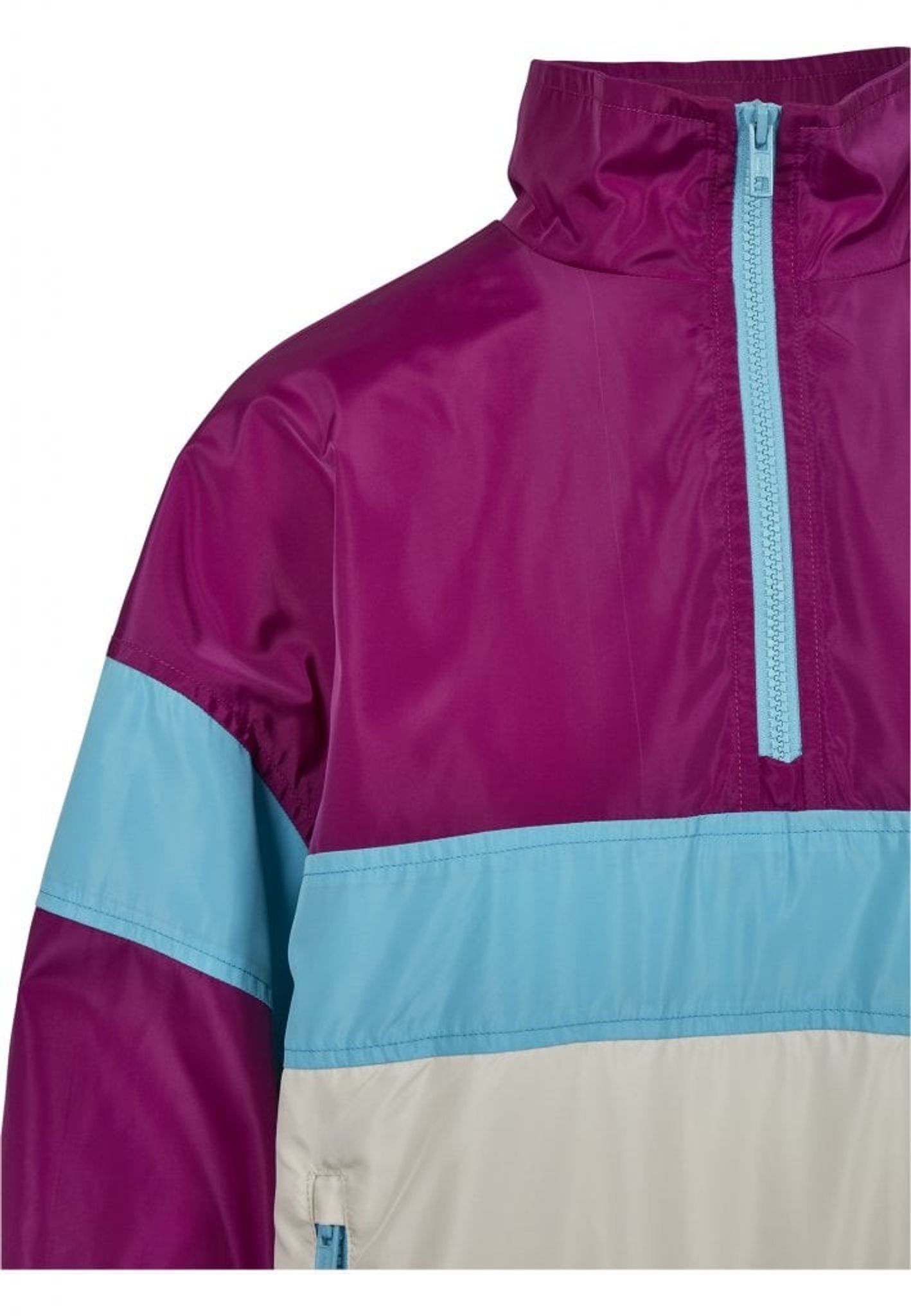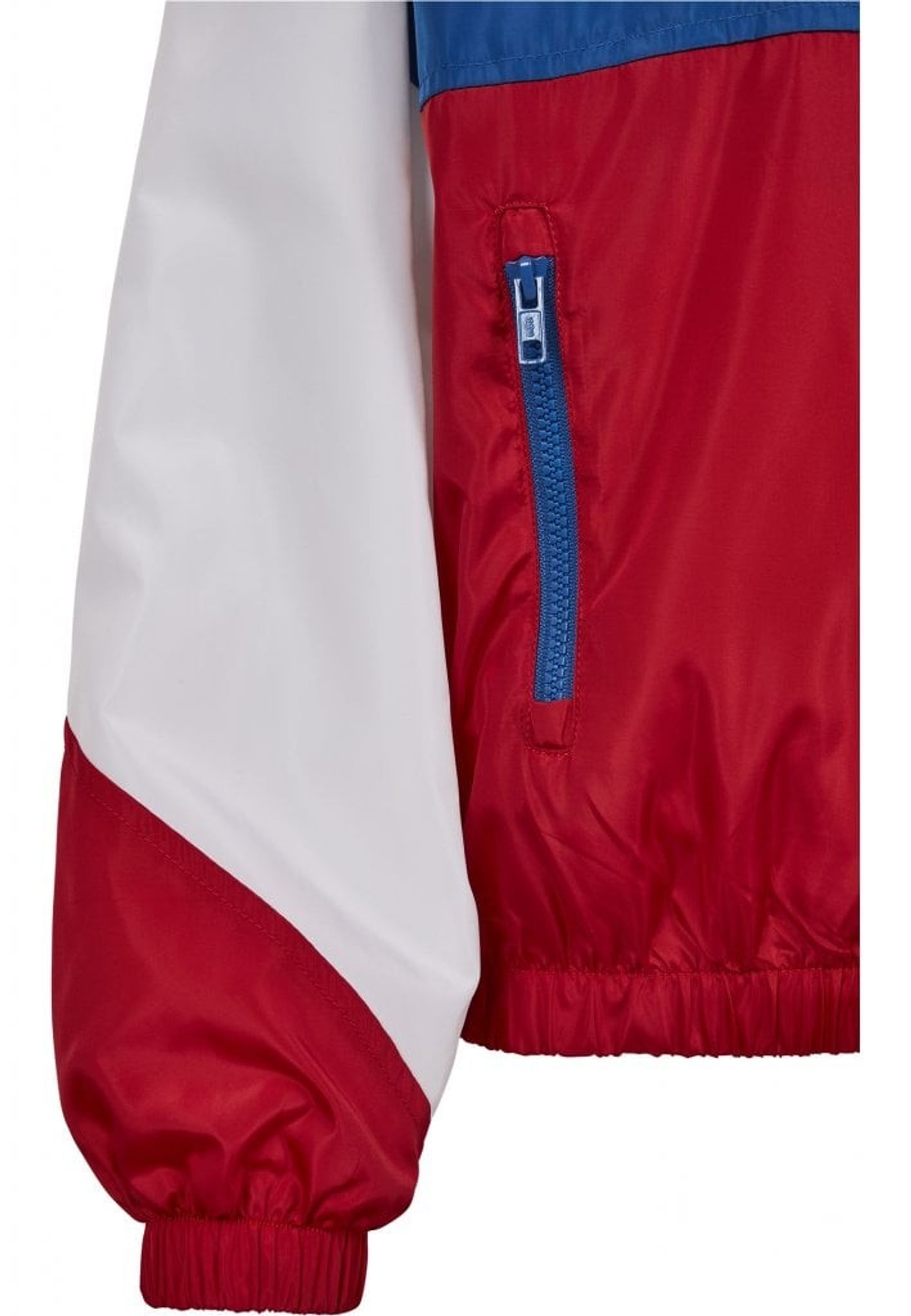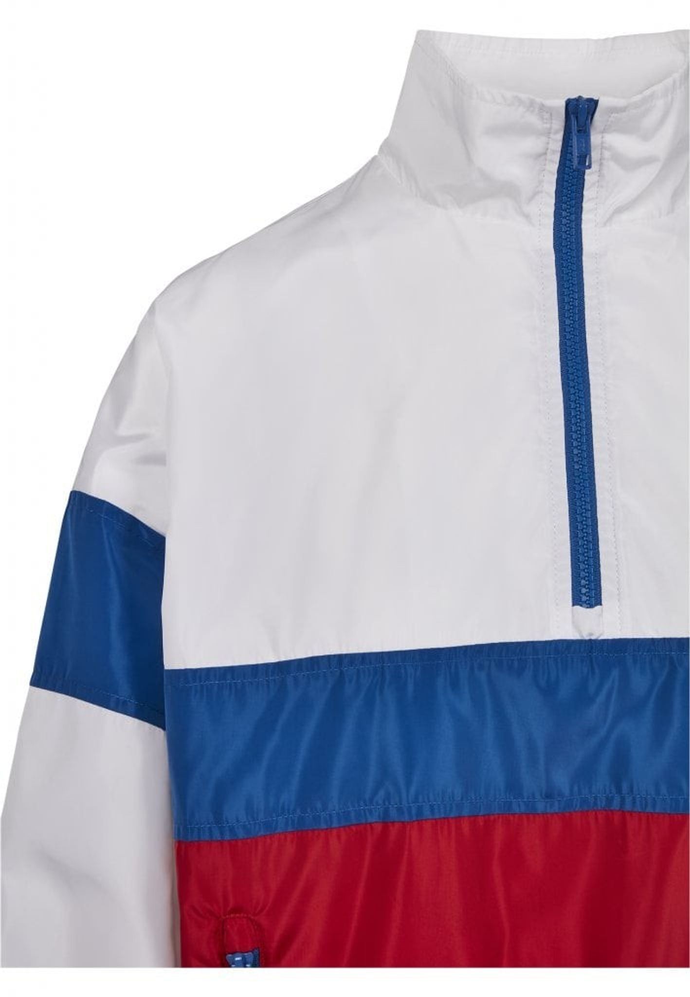 The wind jacket has three colors in wide stripes on the jacket and the zipper has a different color as an extra detail.