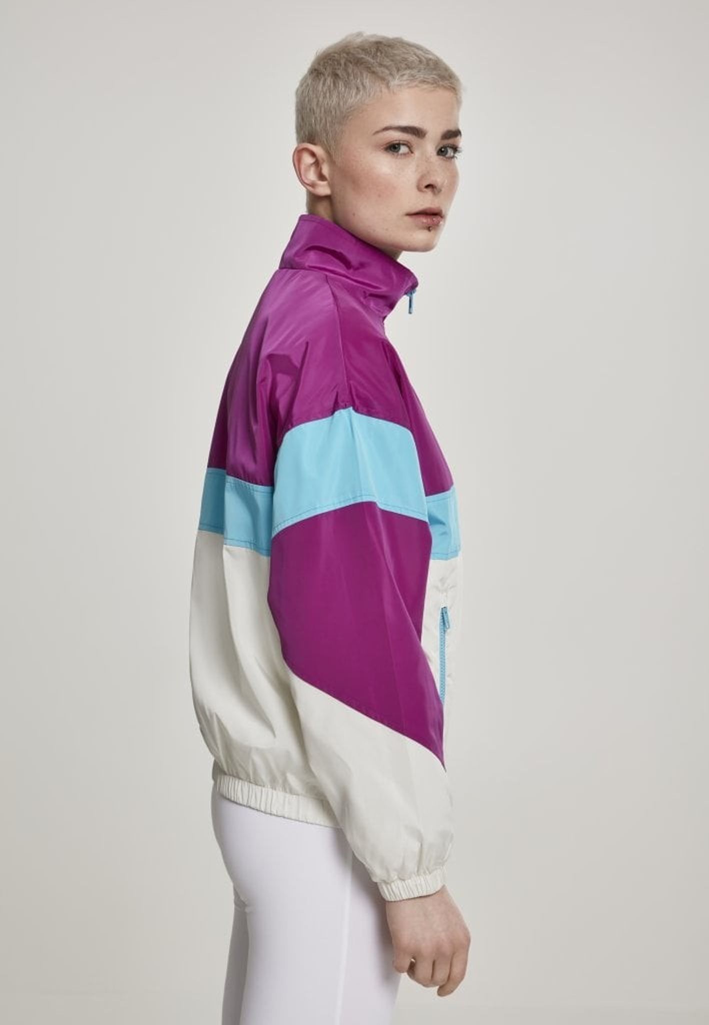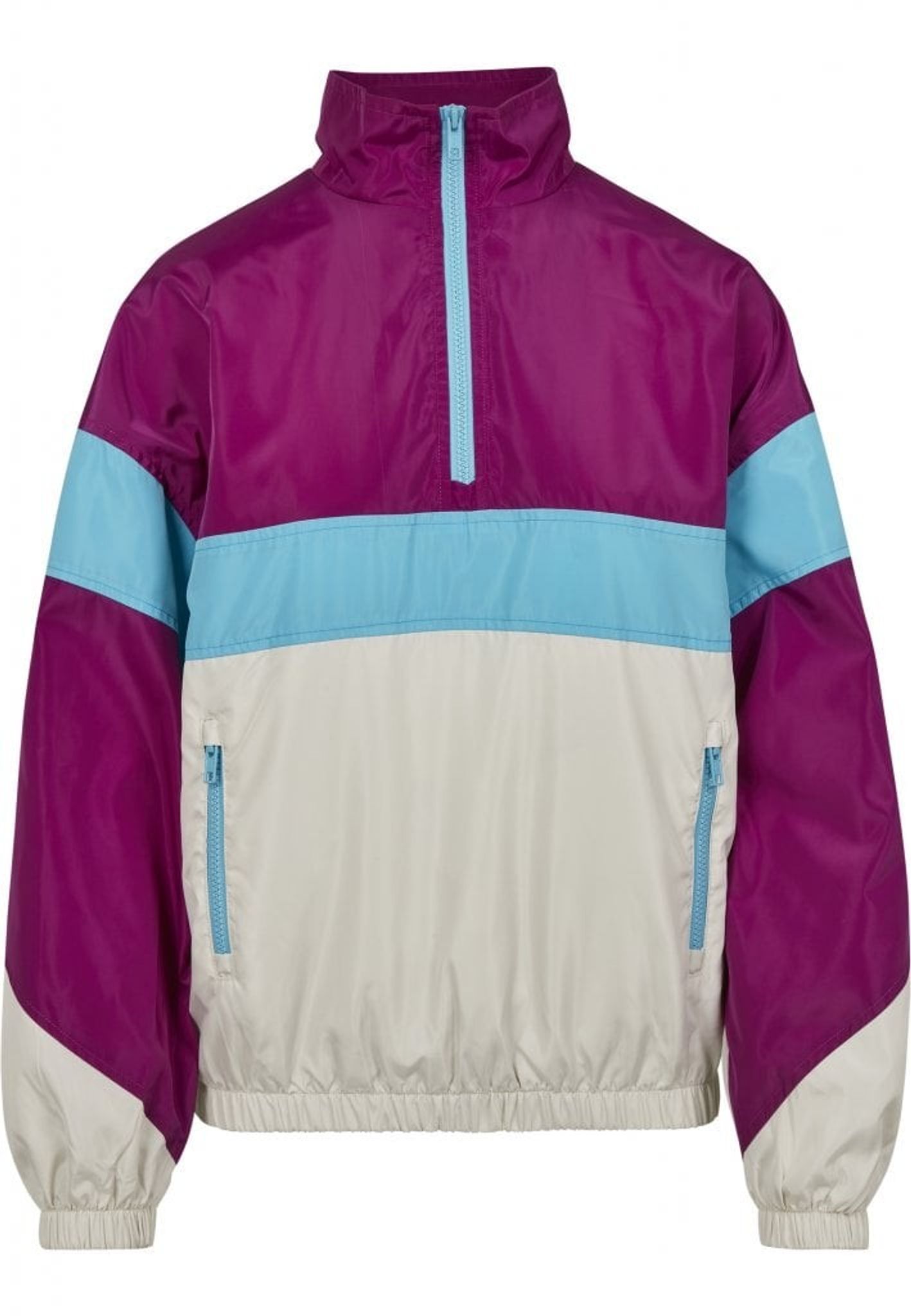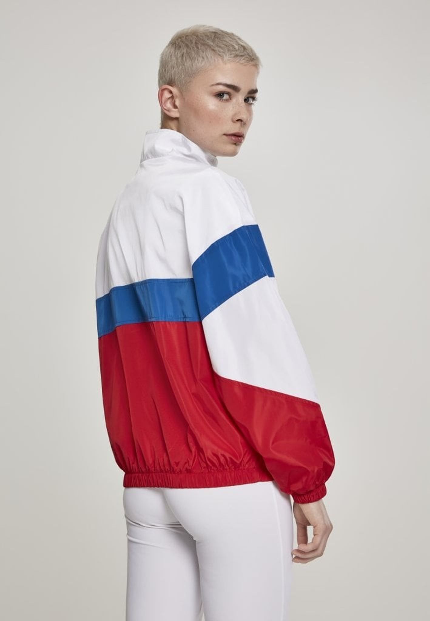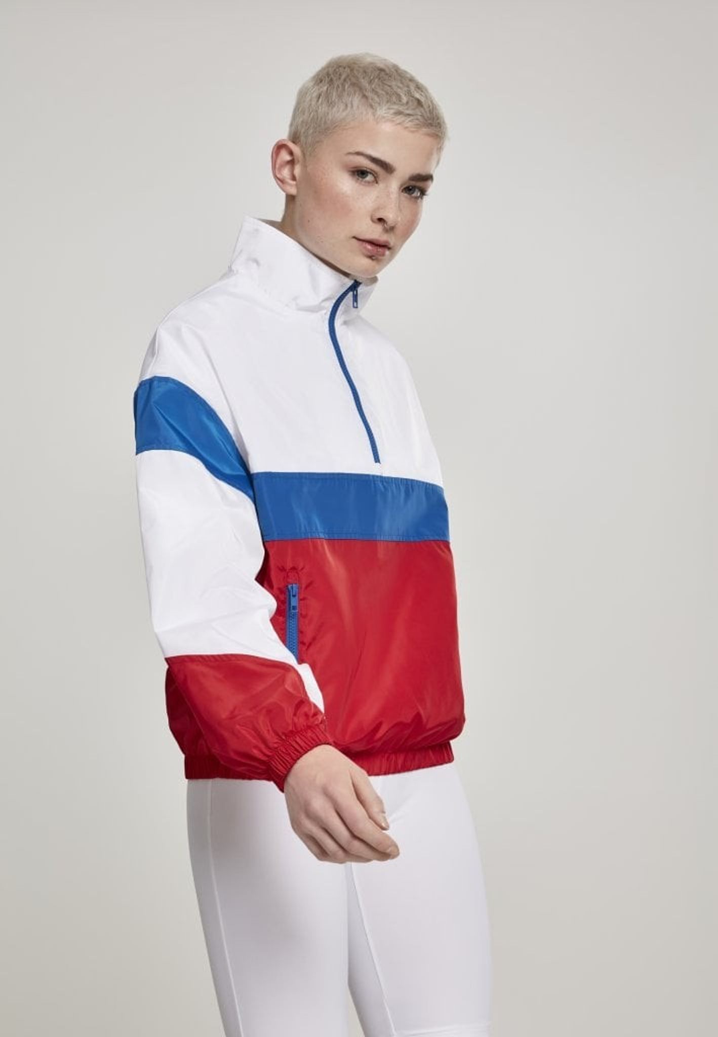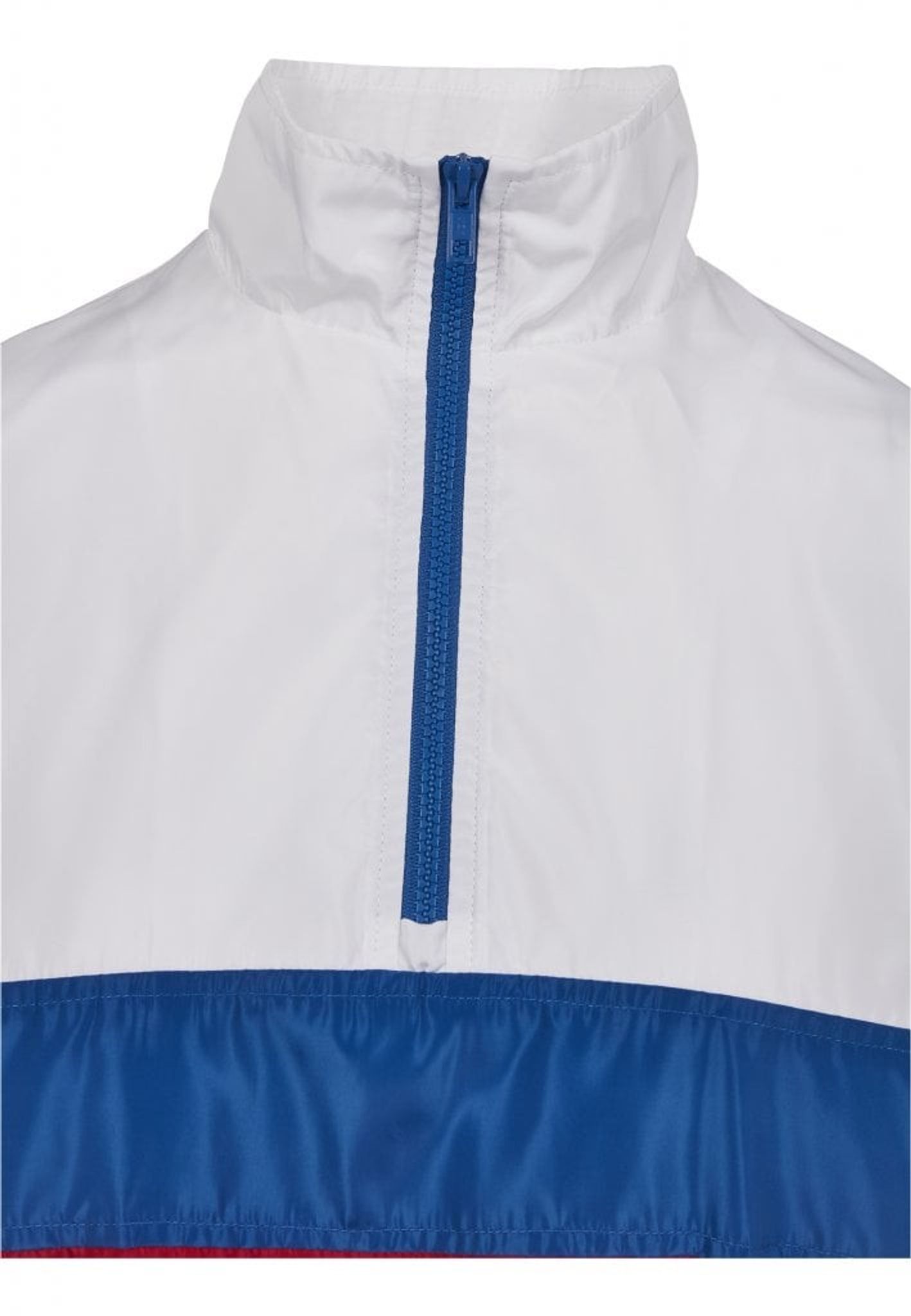The wind jacket has three colors in wide stripes on the jacket and the zipper has a different color as an extra detail.