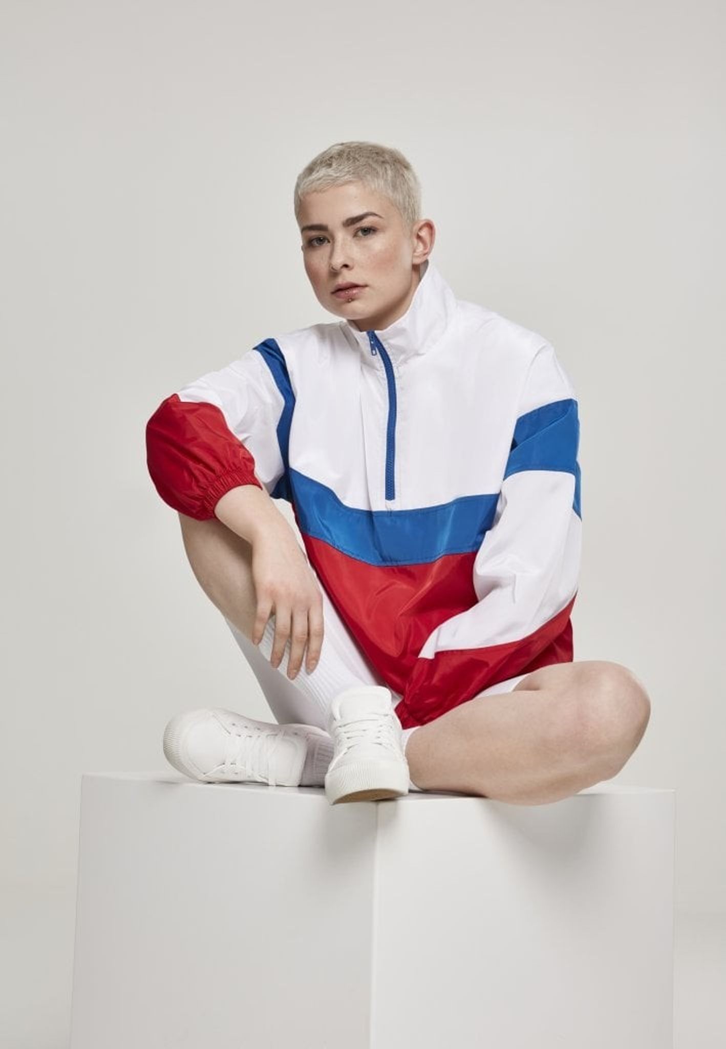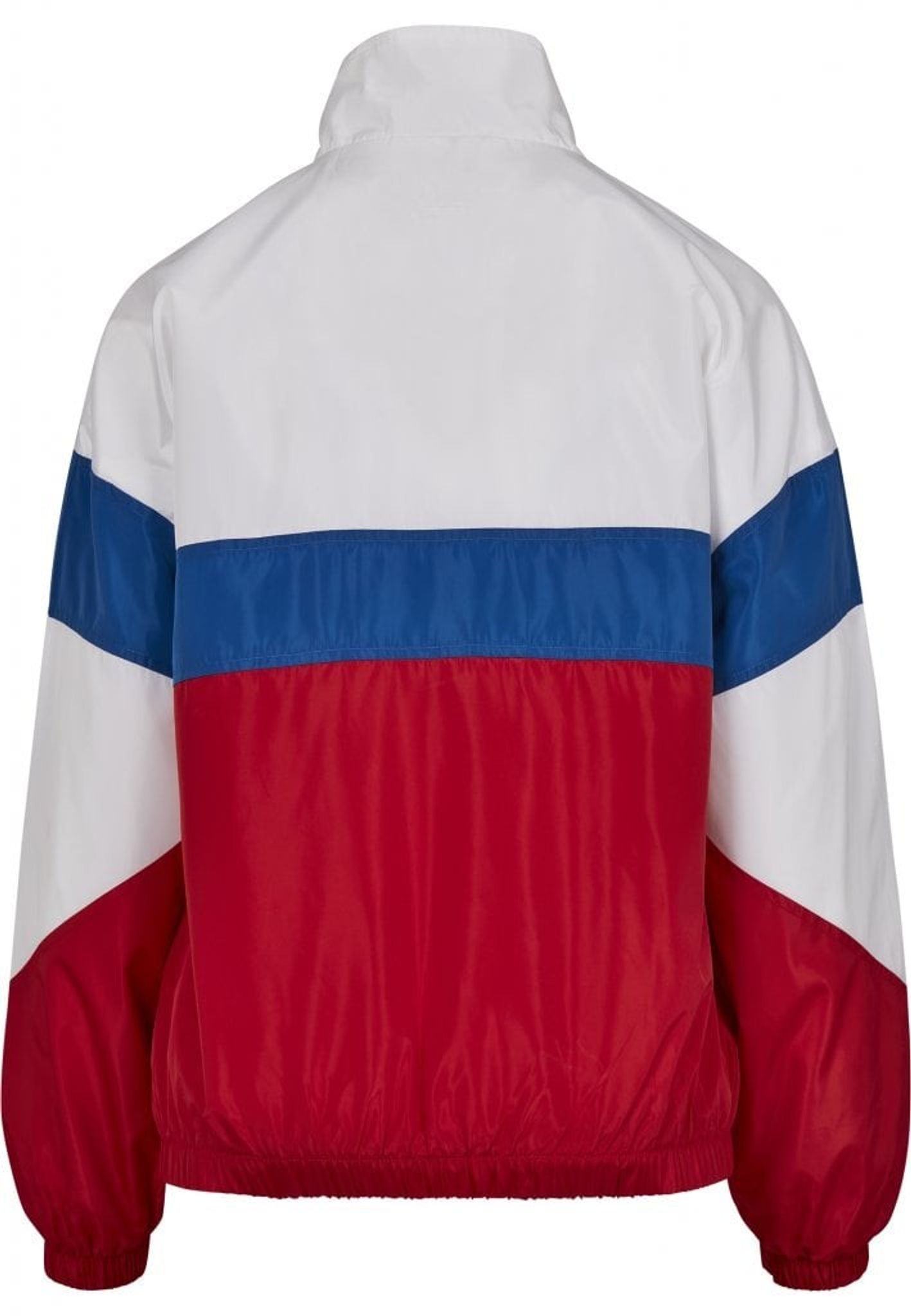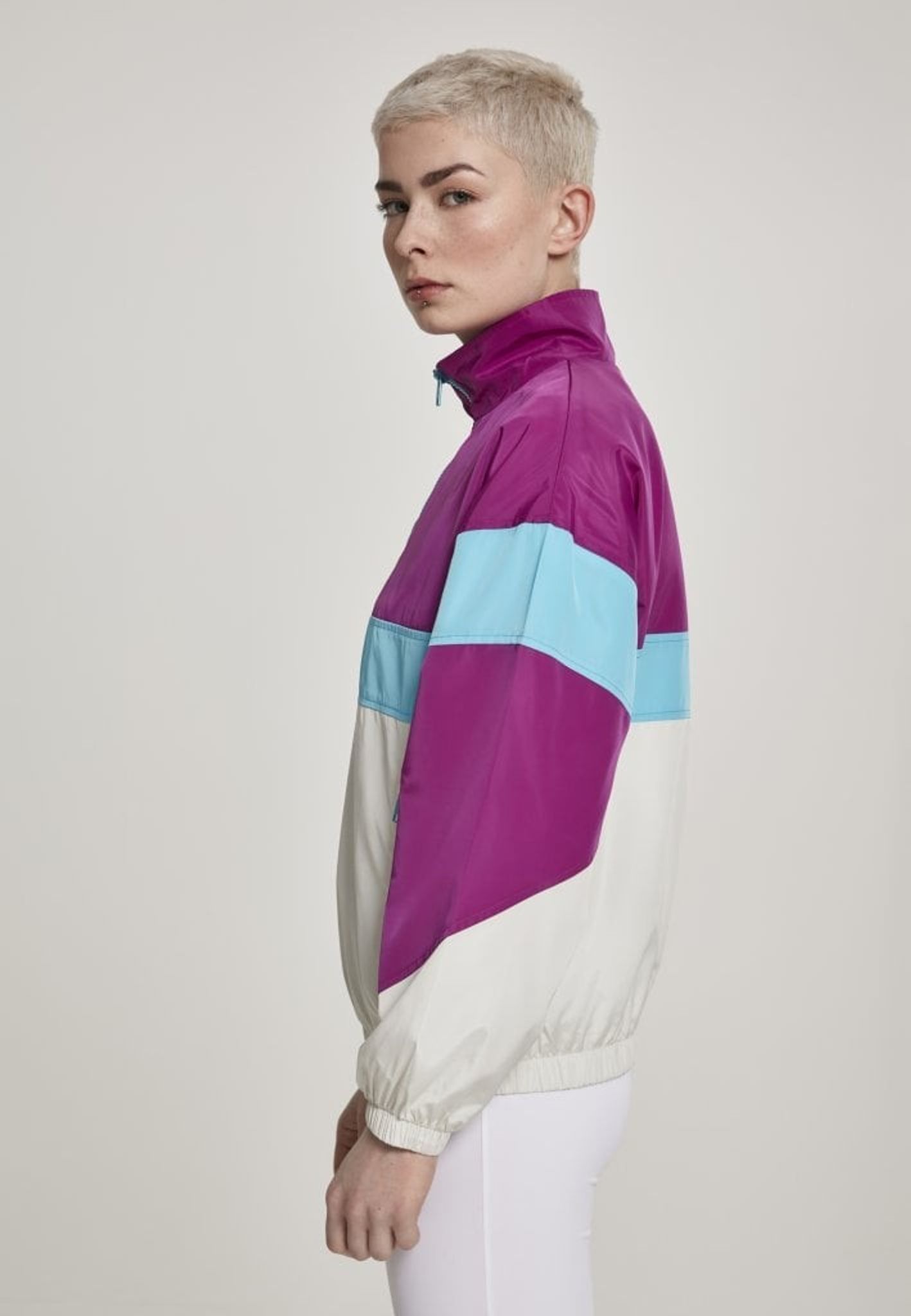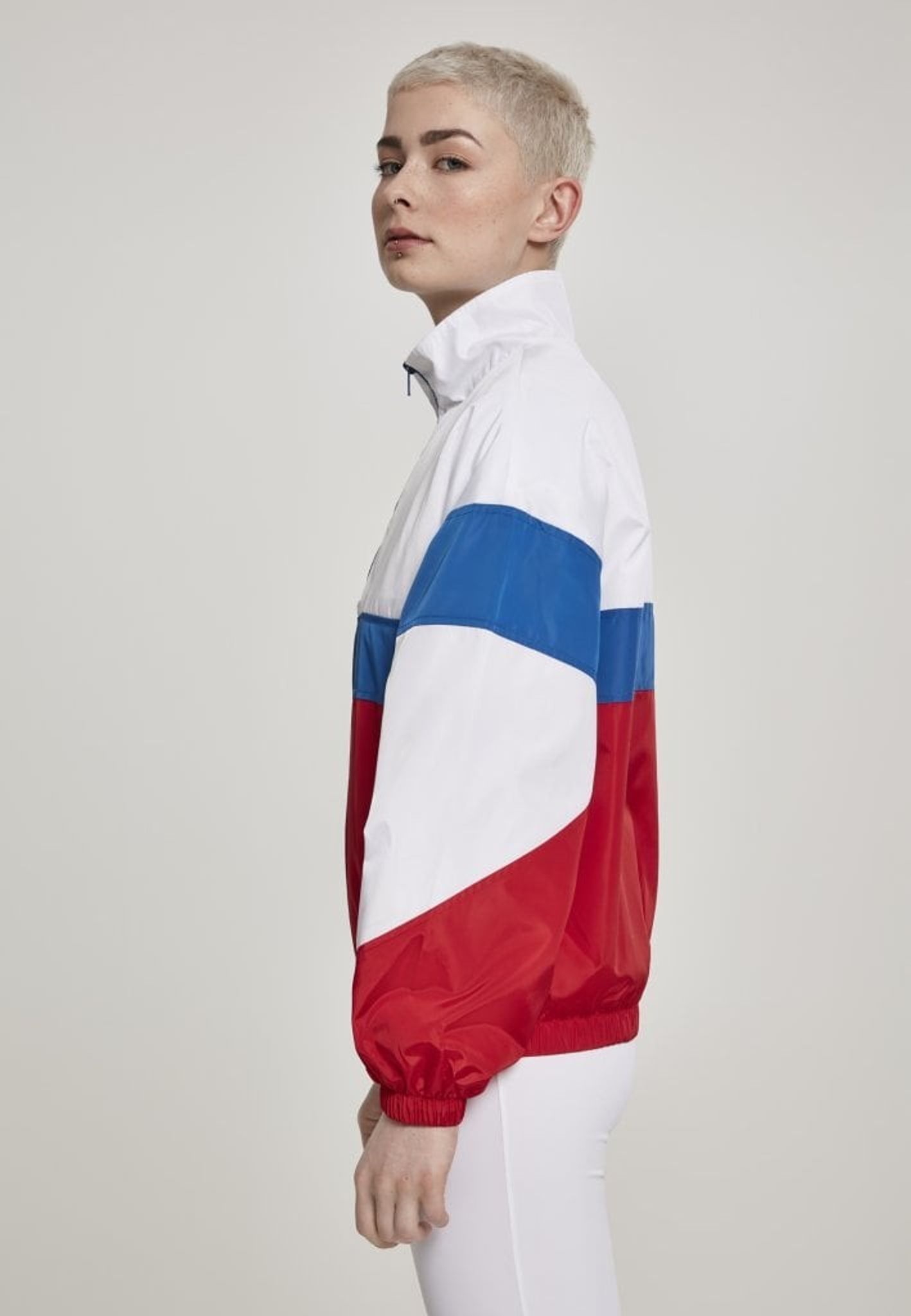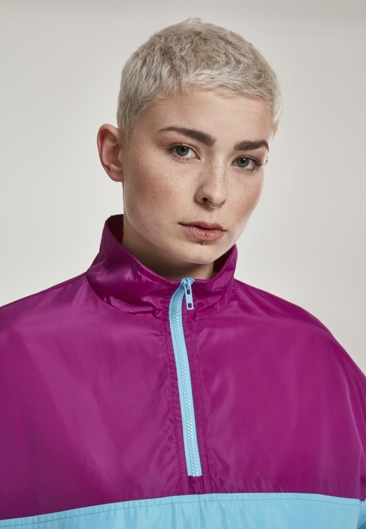 The wind jacket has three colors in wide stripes on the jacket and the zipper has a different color as an extra detail.