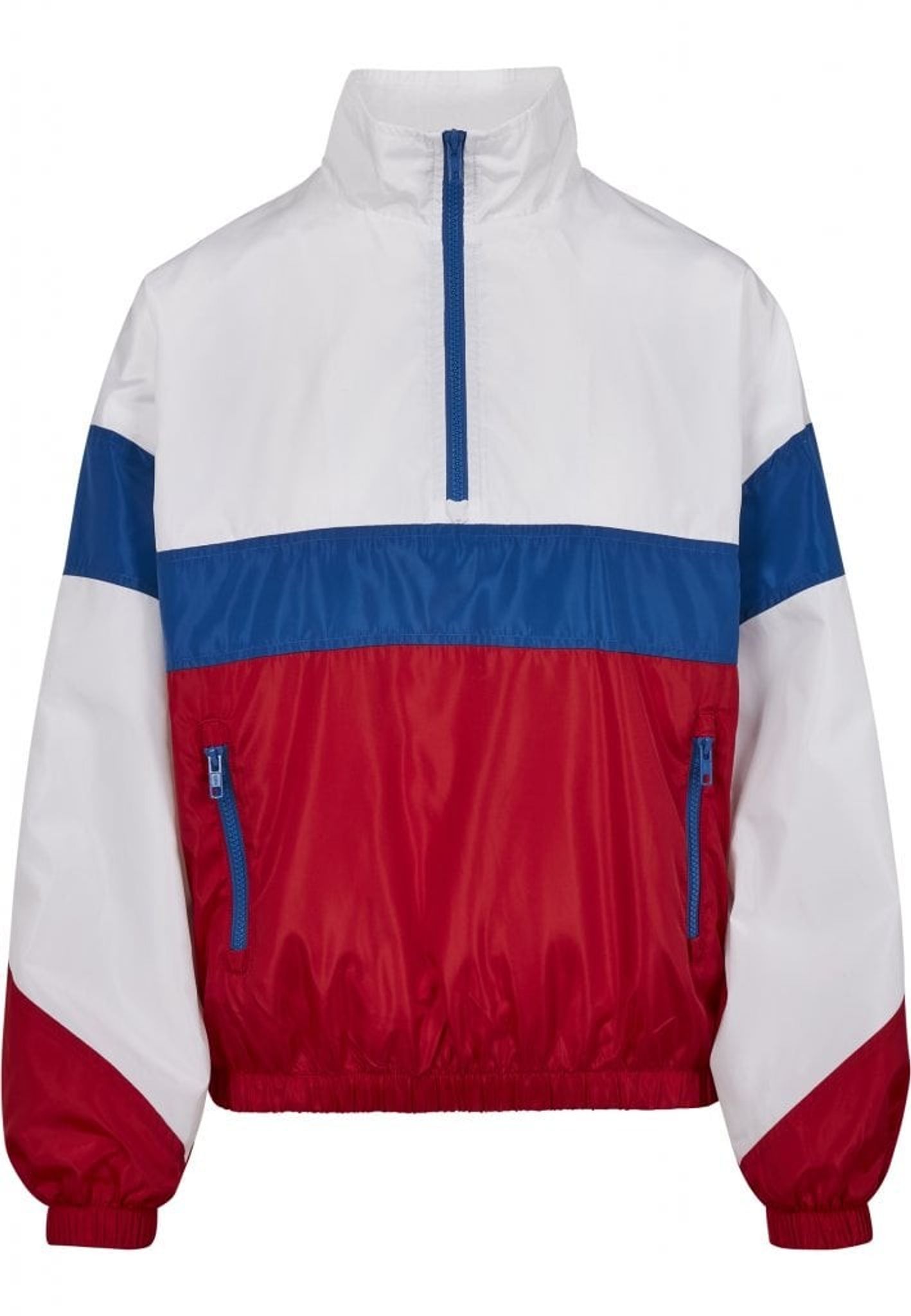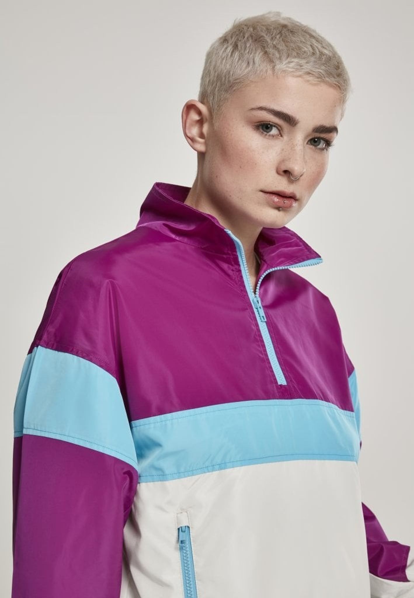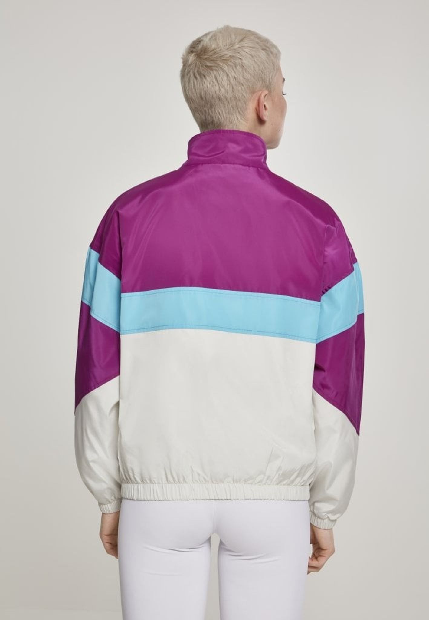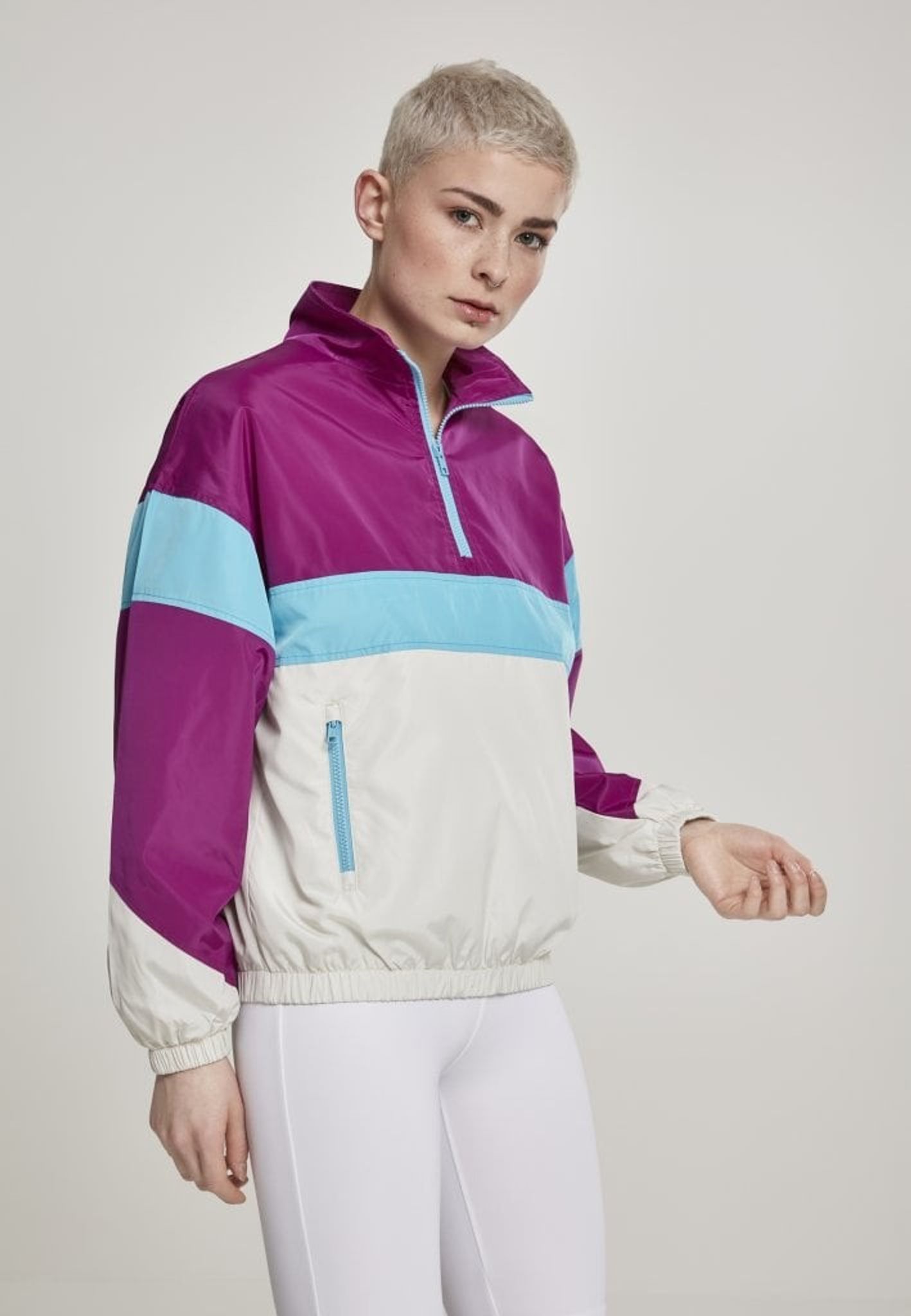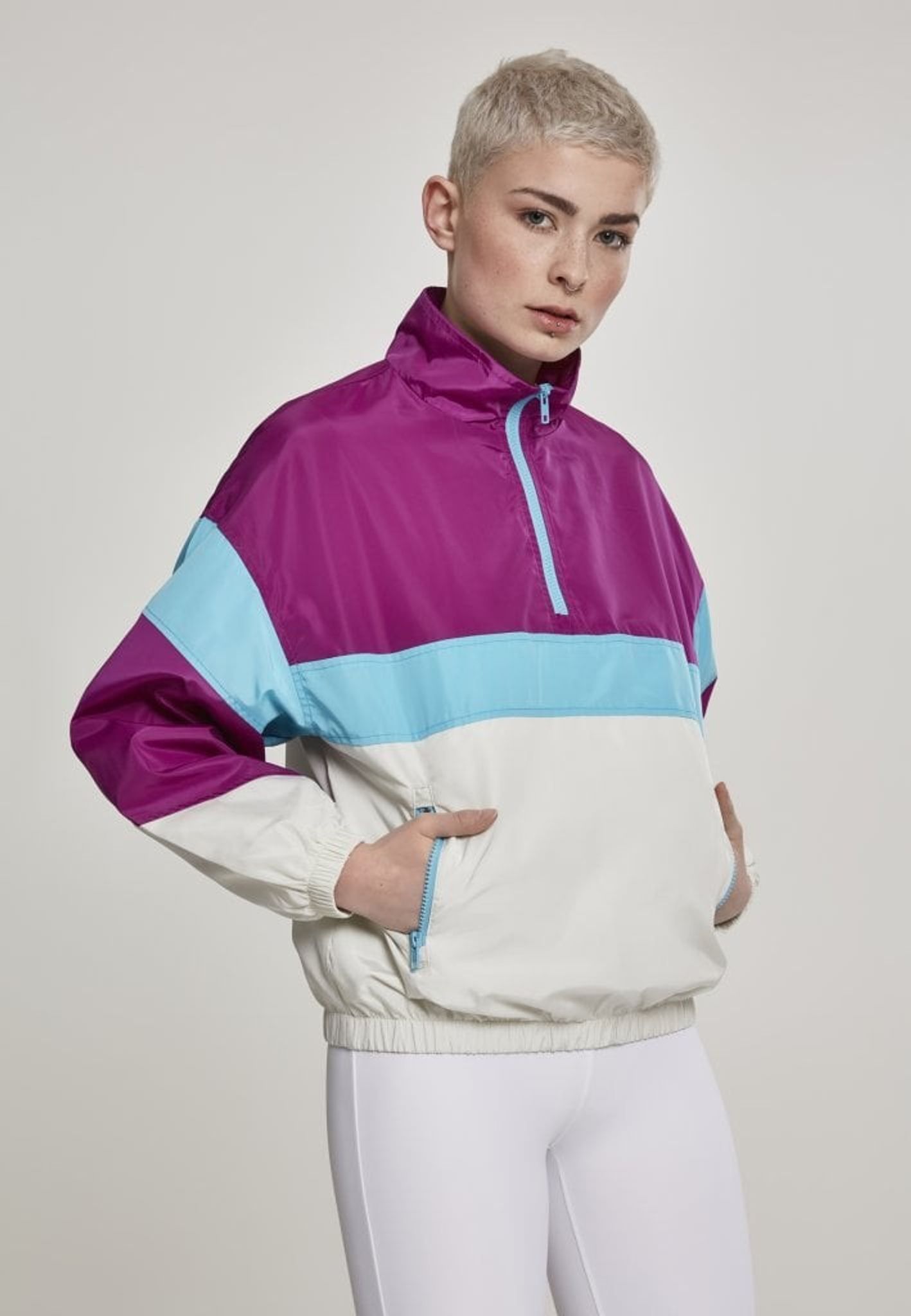 The wind jacket has three colors in wide stripes on the jacket and the zipper has a different color as an extra detail.