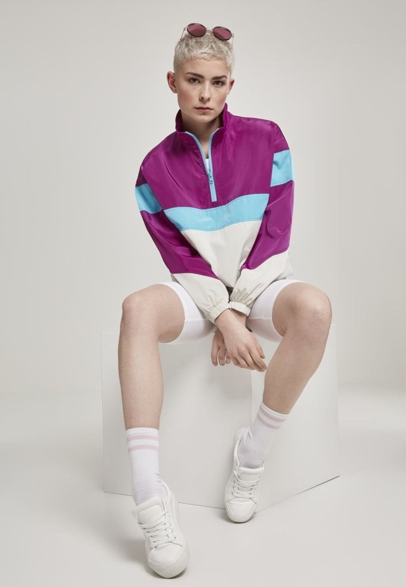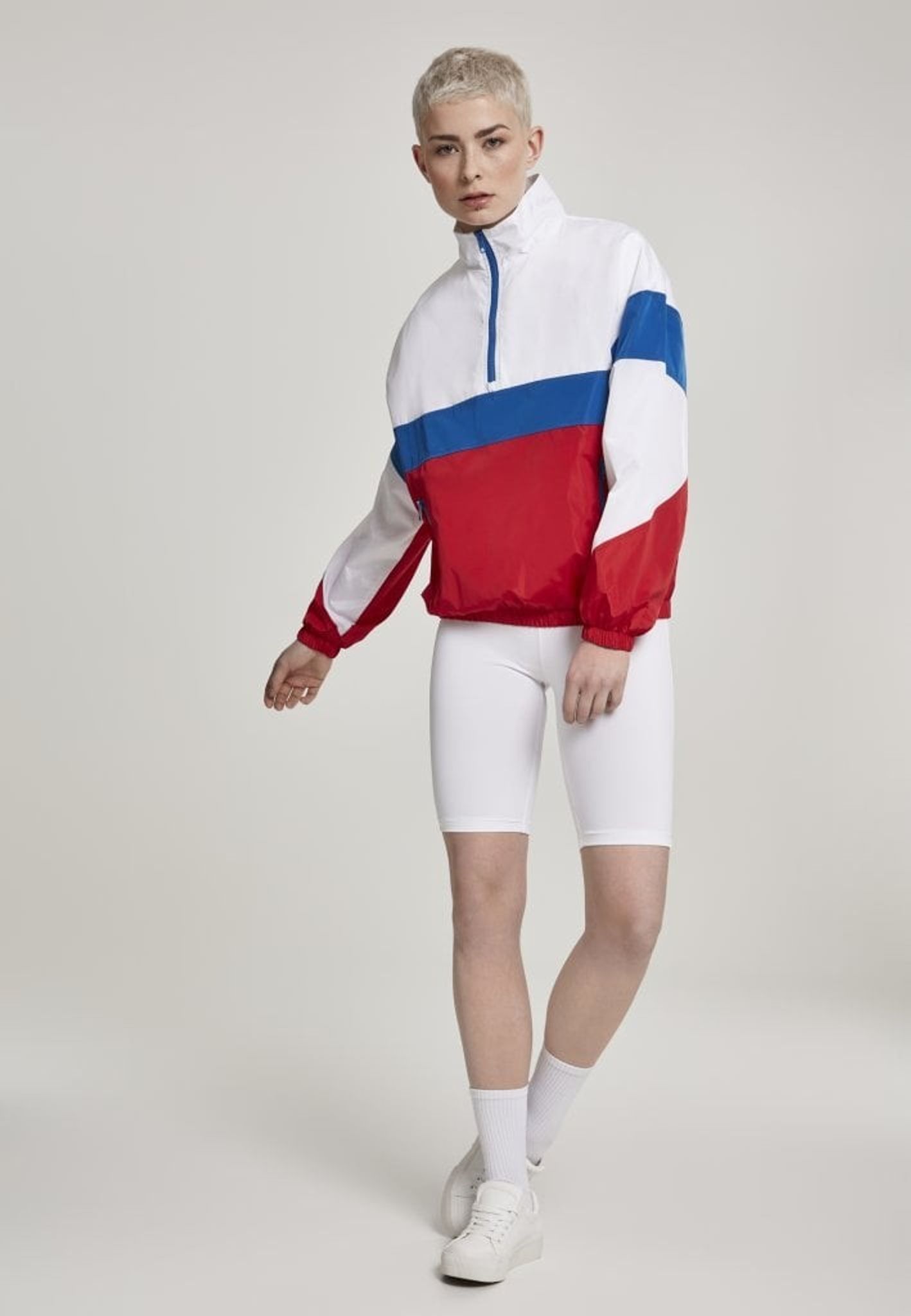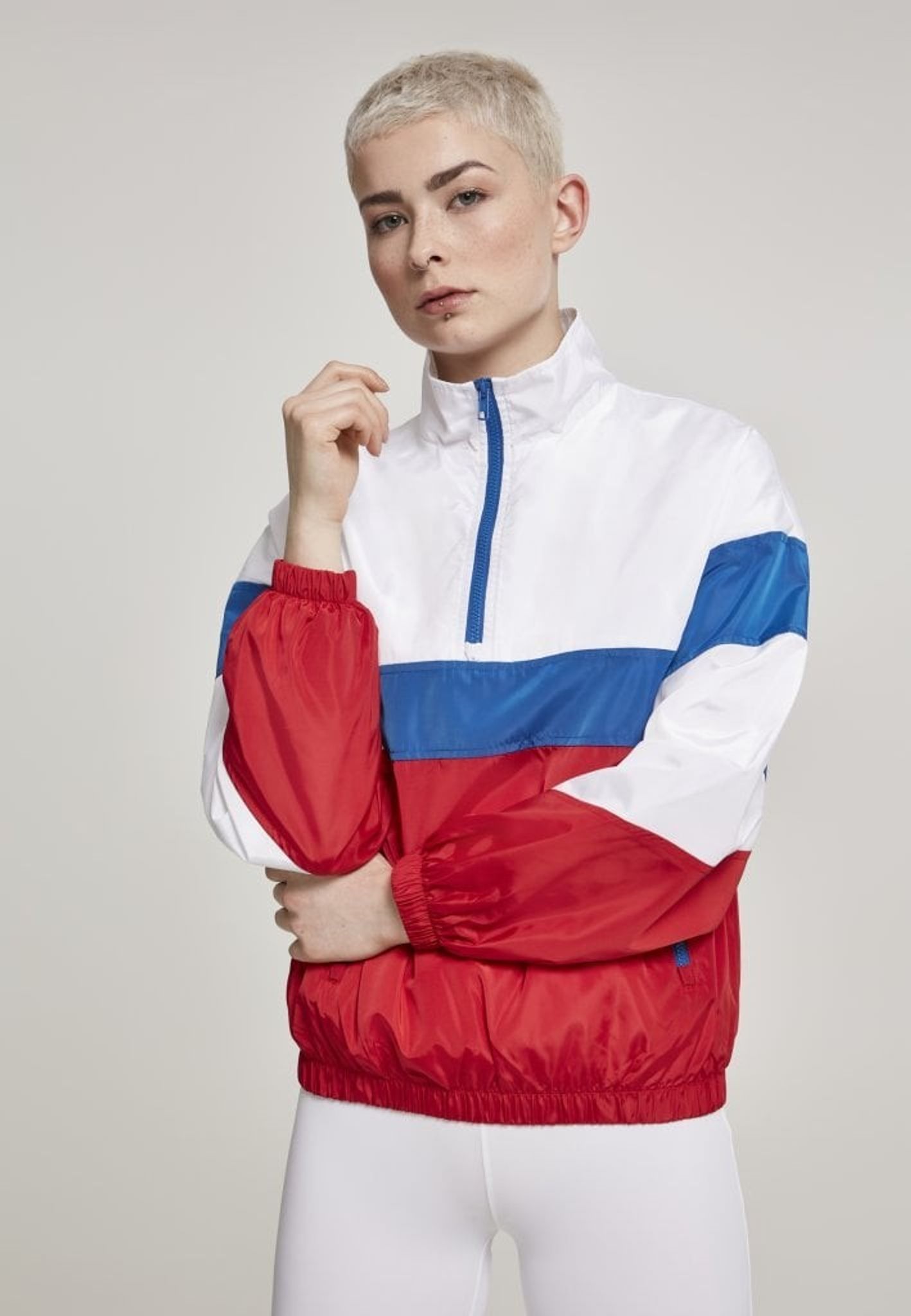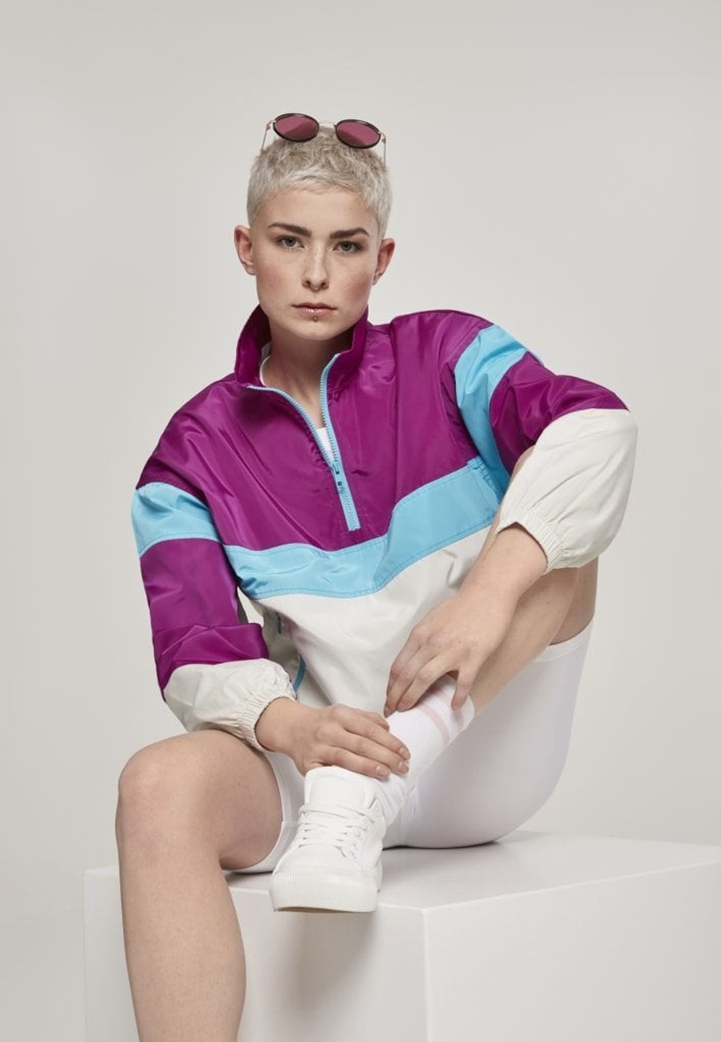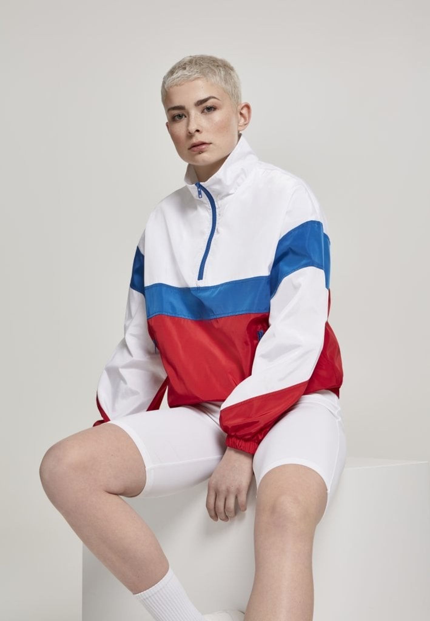 The wind jacket has three colors in wide stripes on the jacket and the zipper has a different color as an extra detail.