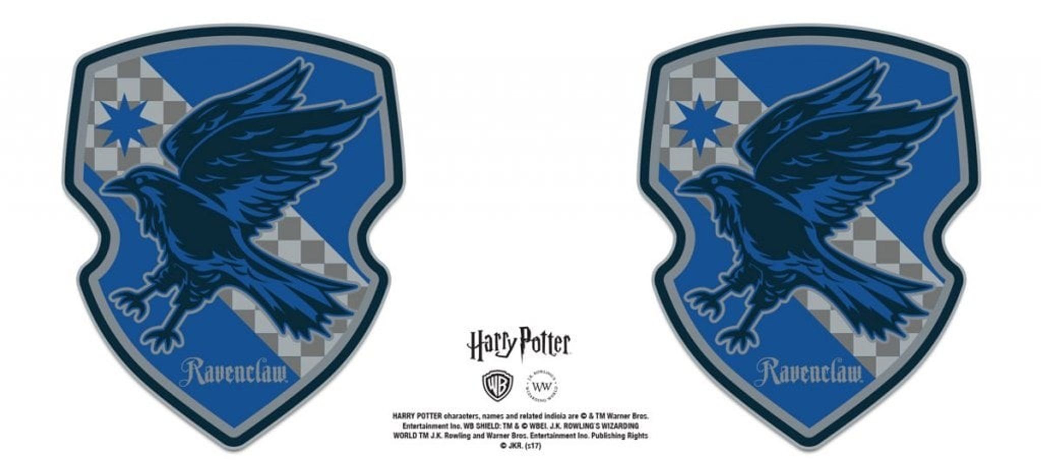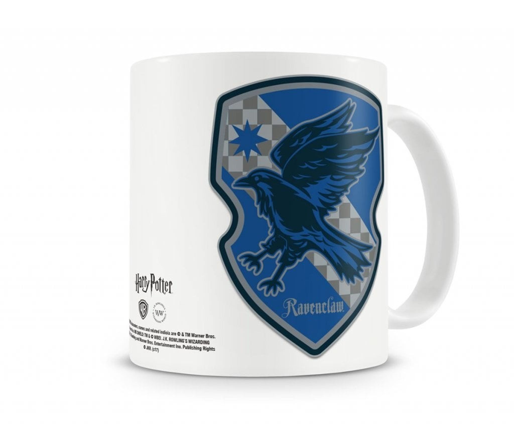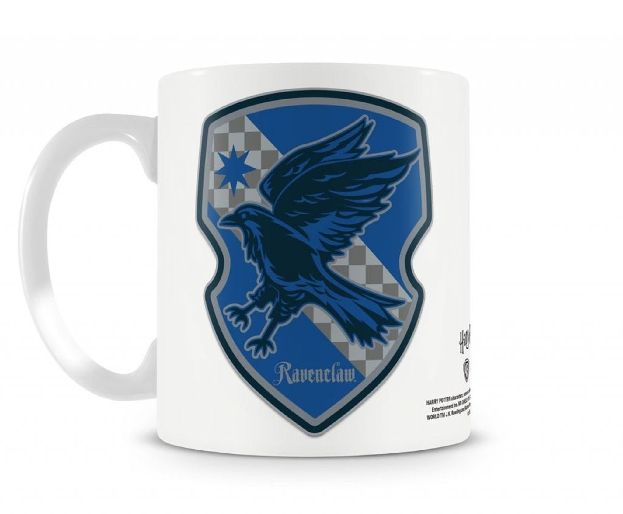 A coffee mug with Ravenclaw's coat of arms. Ravenclaw is one of four dormitories at the Hogwarts School of Wizarding and Witchcraft.