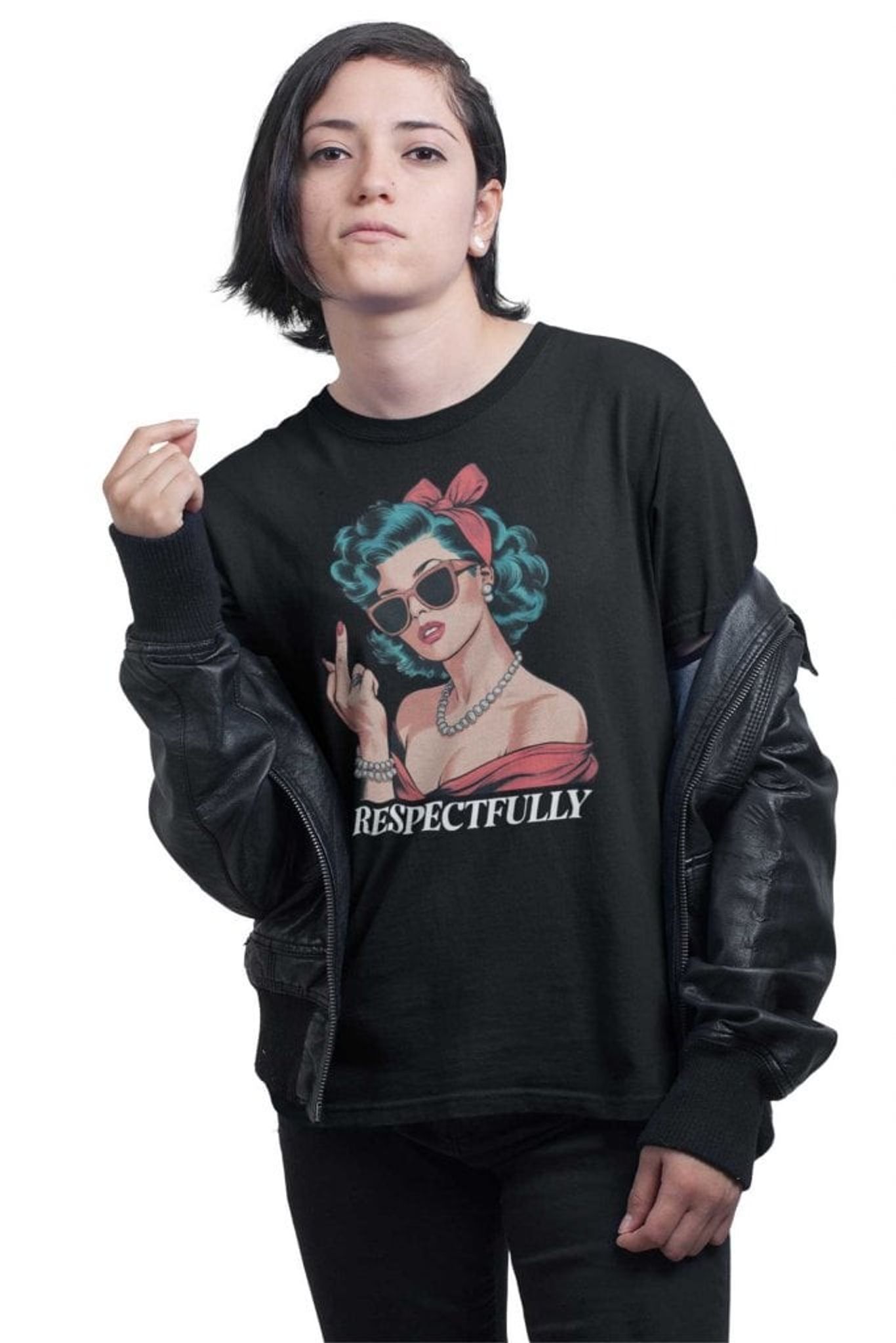 The "RESPECTFULLY" print creates an ironic contrast to the gesture, making the design both playful and powerful. Perfect for those who appreciate a dose of sarcasm in their wardrobe or want to make a subtle but clear statement in their everyday lives.