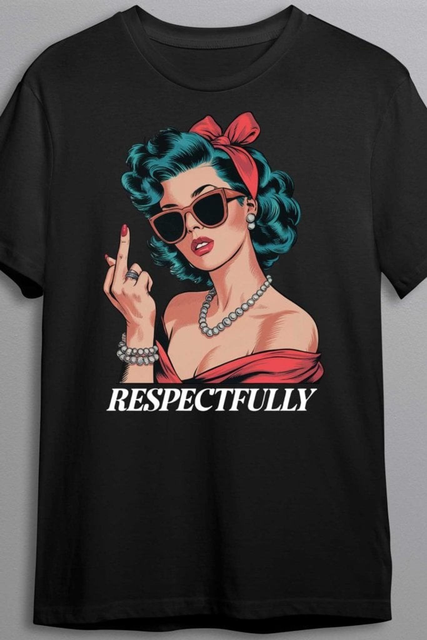 This t-shirt is a bold statement piece for those who want to express themselves with style and attitude. Featuring a retro-inspired pin-up illustration of a confident woman in sunglasses and a pearl necklace delivering a clear yet elegant greeting, vintage aesthetics are combined with modern humor.