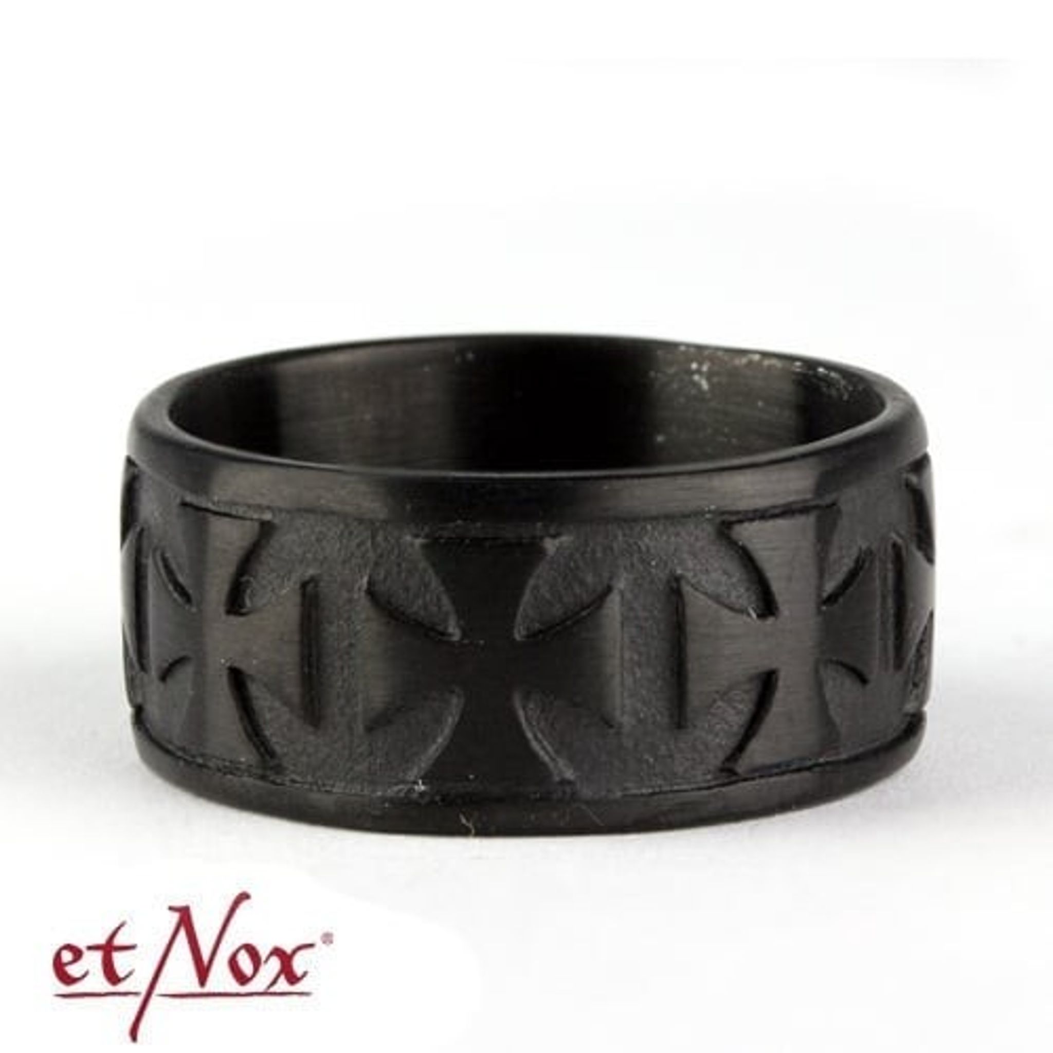 A black ring with a cross all around the ring. The ring is made of stainless steel.