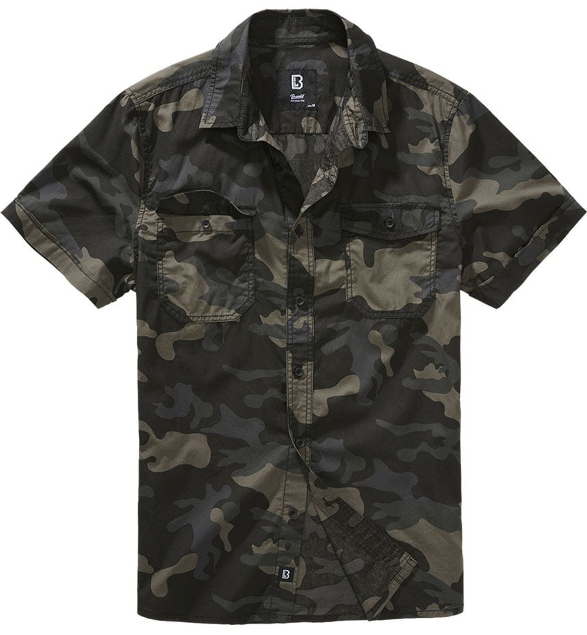 Short-sleeved shirt in soft and thin cotton fabric. The fabric is patterned in discreet dark camo.