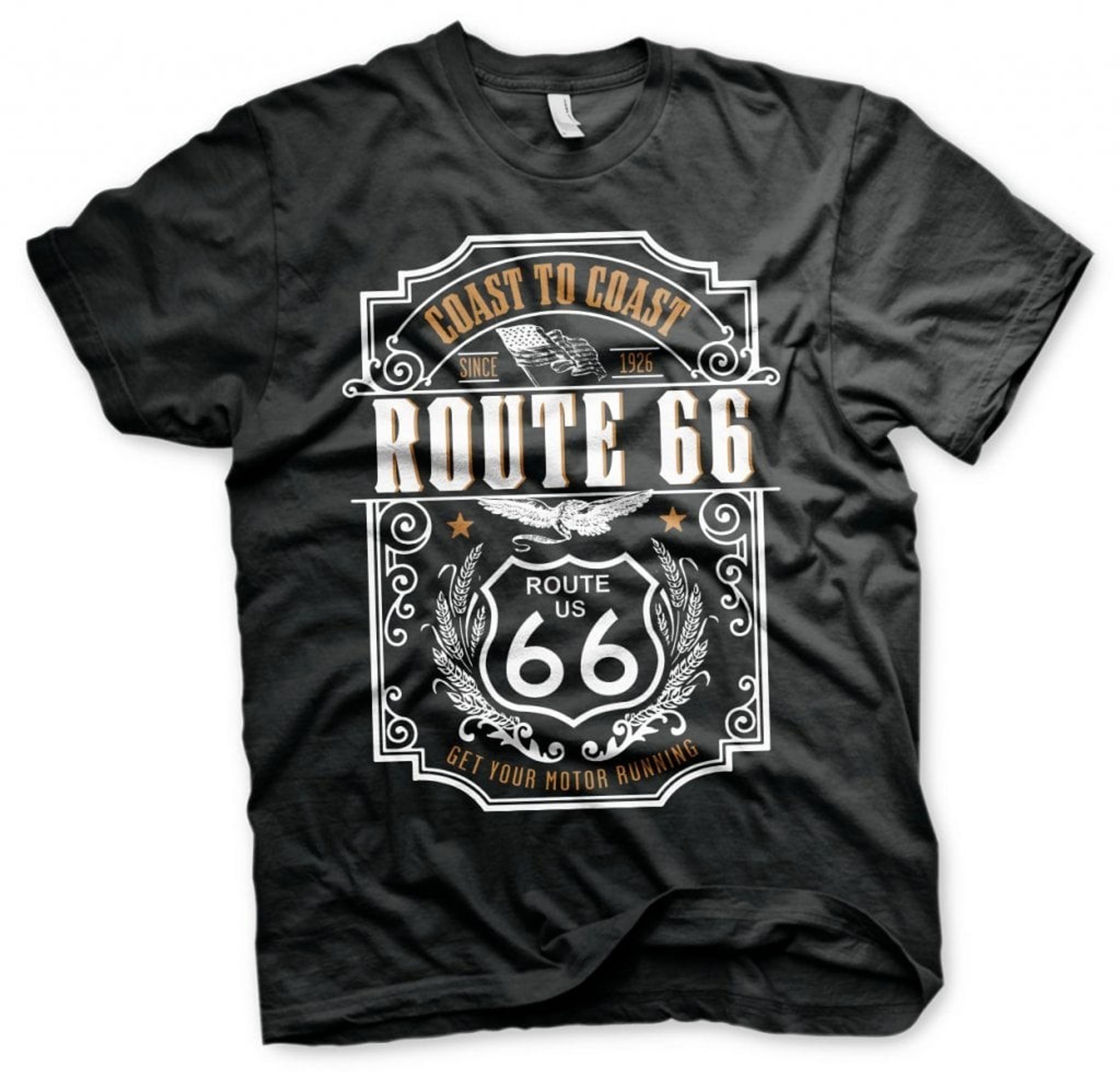 Welcome to Route 66-the legendary country road that extends from east to west, and which is now represented on this cool t-shirt! With a large and eye-catching motif similar to the cover of a whiskey bottle, this t-shirt is perfect for those who love adventure and freedom.
