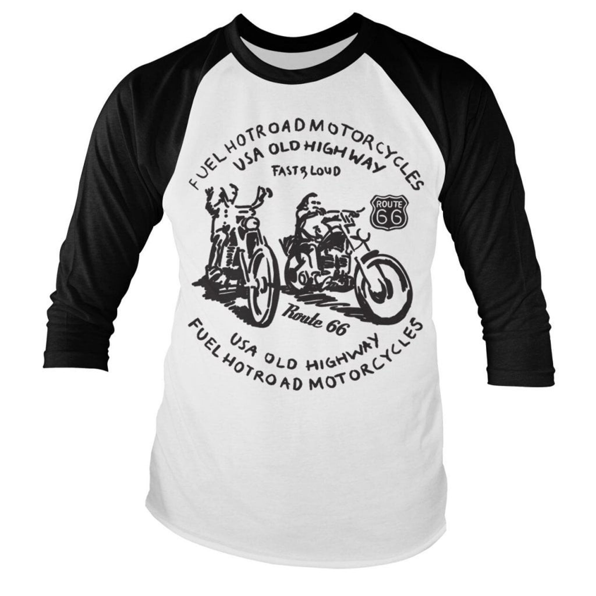 Route 66 is a country road in the USA but has become a classic symbol all over the world, not least in motorcycle circles. It is therefore no coincidence that this Route 66 longsleeve with 3/4 long sleeves also has a motif with two motorcyclists sliding along the country road.