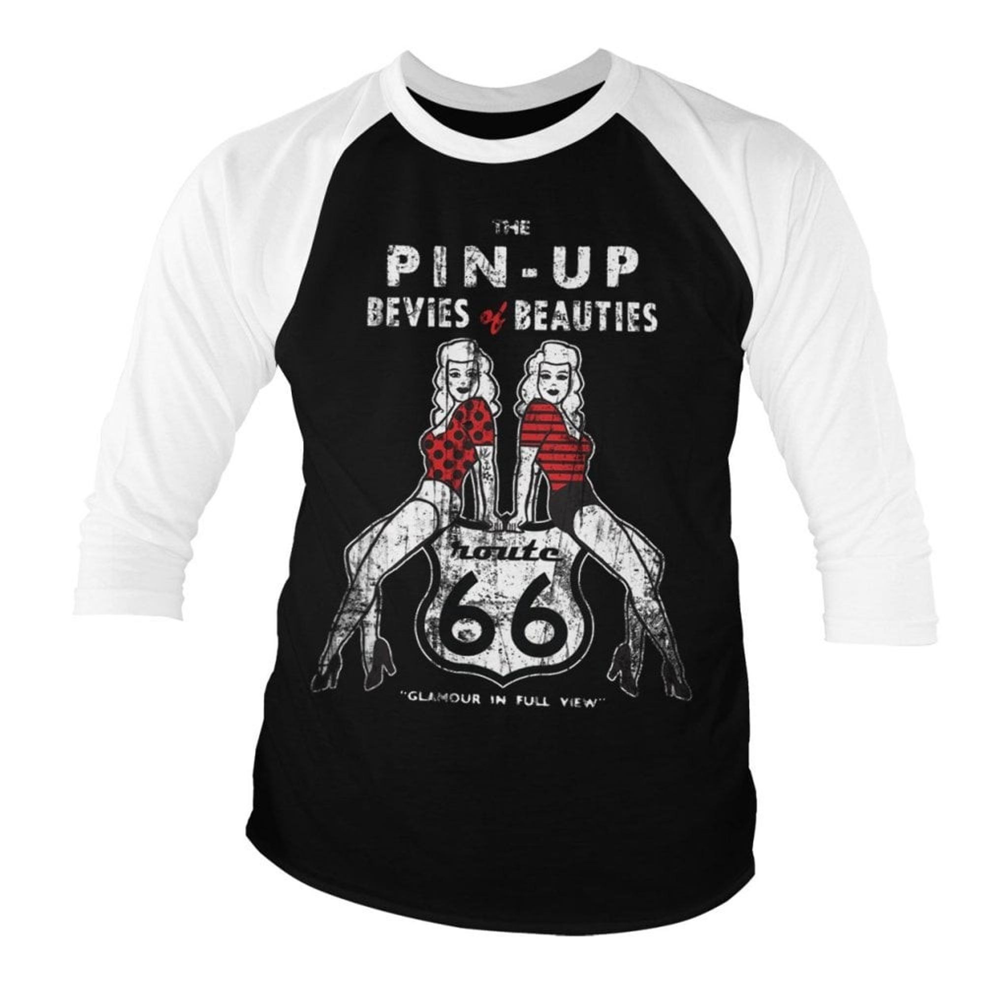 Longsleeve with 3/4 long sleeves and large print over the front. The print shows two drawn pin-up models leaning against the Route 66 classic logo.