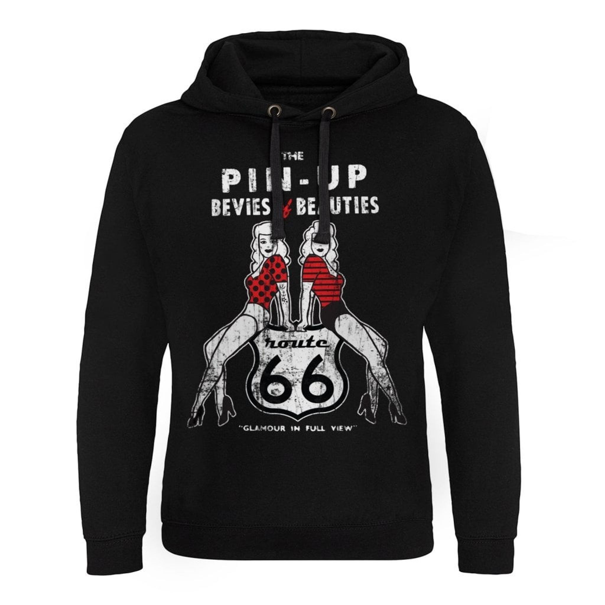 Hoodie with a worn motif of two pin-up models posing leaning against the classic logo from the American country road Route 66.