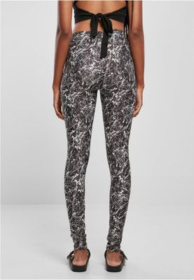 A pair of black leggings that have scratches or splashes of color around the fabric.