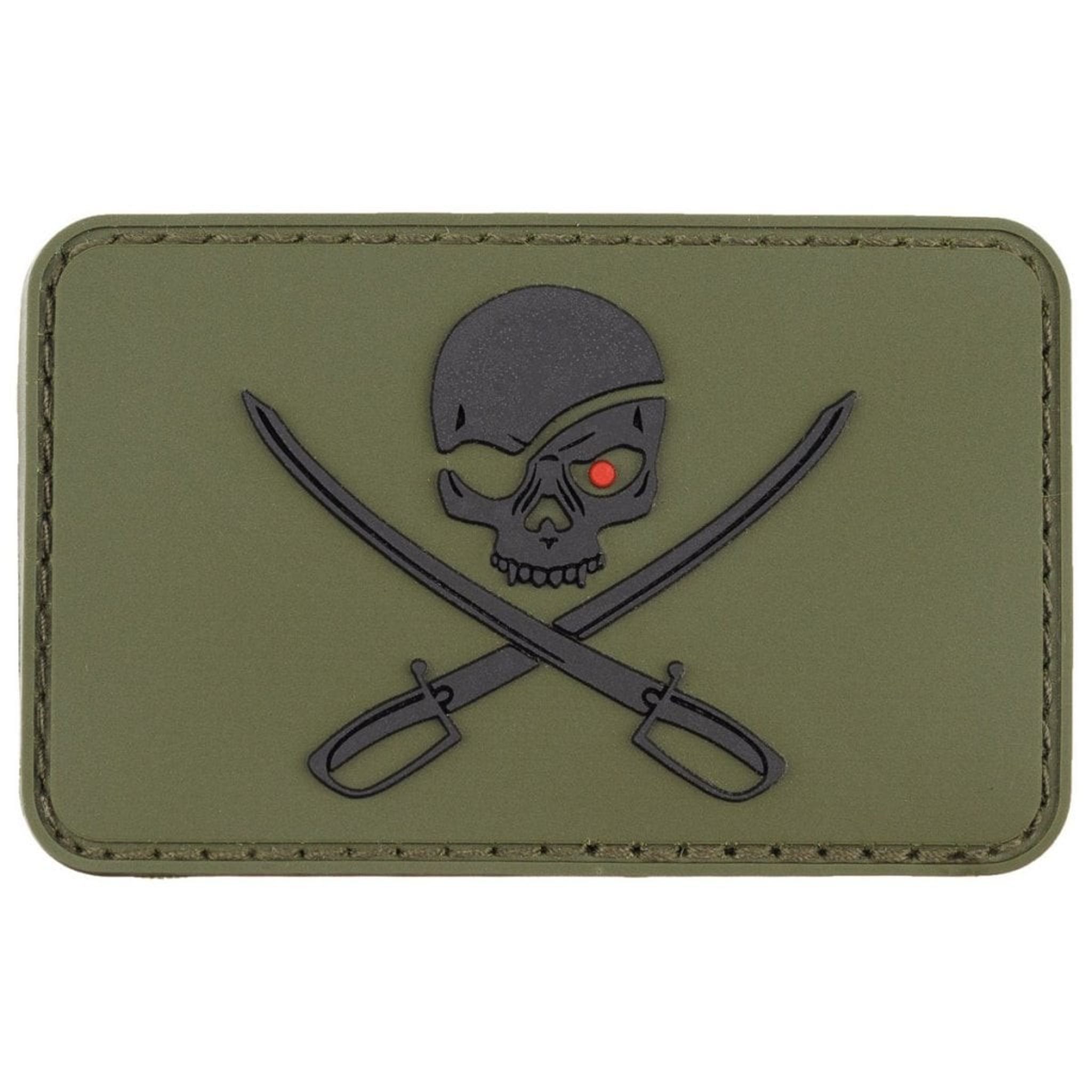 An olive green rubber patch with a Jolly Roger in 3D motif.