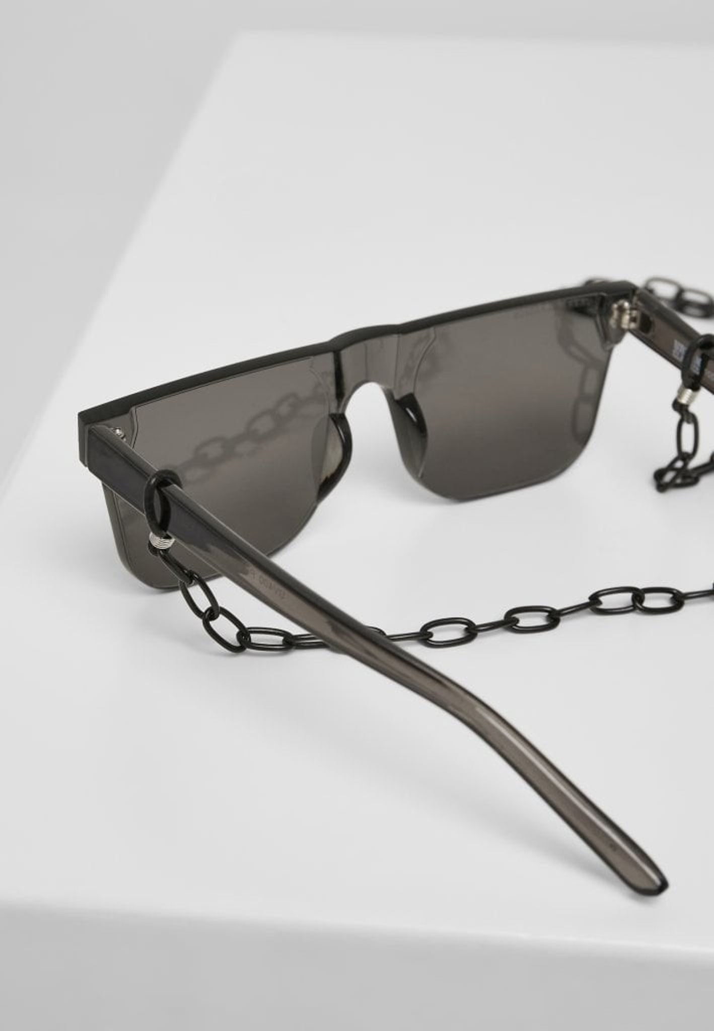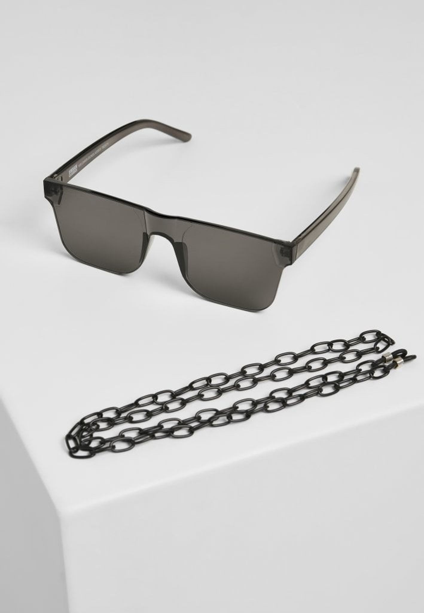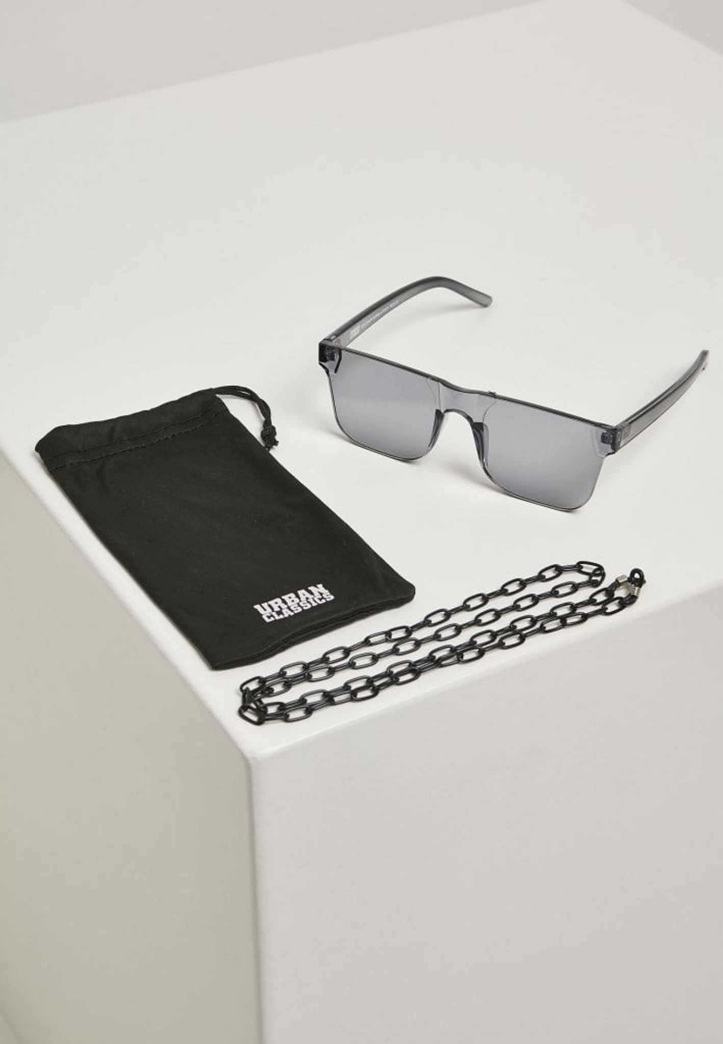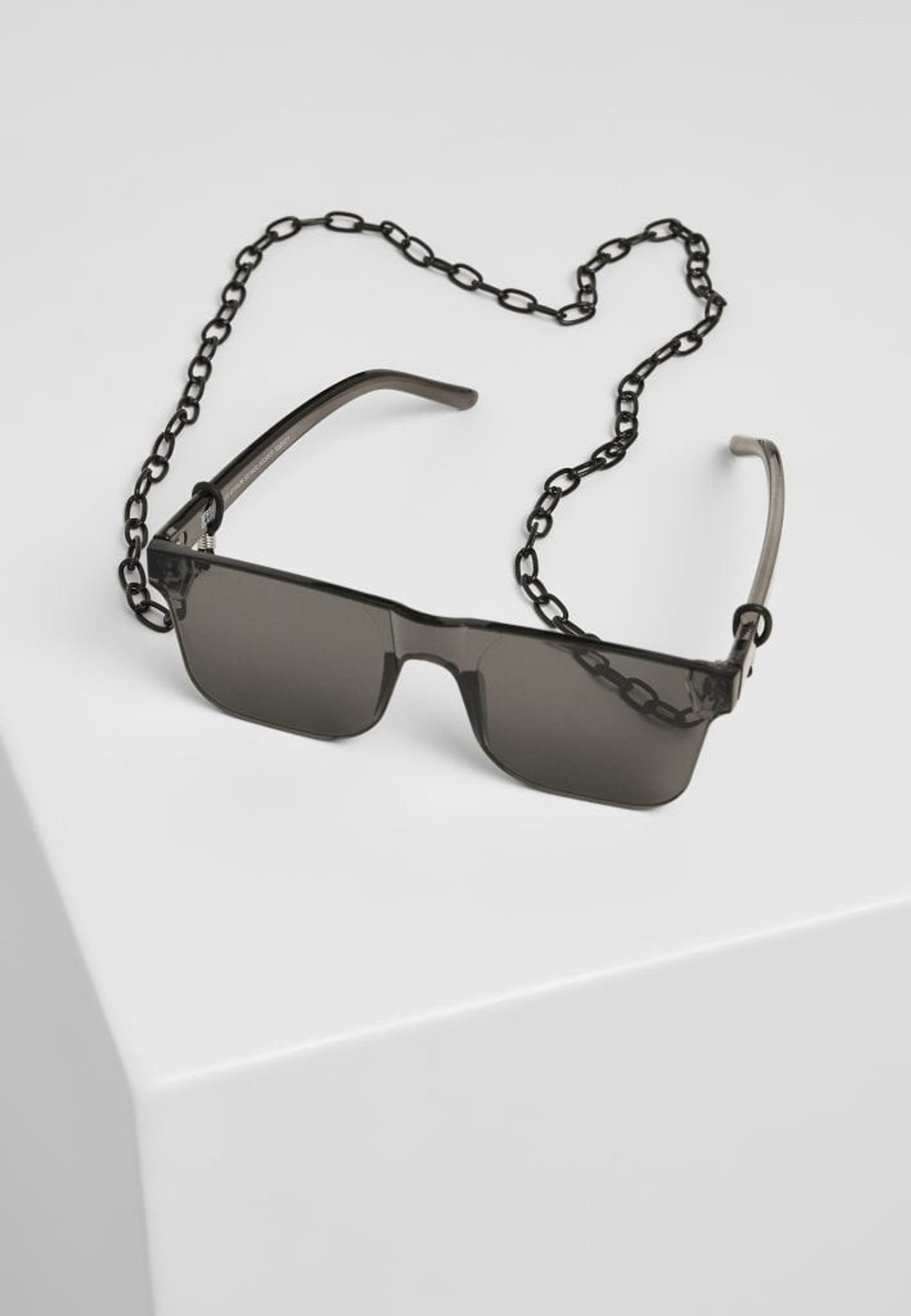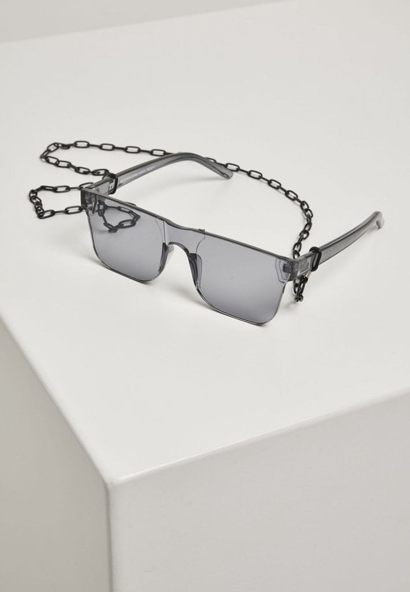 A pair of stylish sunglasses with square glasses and transparent arches. To the sunglasses you also get a chain that you can attach the glasses to around the neck.