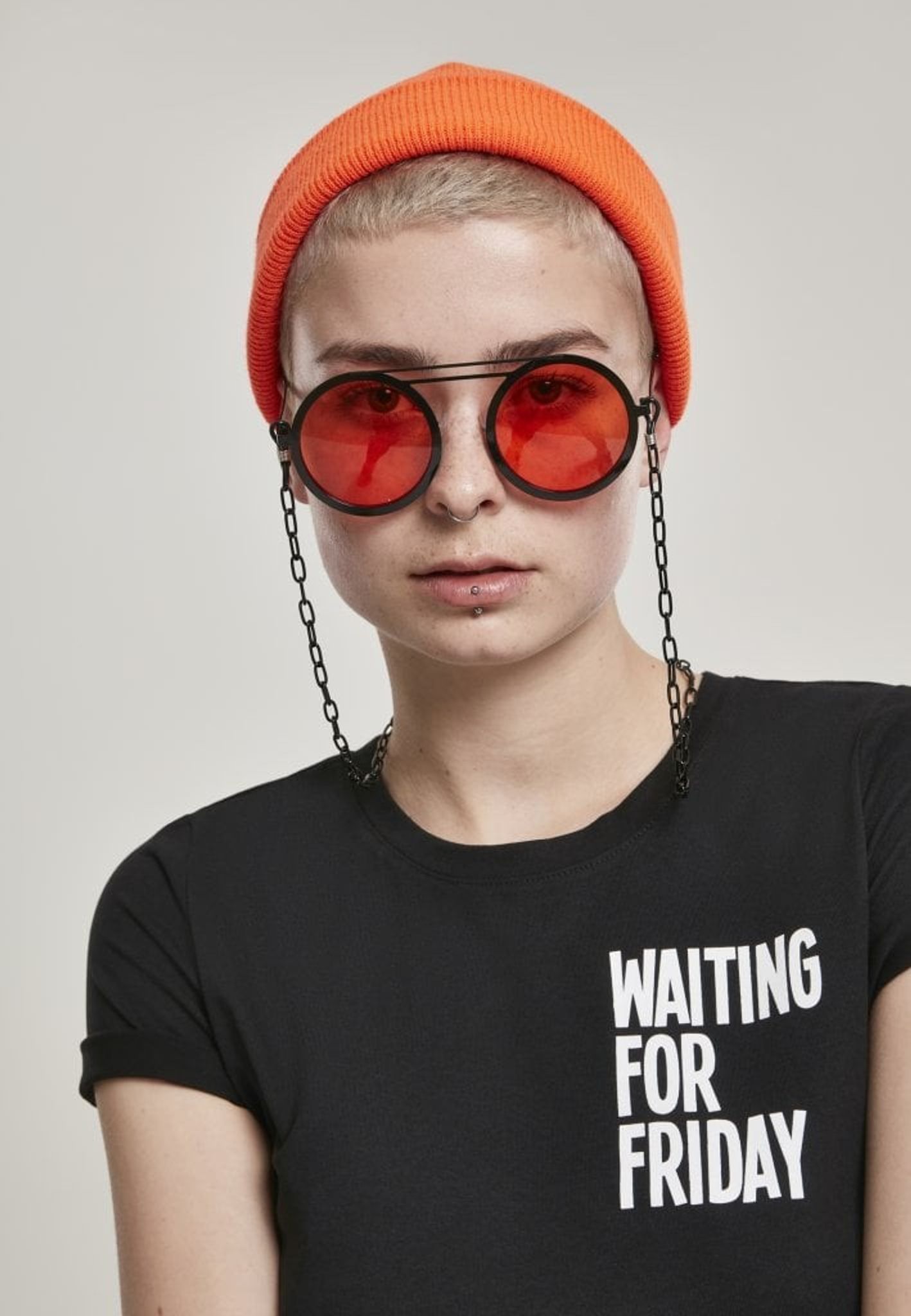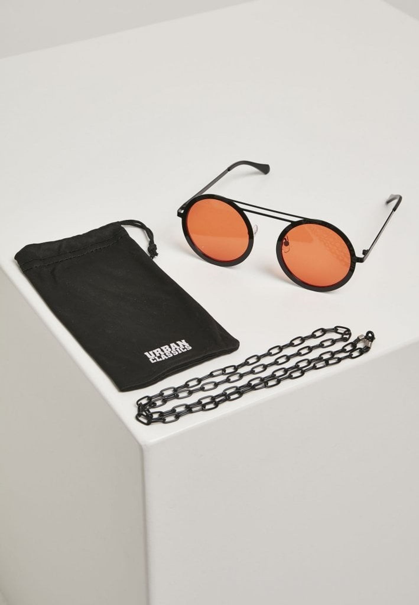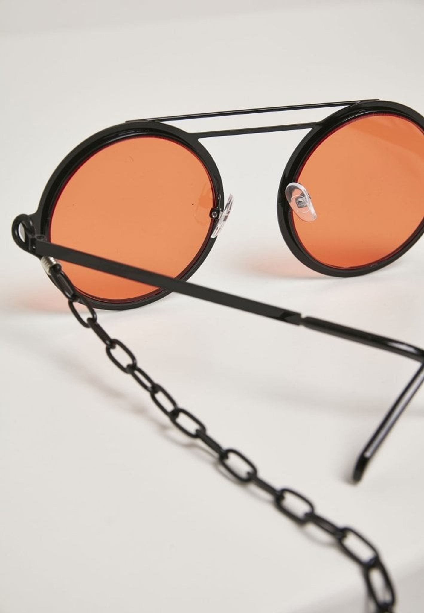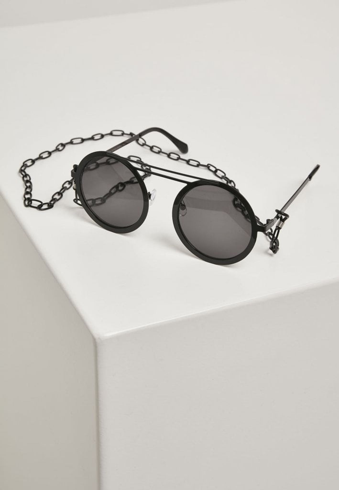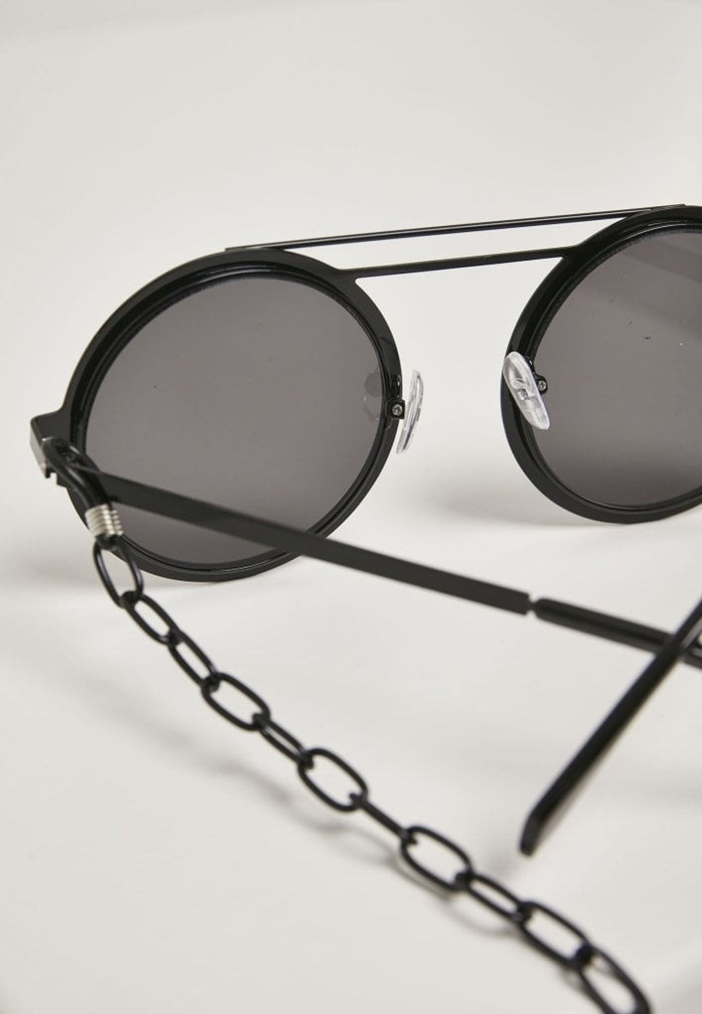 A pair of sunglasses with round glasses and chain that can be attached to the arches.