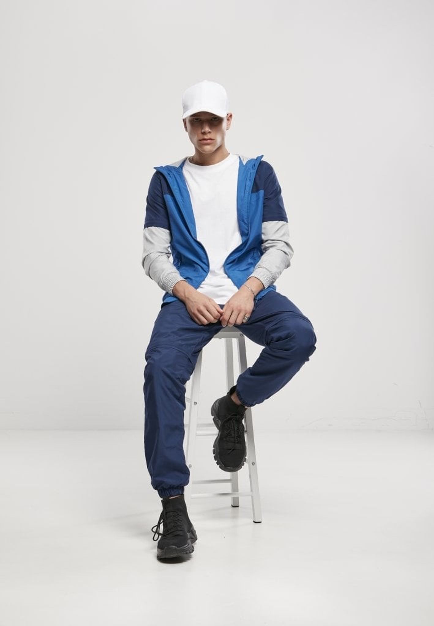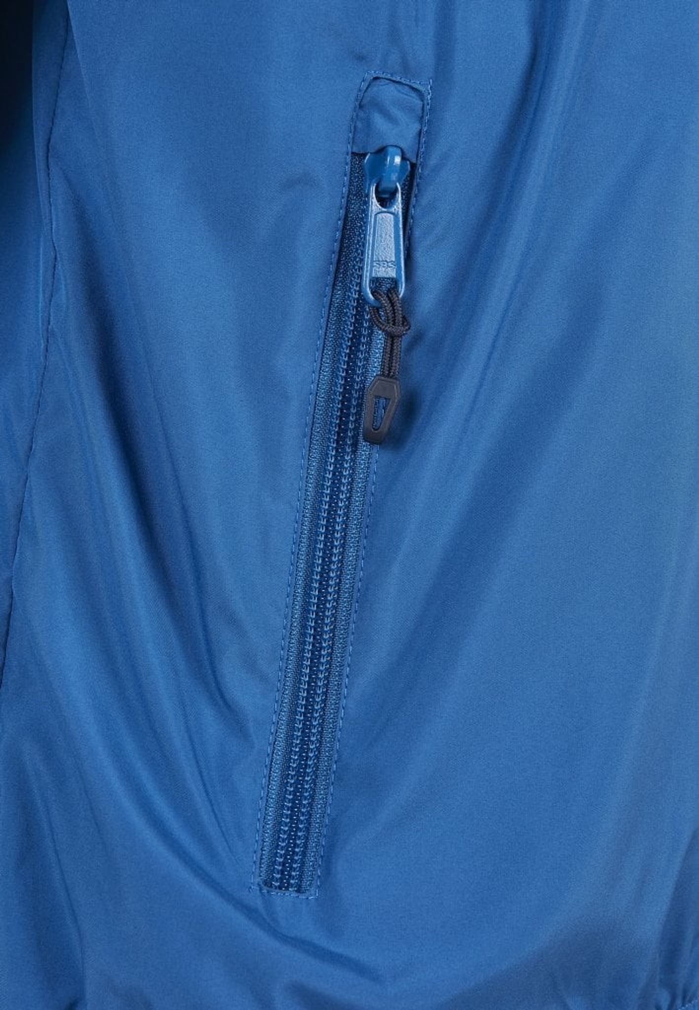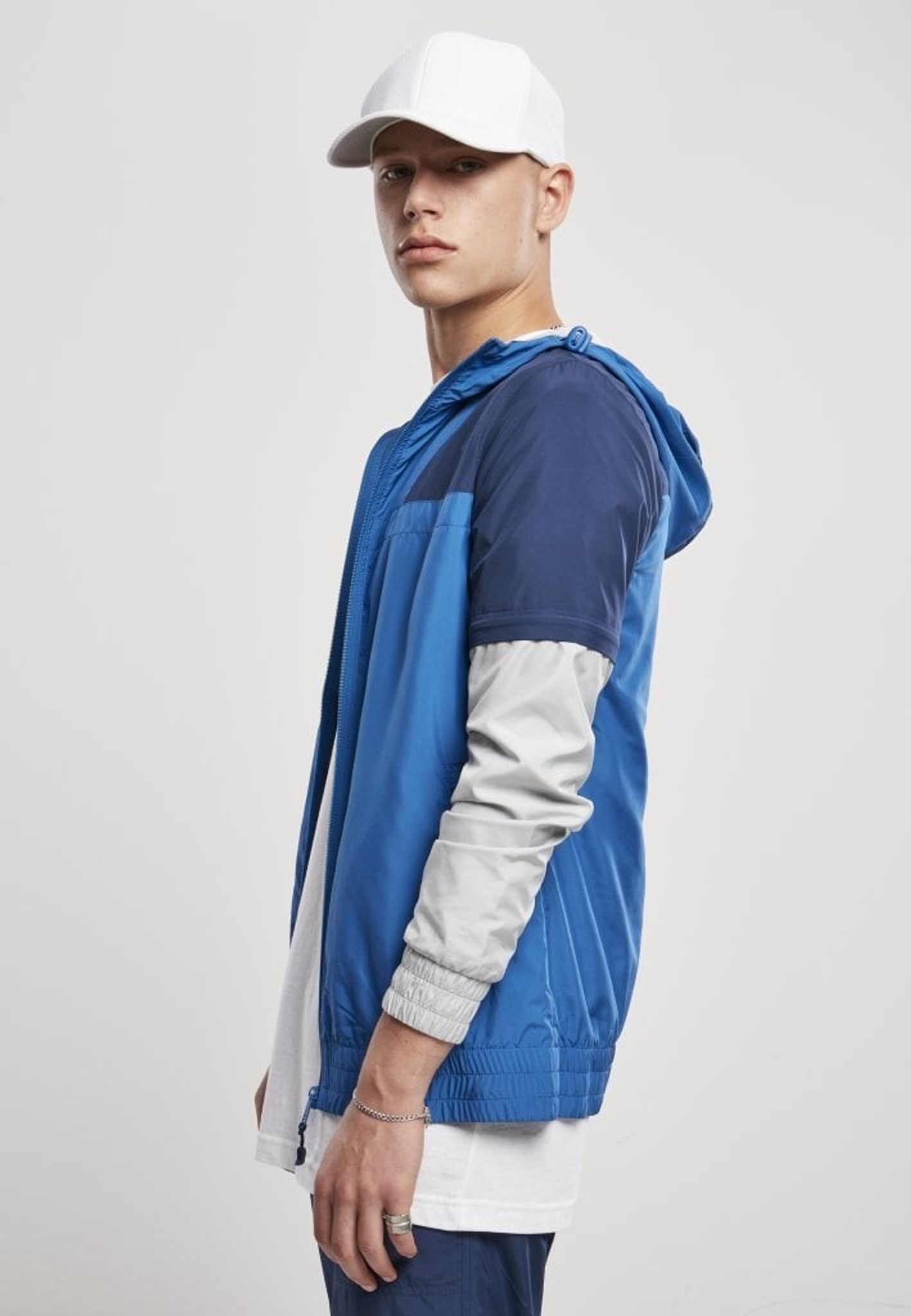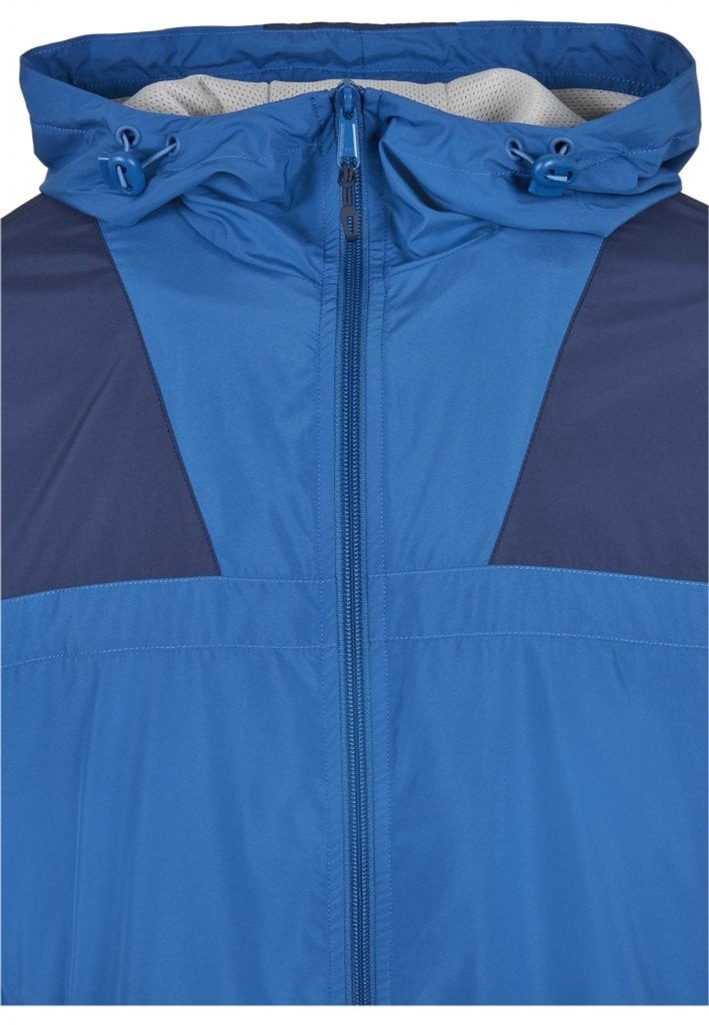A beautiful sporty tricolor hooded jacket. The shoulder area is dark blue, the front and back are medium blue and the lower part of the arms is gray.