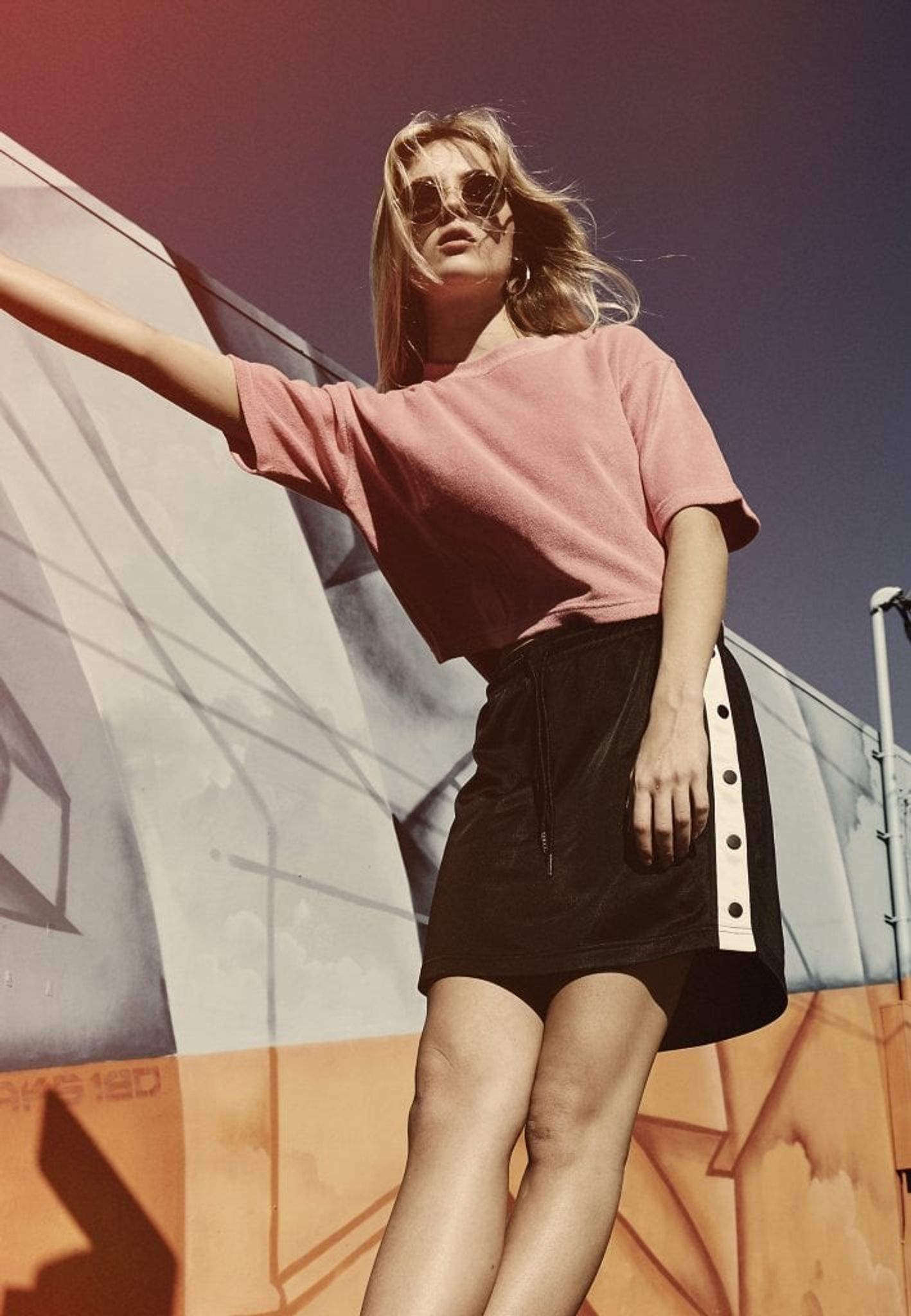 This is a short sporty skirt with a color stripe on the side with fake push buttons.