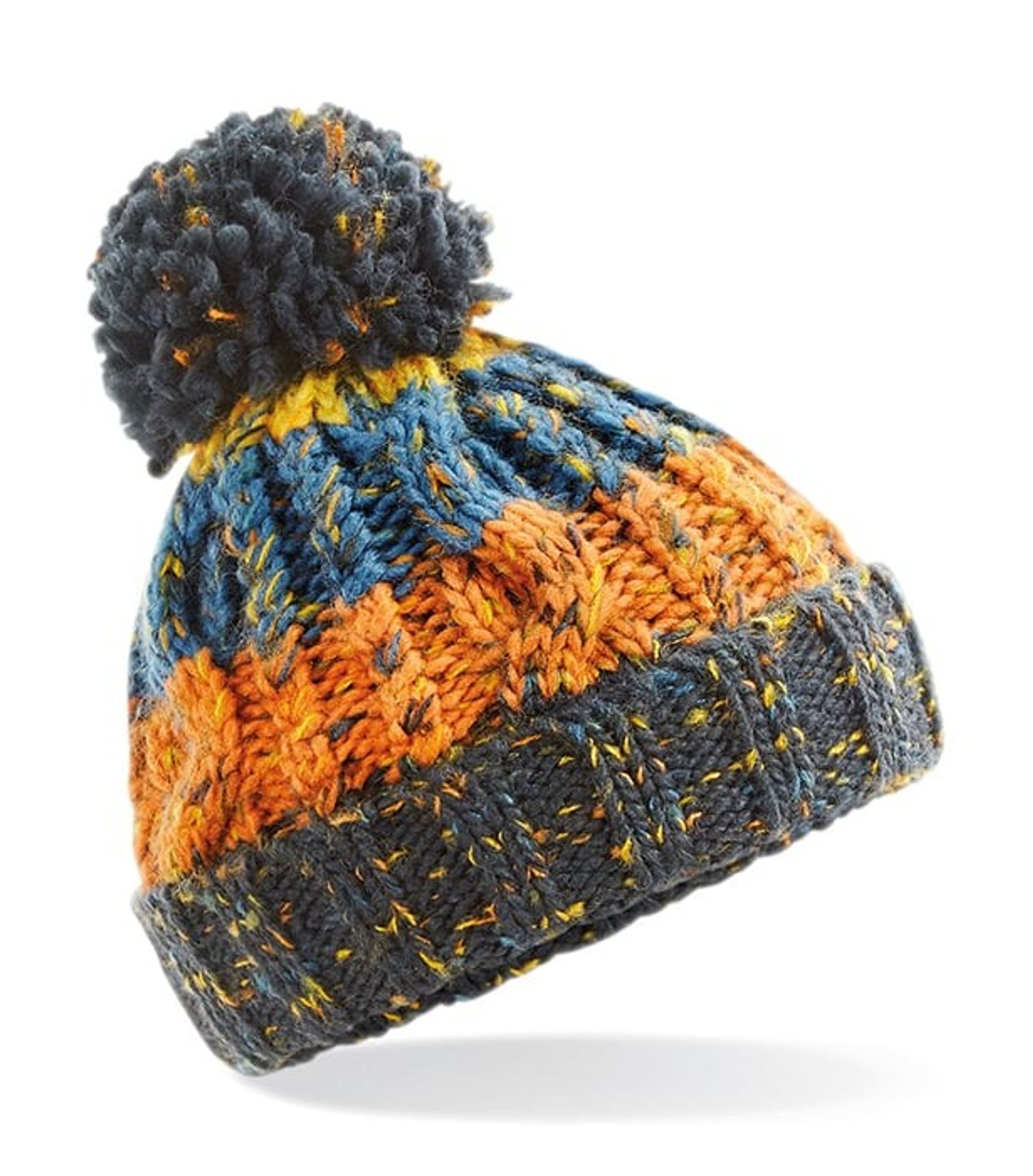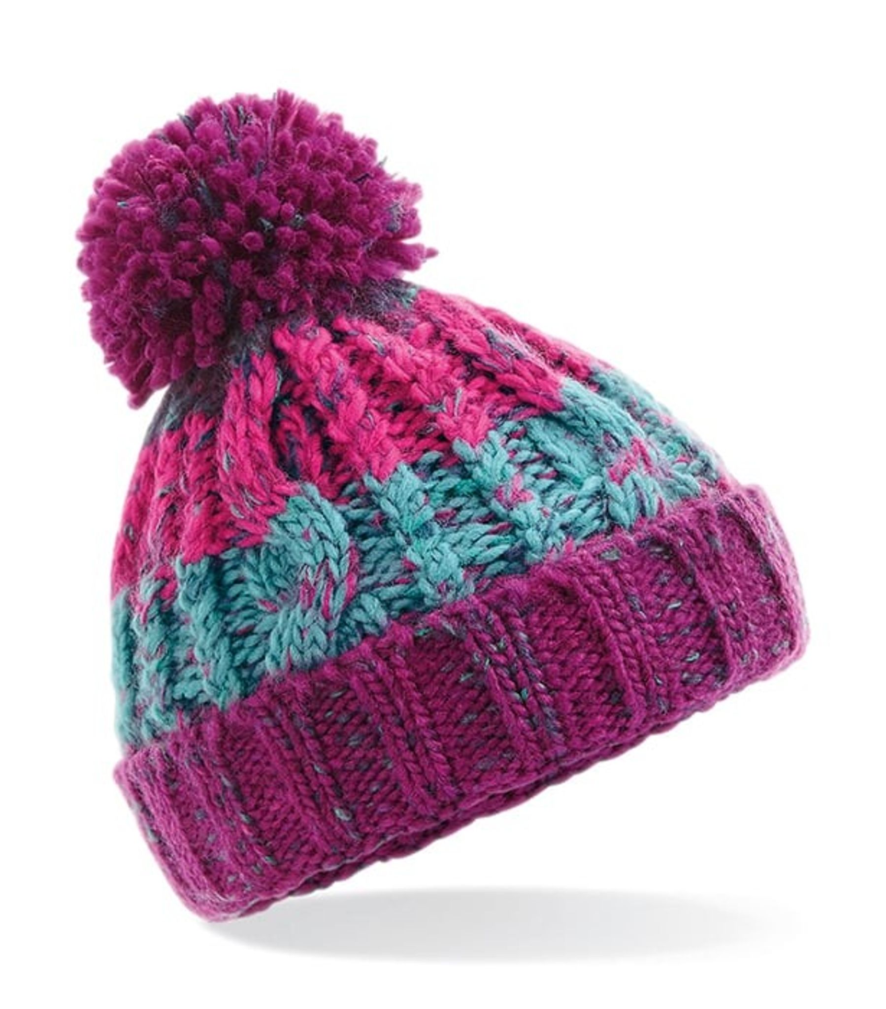 A tough multicolored cable knit hat in a small size. The hat has a folded edge with a large solid tassel. The hat has a soft lining that keeps the ears warm.