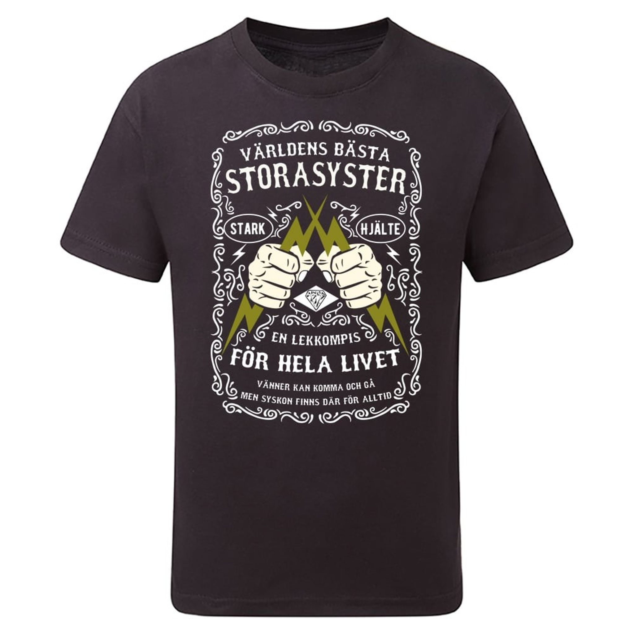 En riktigt fin t-shirt för den starke storasystern. Först den meriterande texten "Världens bästa storasyster" följt av texten "En lekkompis för hela livet. Vänner kan komma och gå men syskon finns där för alltid."