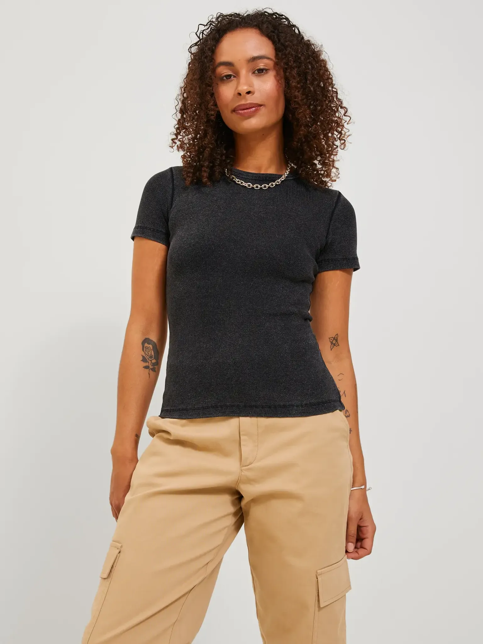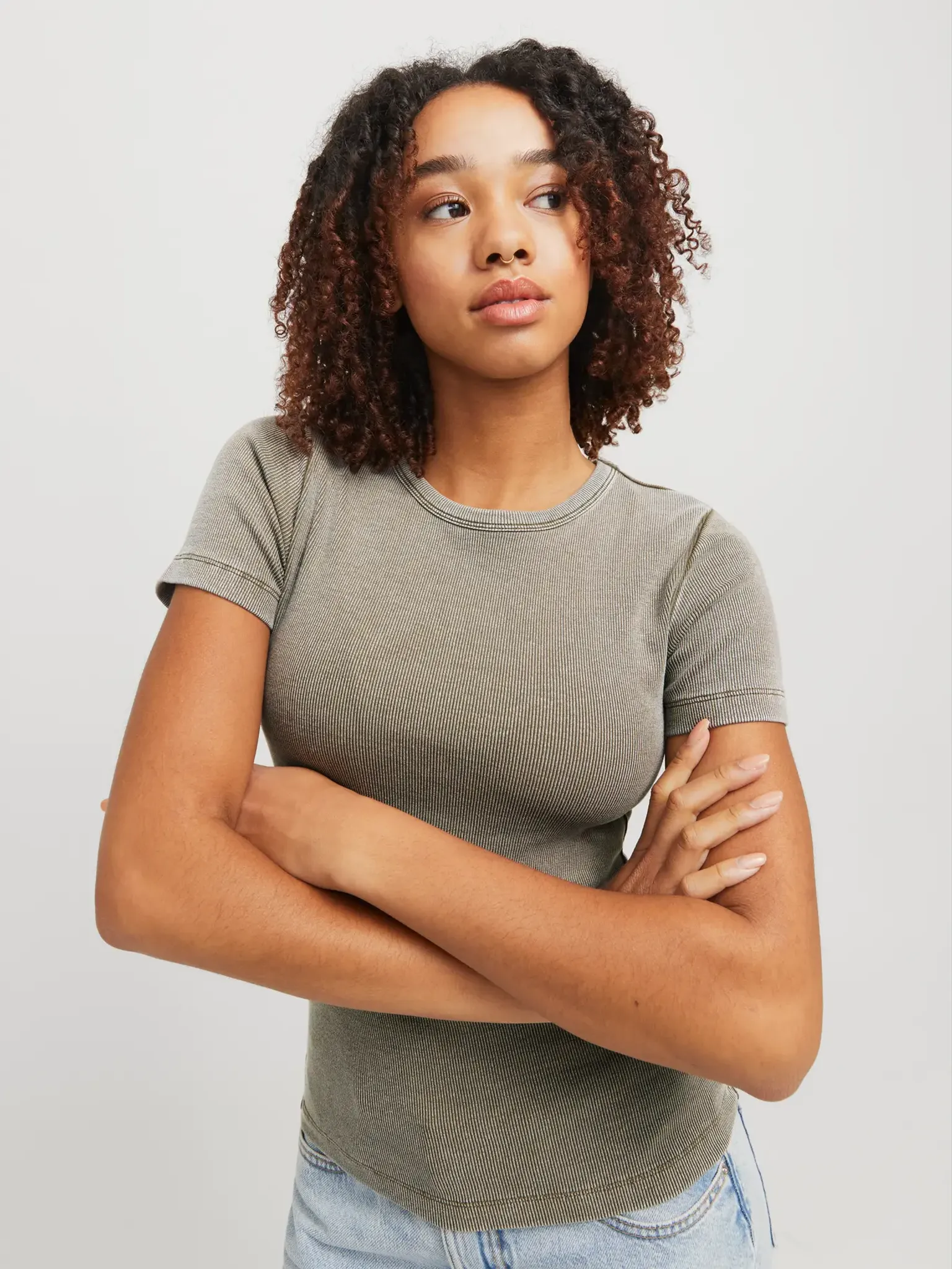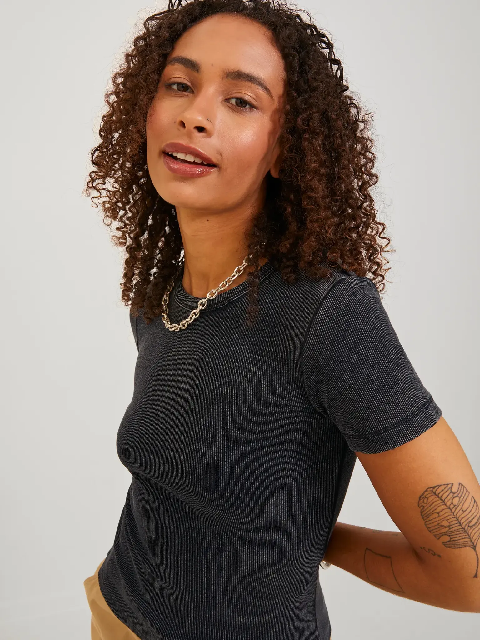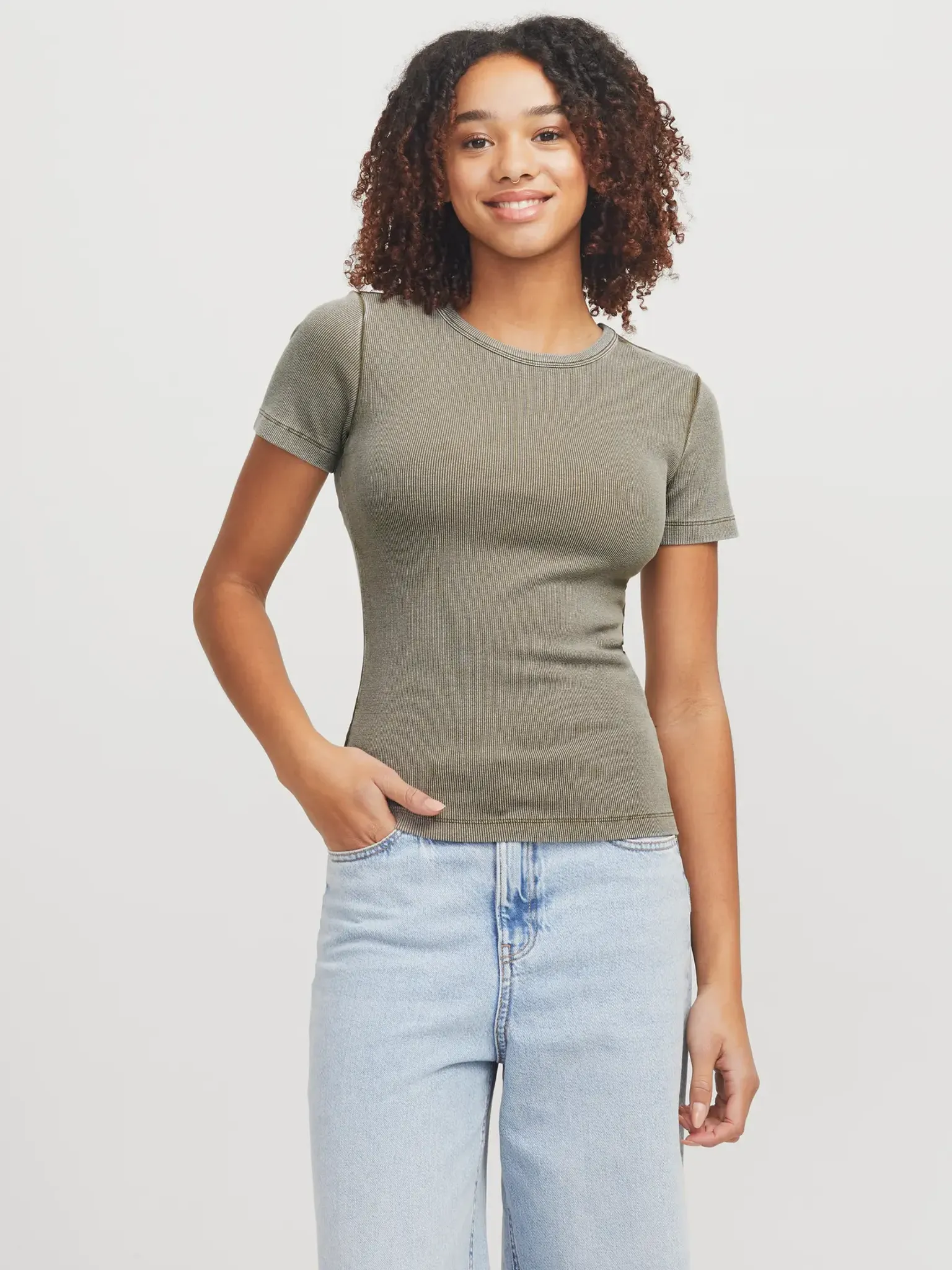 Denna ribbade topp har en klassisk rund halsringning och korta ärmar, vilket ger en tidlös och stilren look. Den är designad för att passa perfekt och ge en skön känsla vid användning.