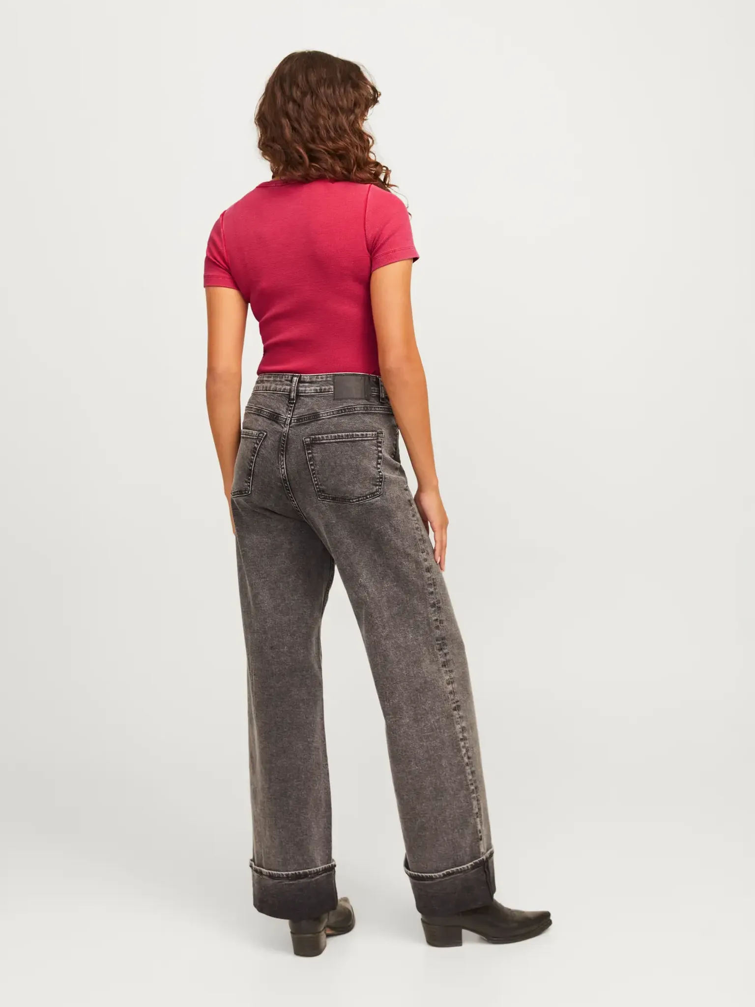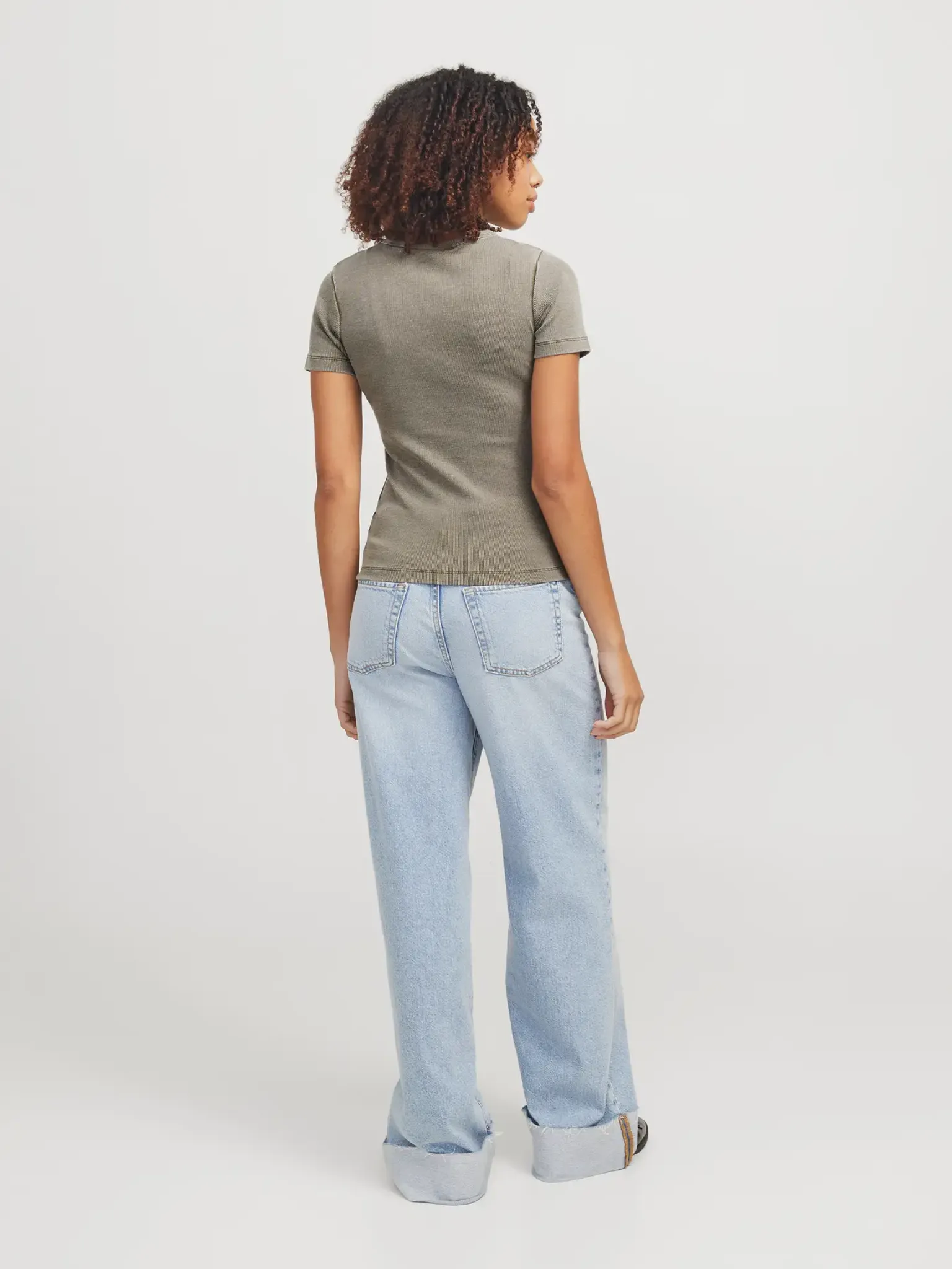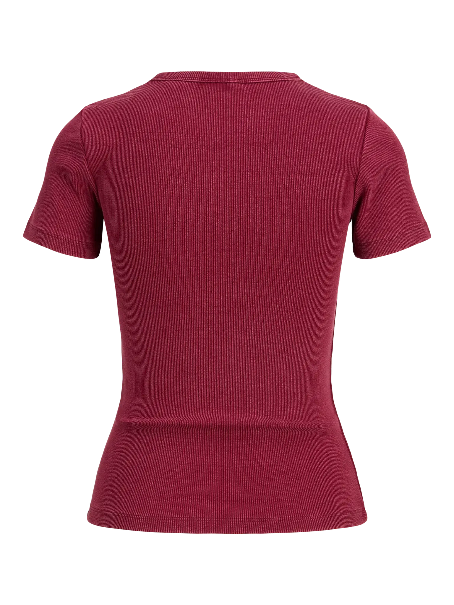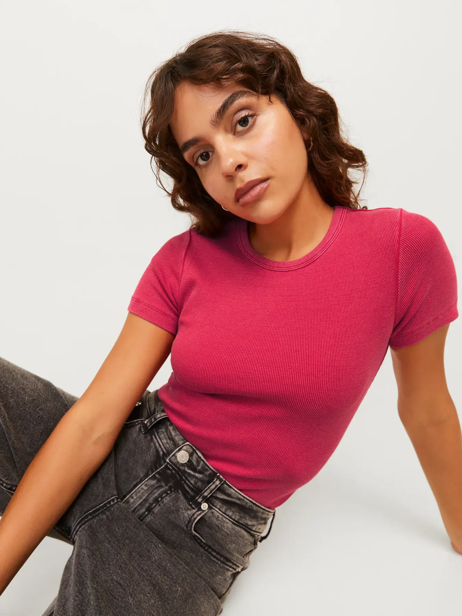 Denna ribbade topp har en klassisk rund halsringning och korta ärmar, vilket ger en tidlös och stilren look. Den är designad för att passa perfekt och ge en skön känsla vid användning.