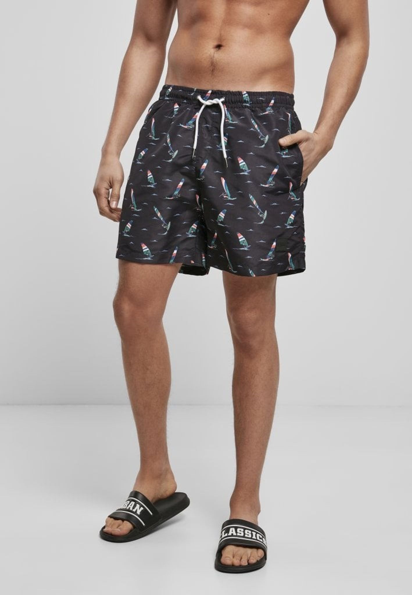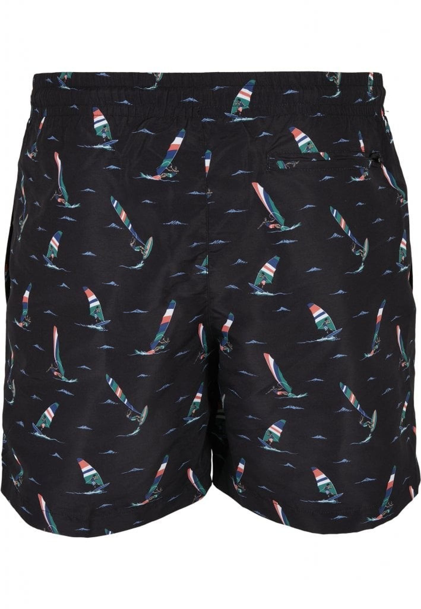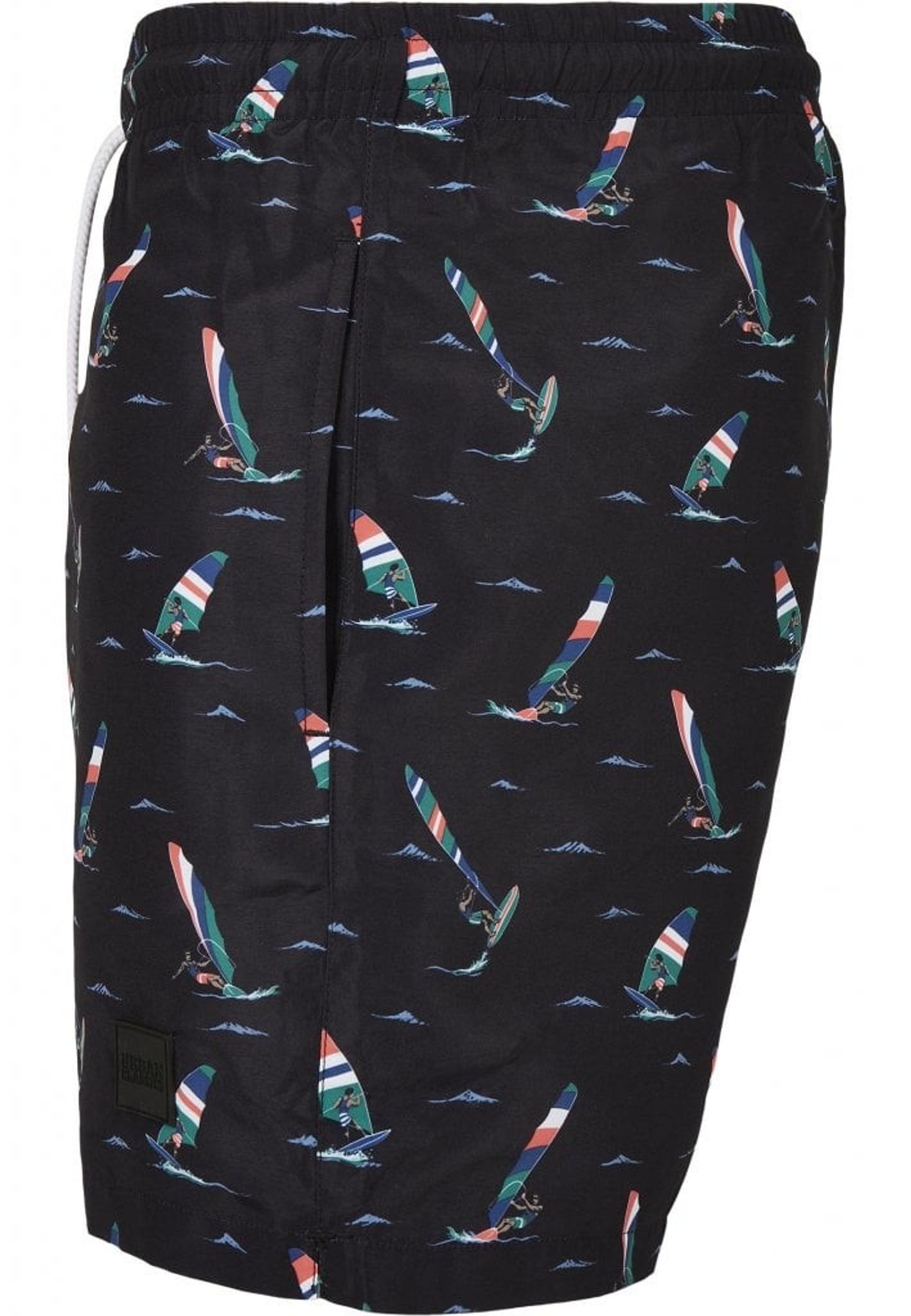 A pair of delicious swimming shorts with windsurfers flying forward on the waves.