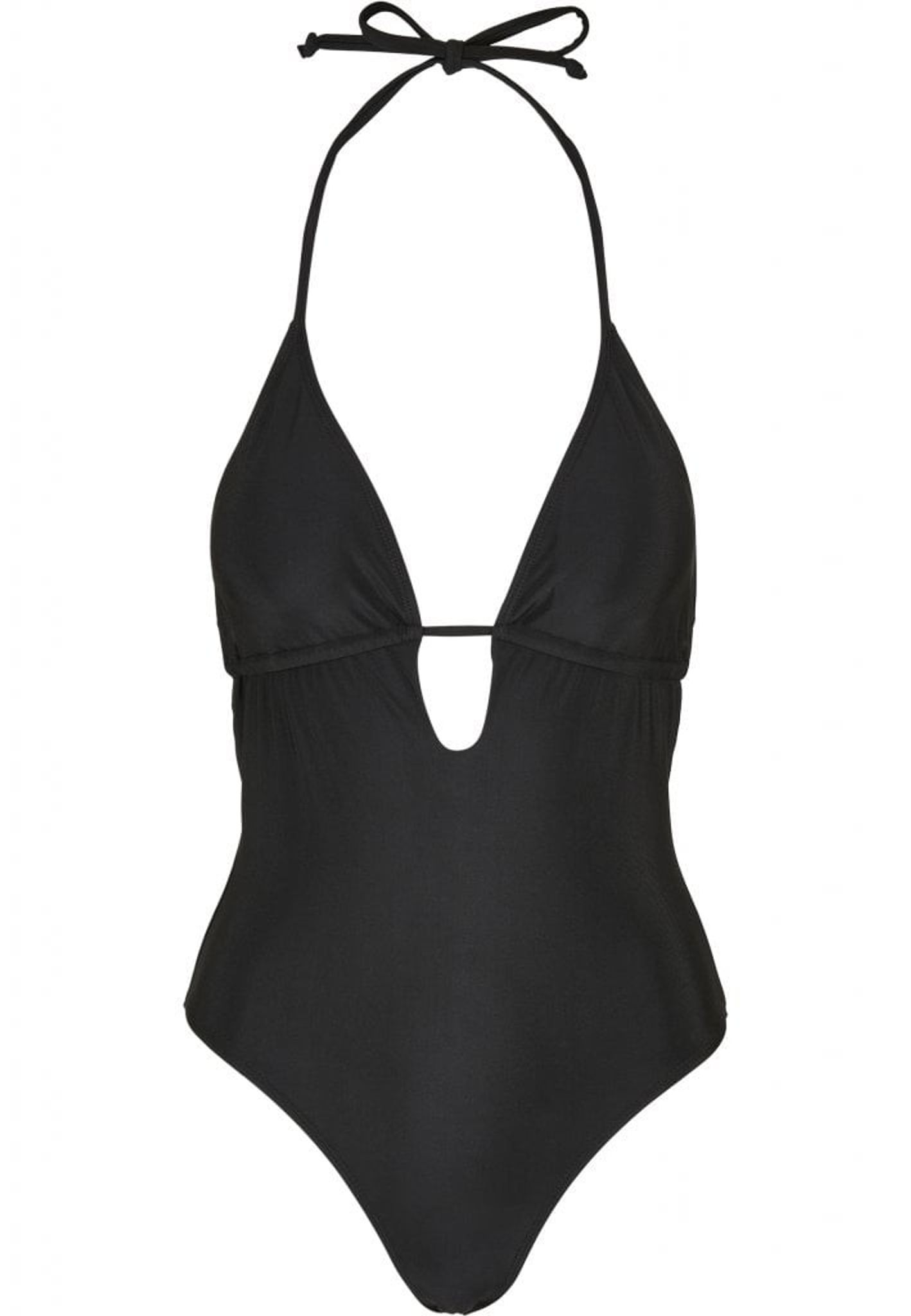 The swimsuit has a narrow and deep neckline at the front and back, which makes the swimsuit almost like a bikini.