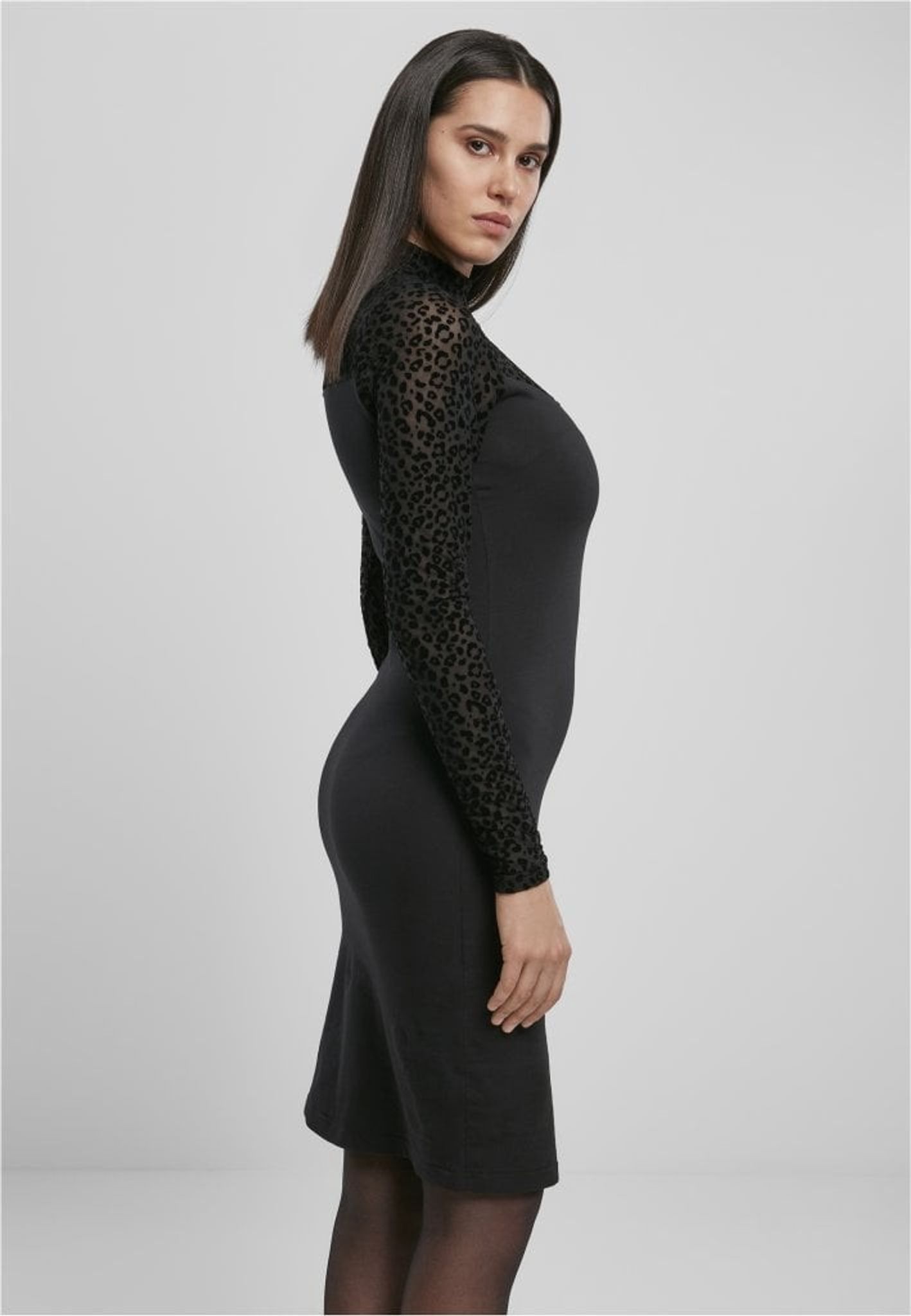 A black long-sleeved dress with lace arms and lace over the shoulders.