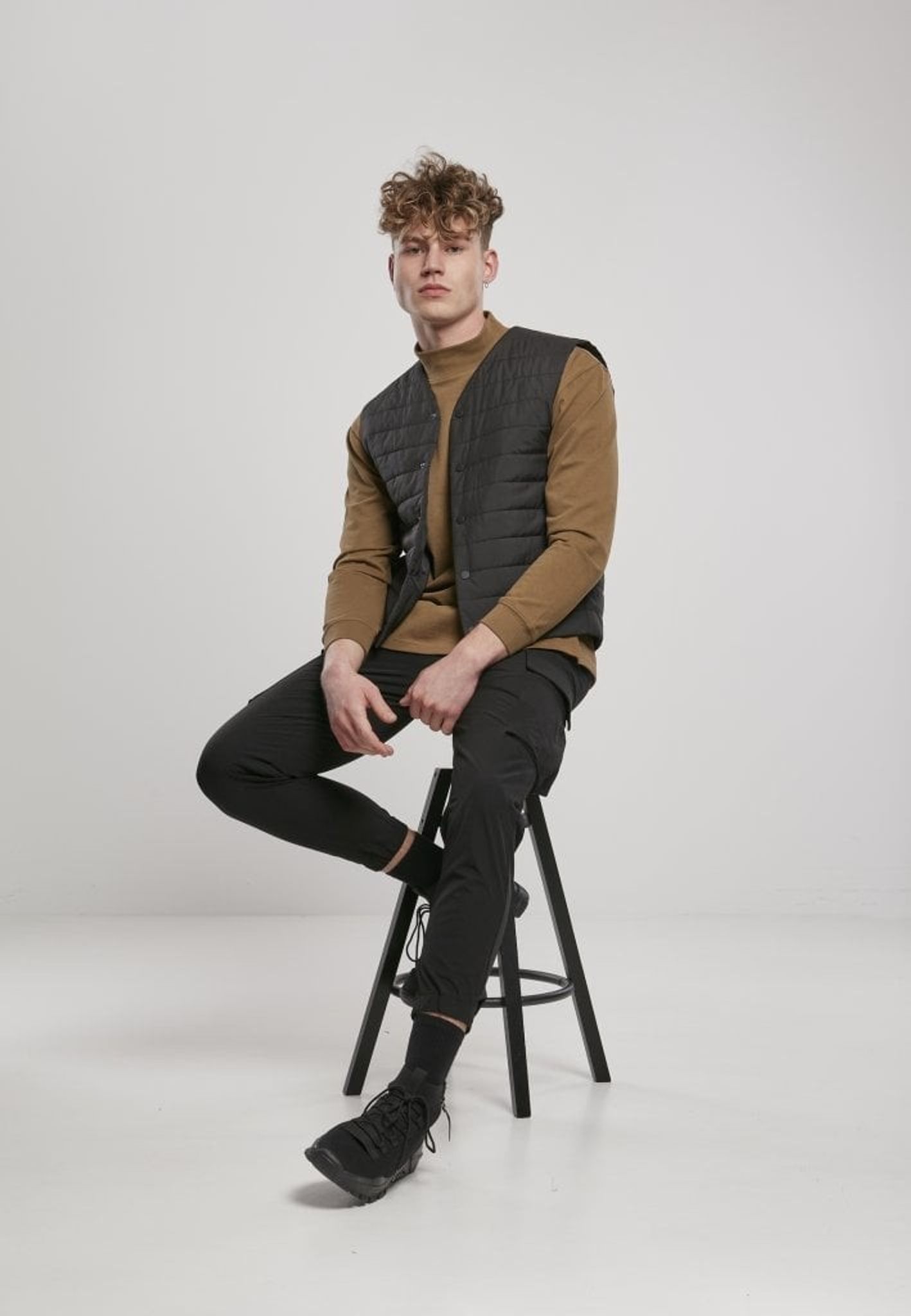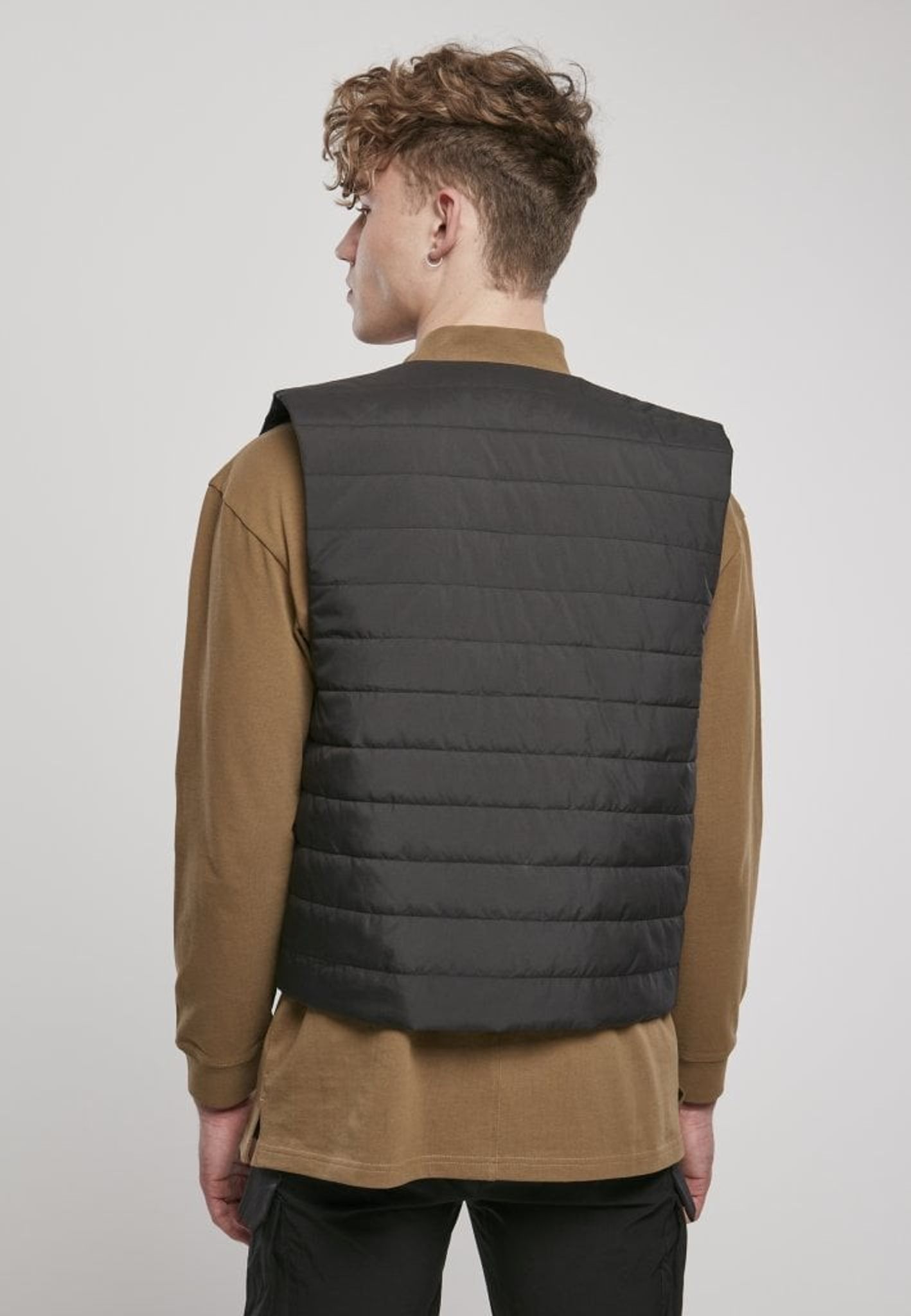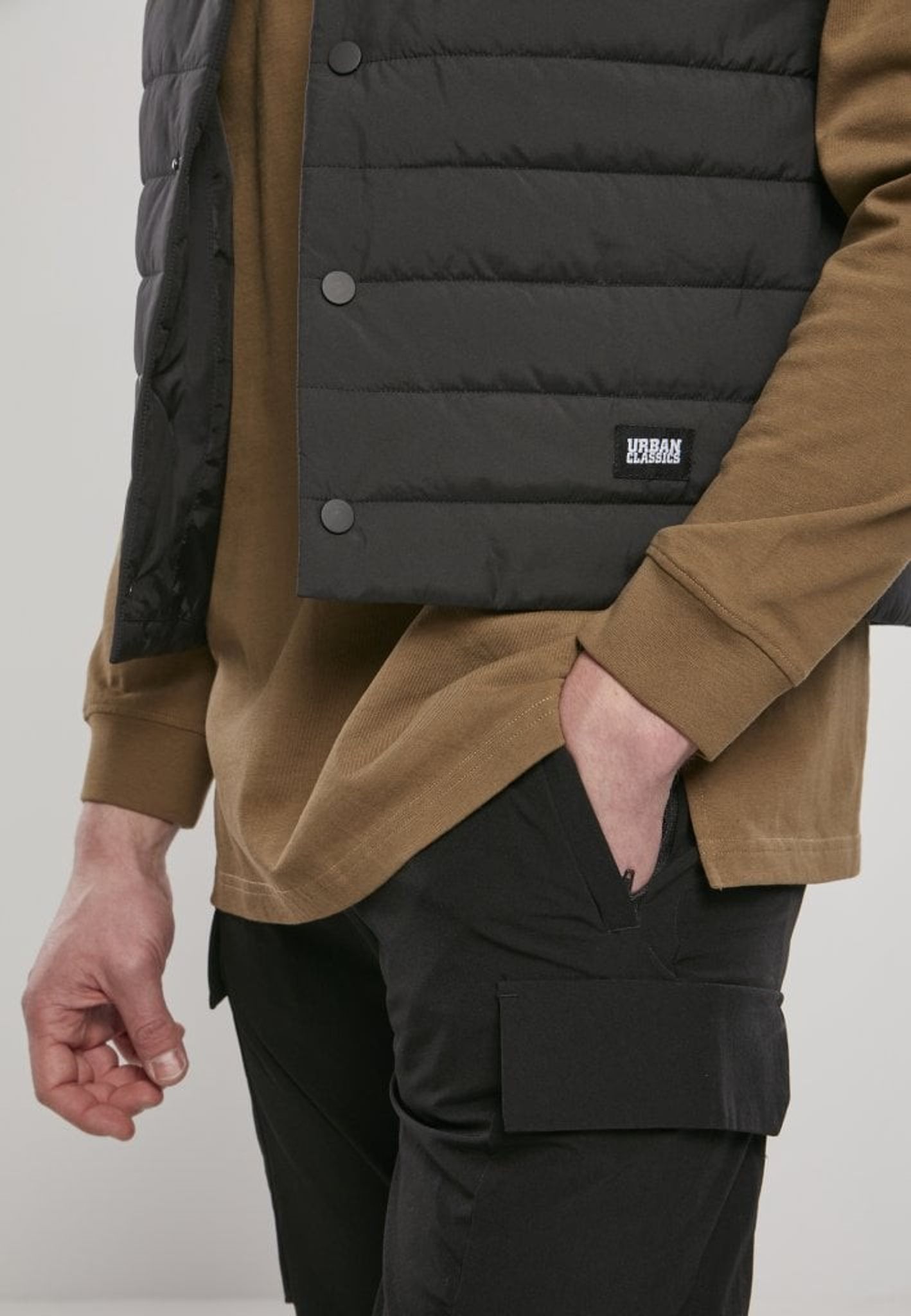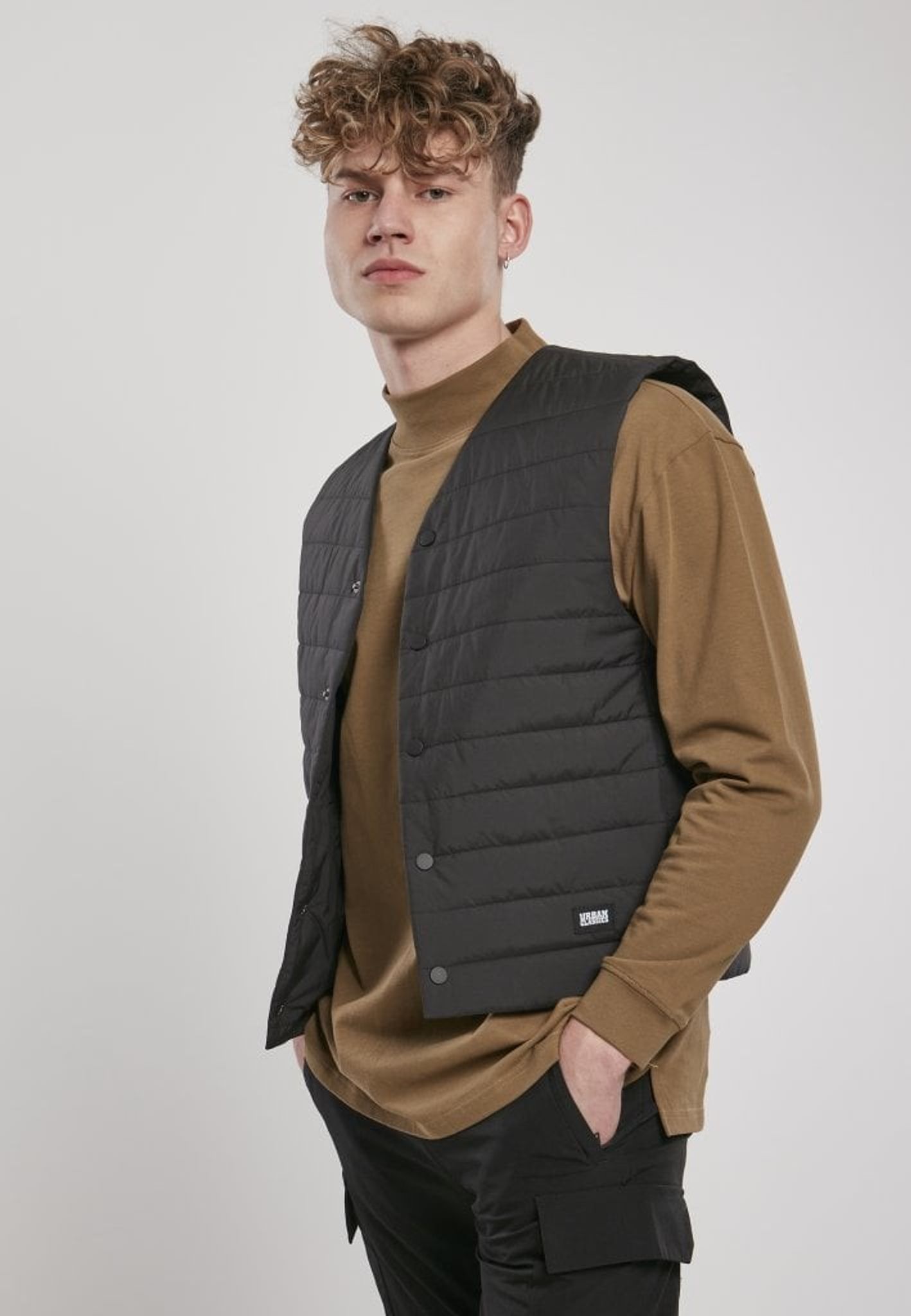 The vest has a v-neck around the neck and closes with push buttons at the front.